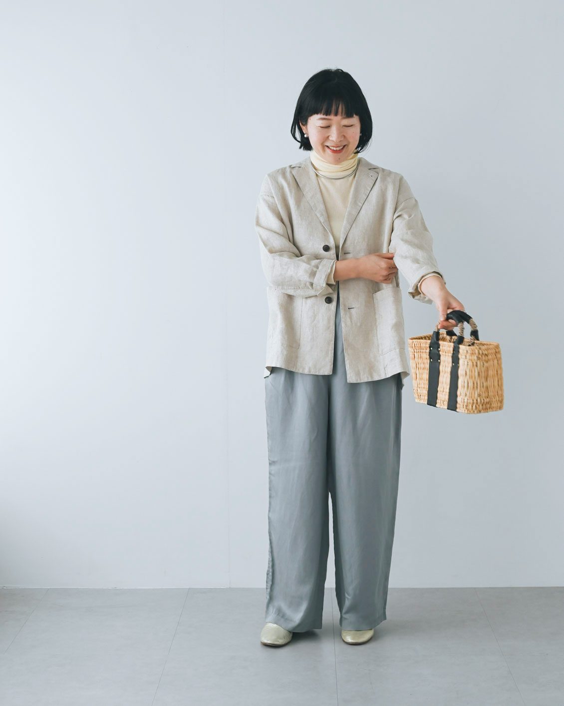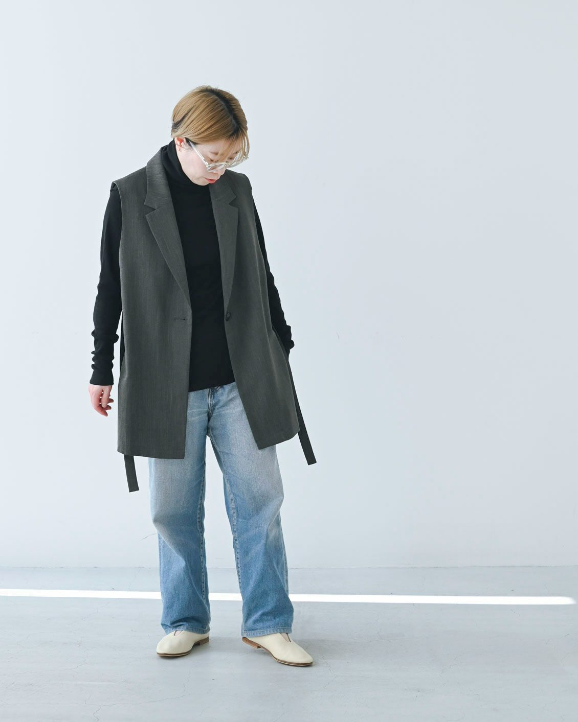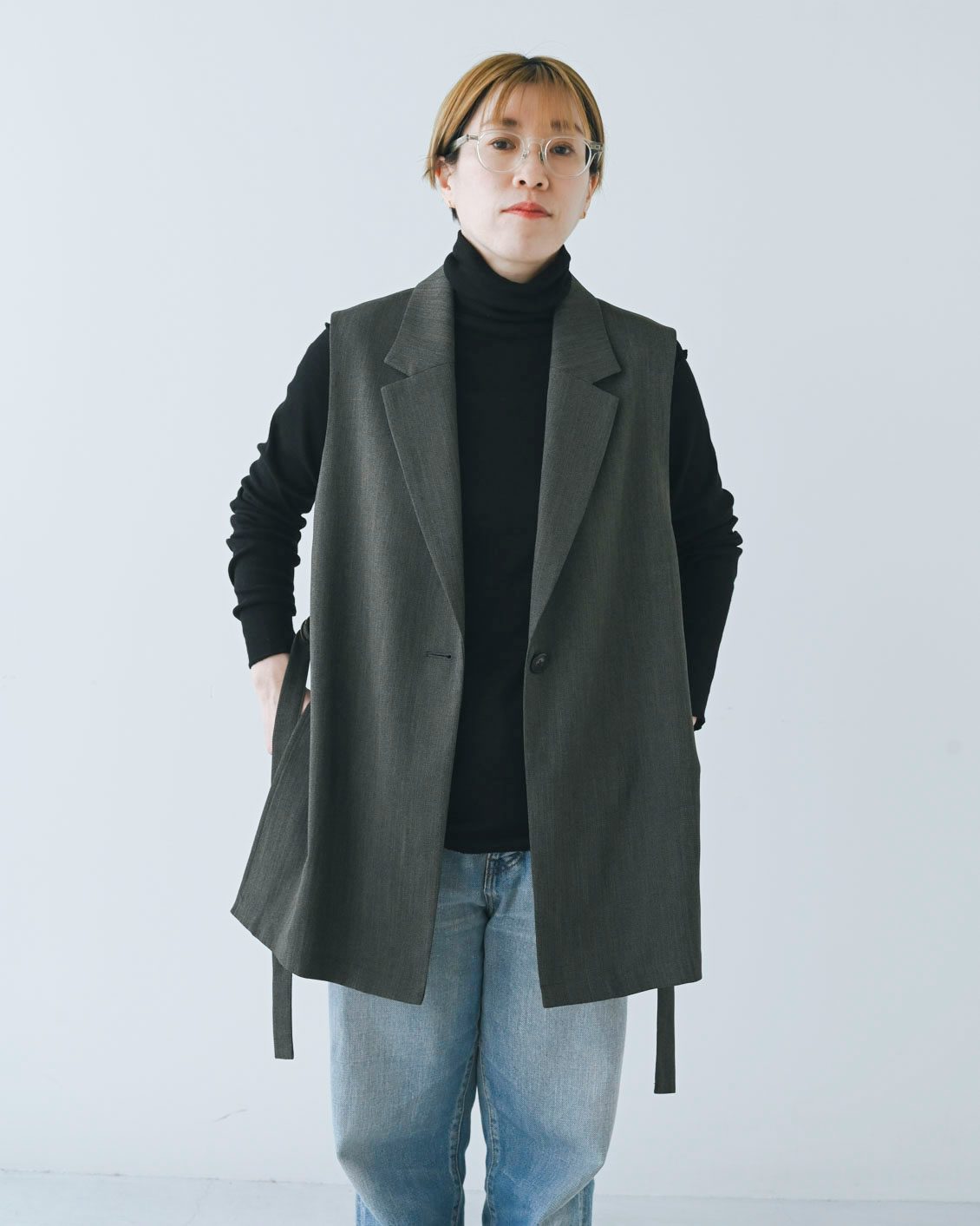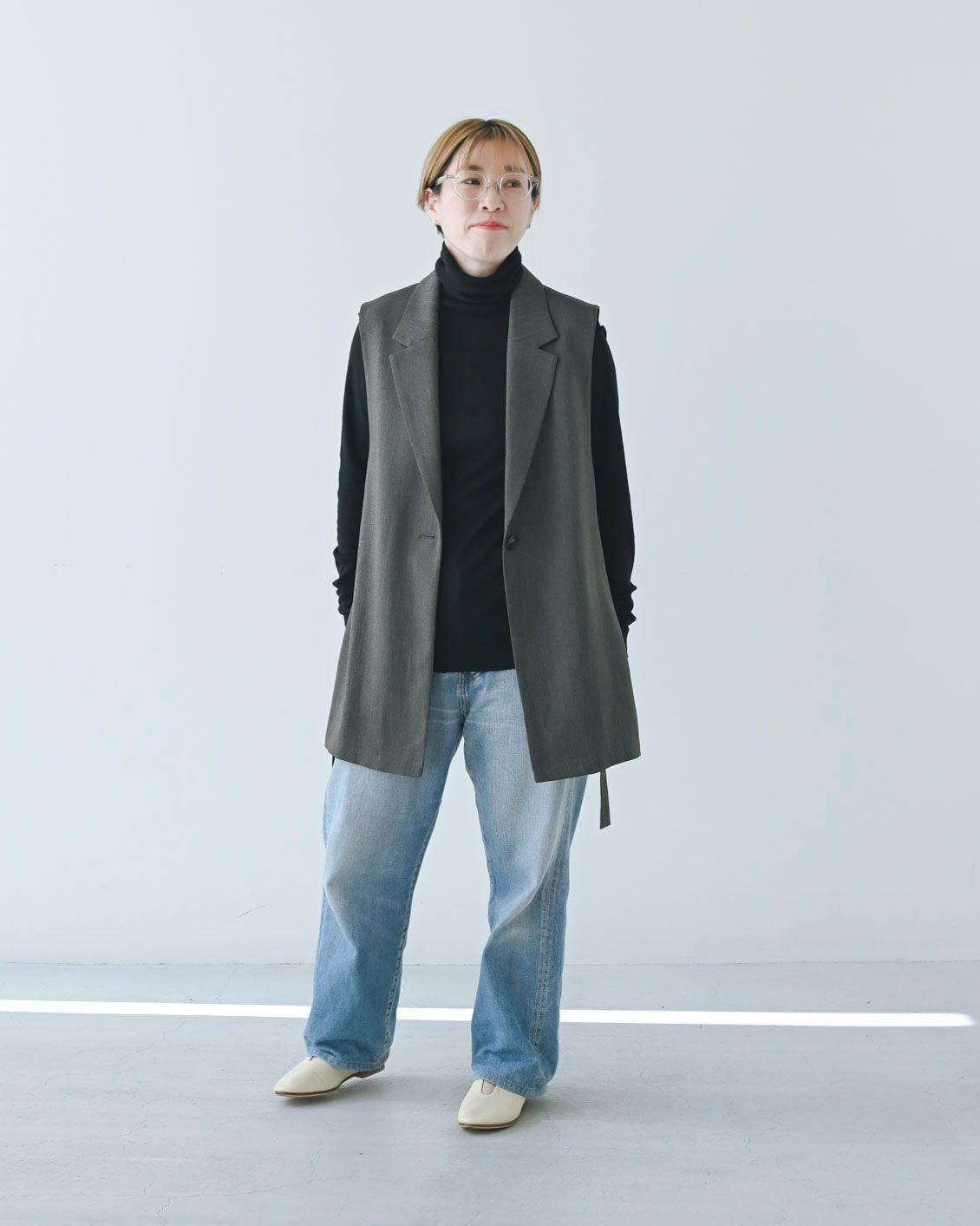 「普段はゆったりしたトップスを着ることが多いので、フィット感のあるトップスを合わせるならジレを羽織ってみようかと。