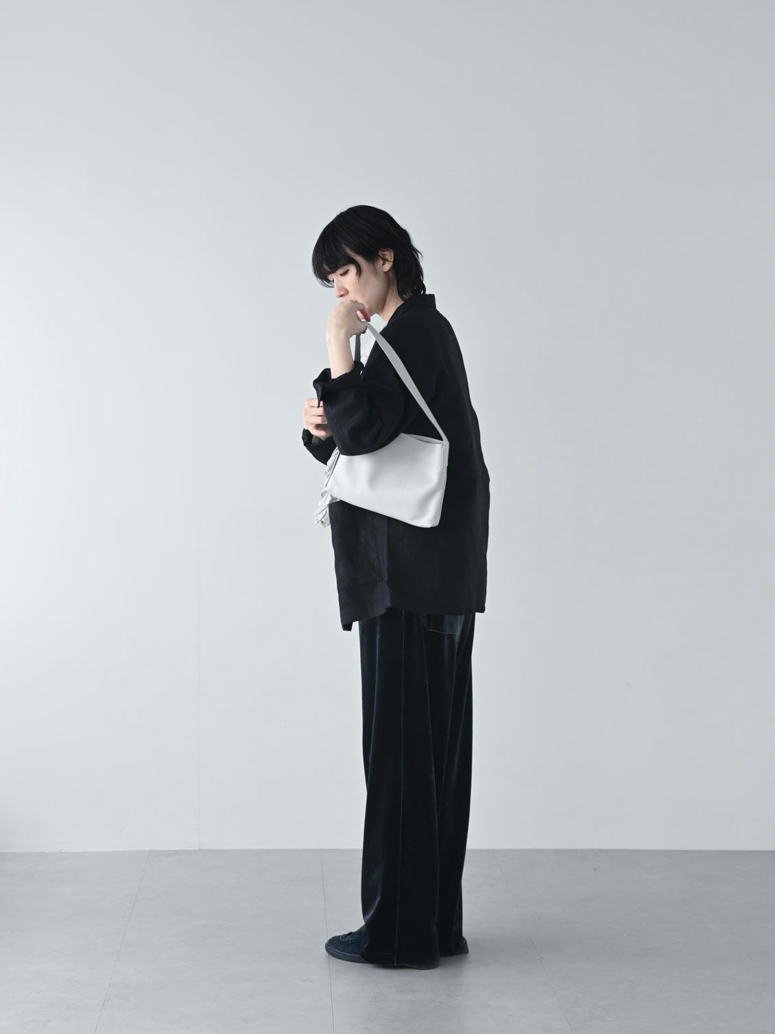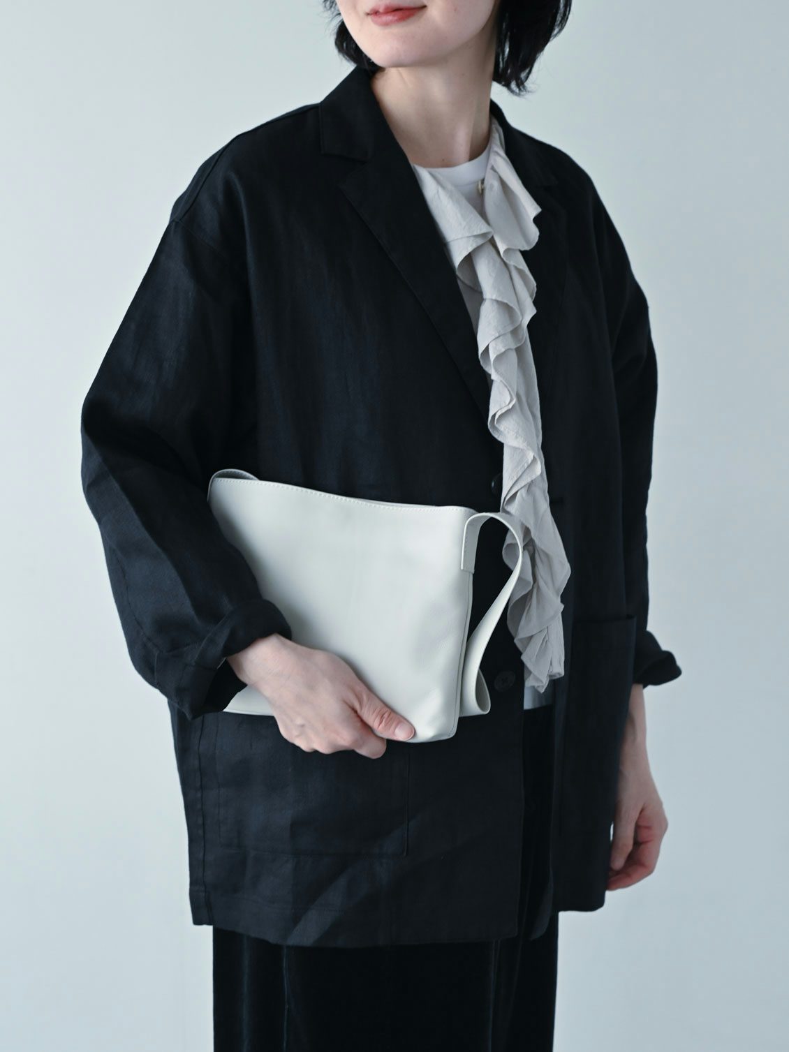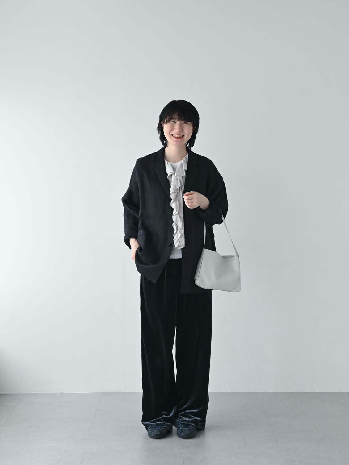 まず合わせてみたのは、いつもの普段着。ブラックのリネンジャケットにダークネイビーのベロアパンツというダークトーンに、昨年から愛用しているフリルブラウスを合わせて。