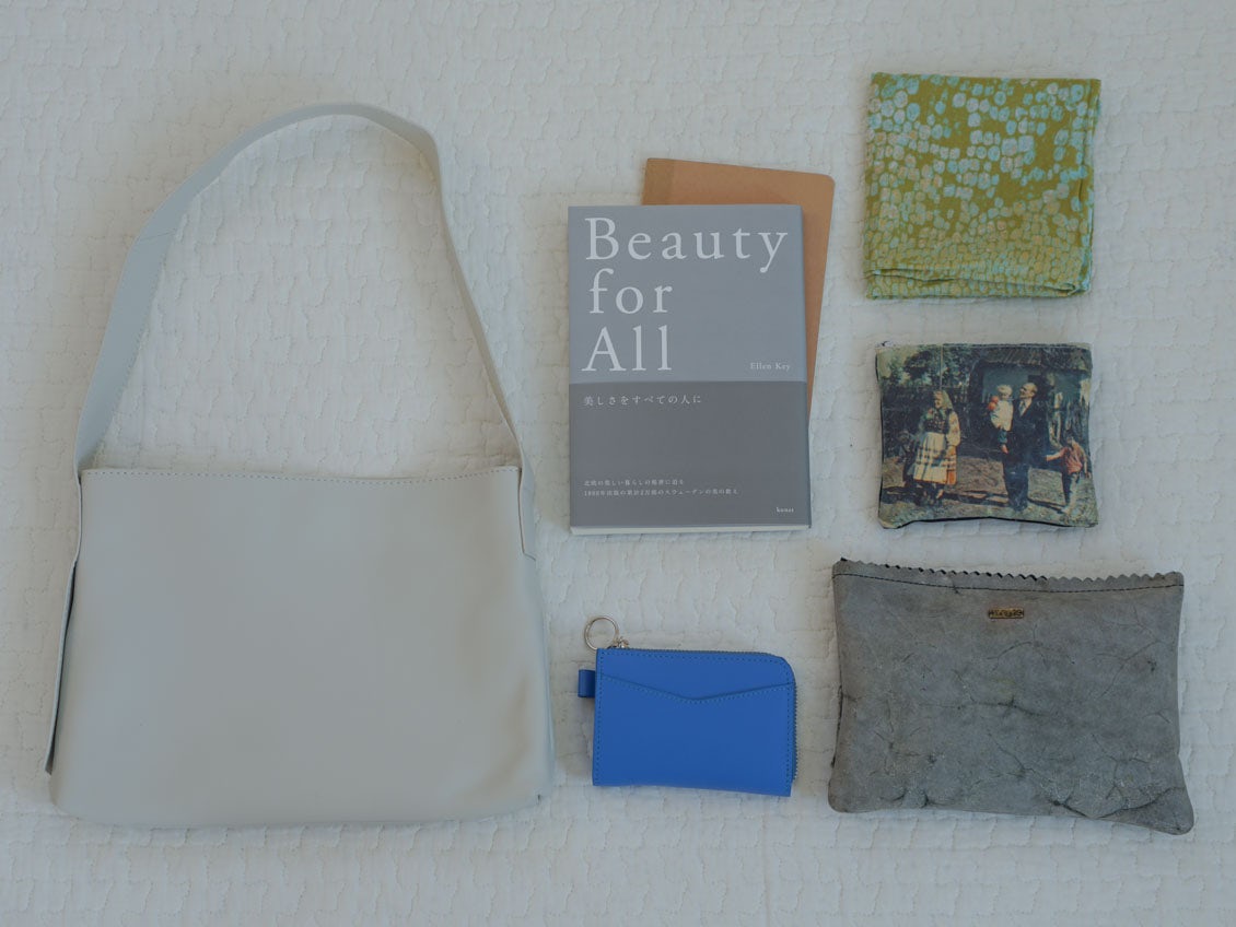 小ぶりに見えるので気になっていた容量も、休日のお出かけ程度なら全く問題なく大満足。お財布に大小のポーチ、スマホが入れられる内ポケットもあり、個人的に出かける際は隙間で読む本がないとそわそわするのですが、単行本サイズも入れられます。