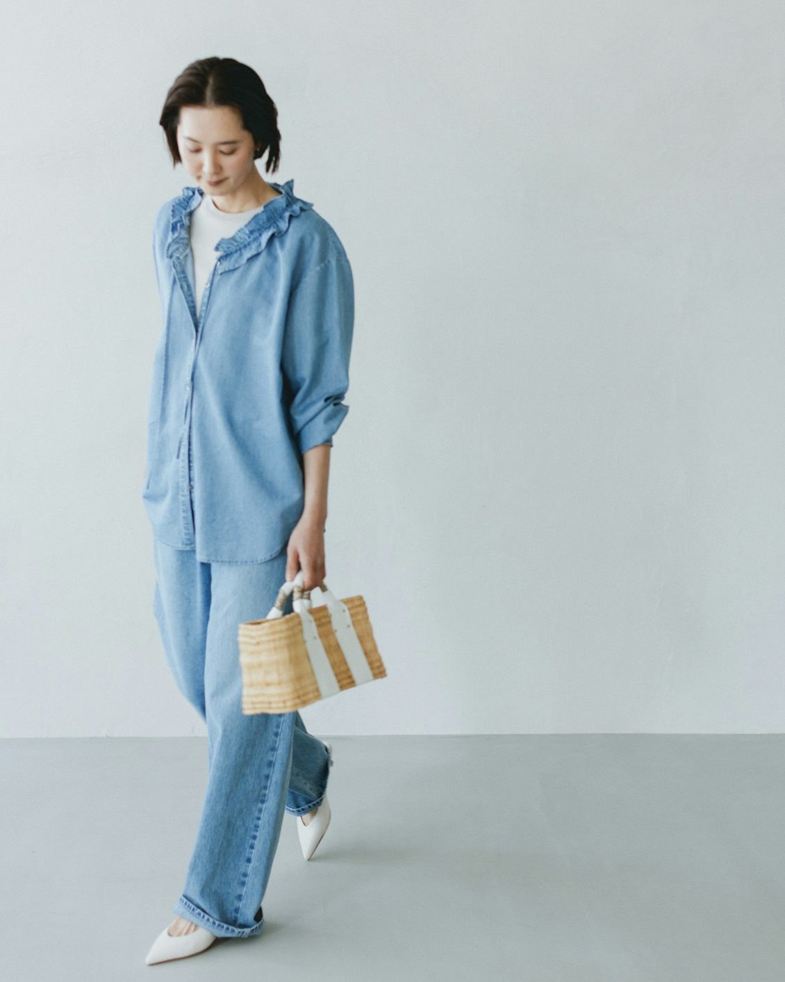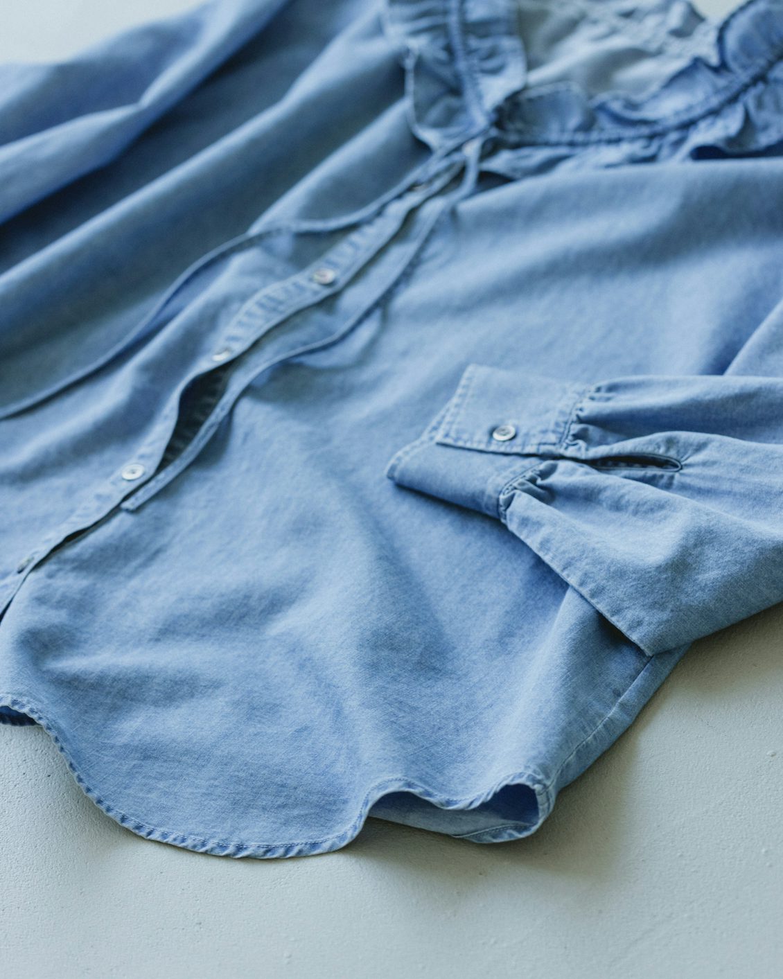 カジュアルなデニム素材に、さりげないフリルをあしらい、甘くなりすぎず品よく楽しめる一着。