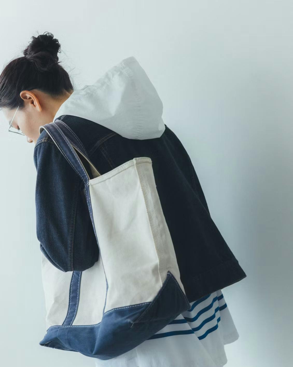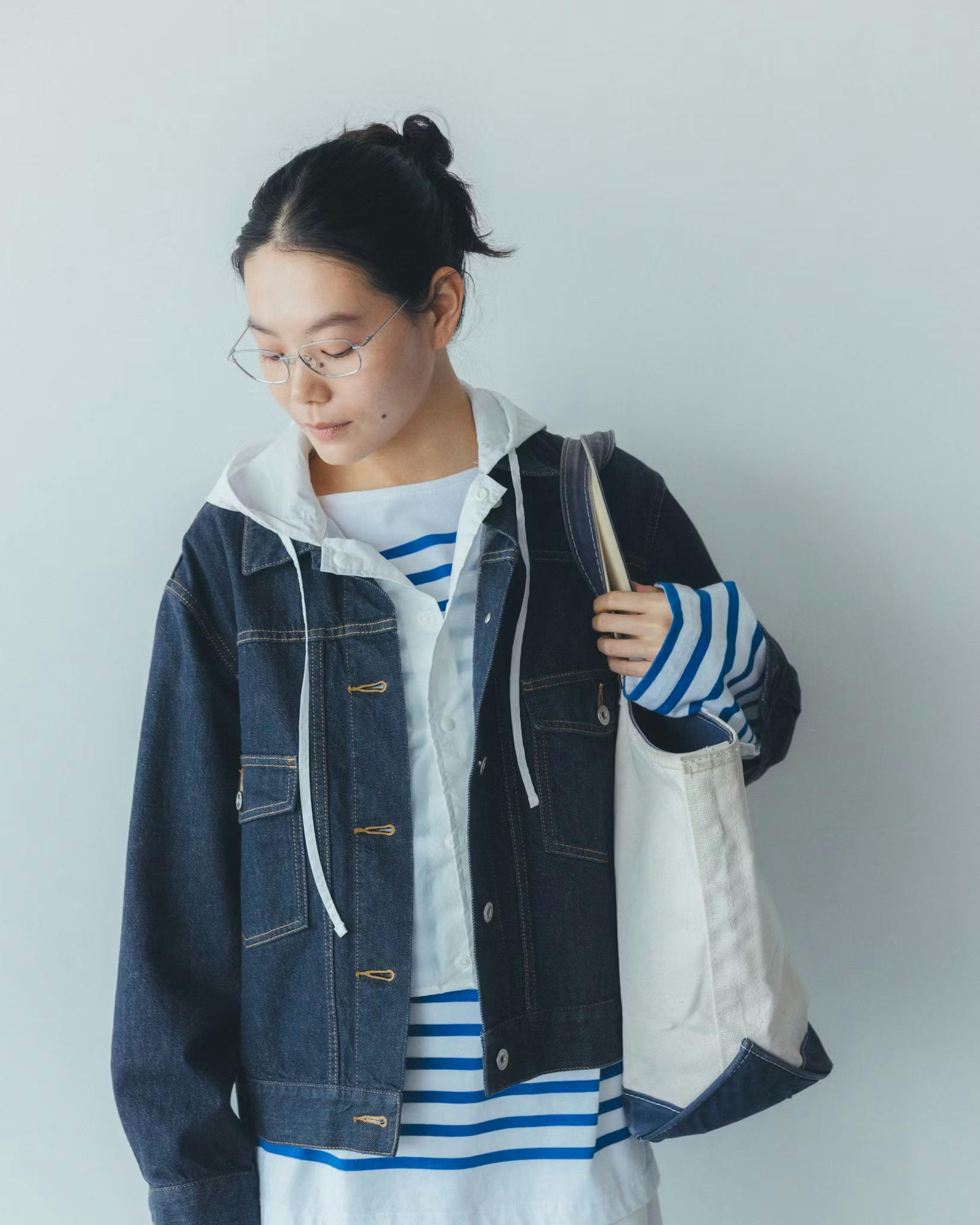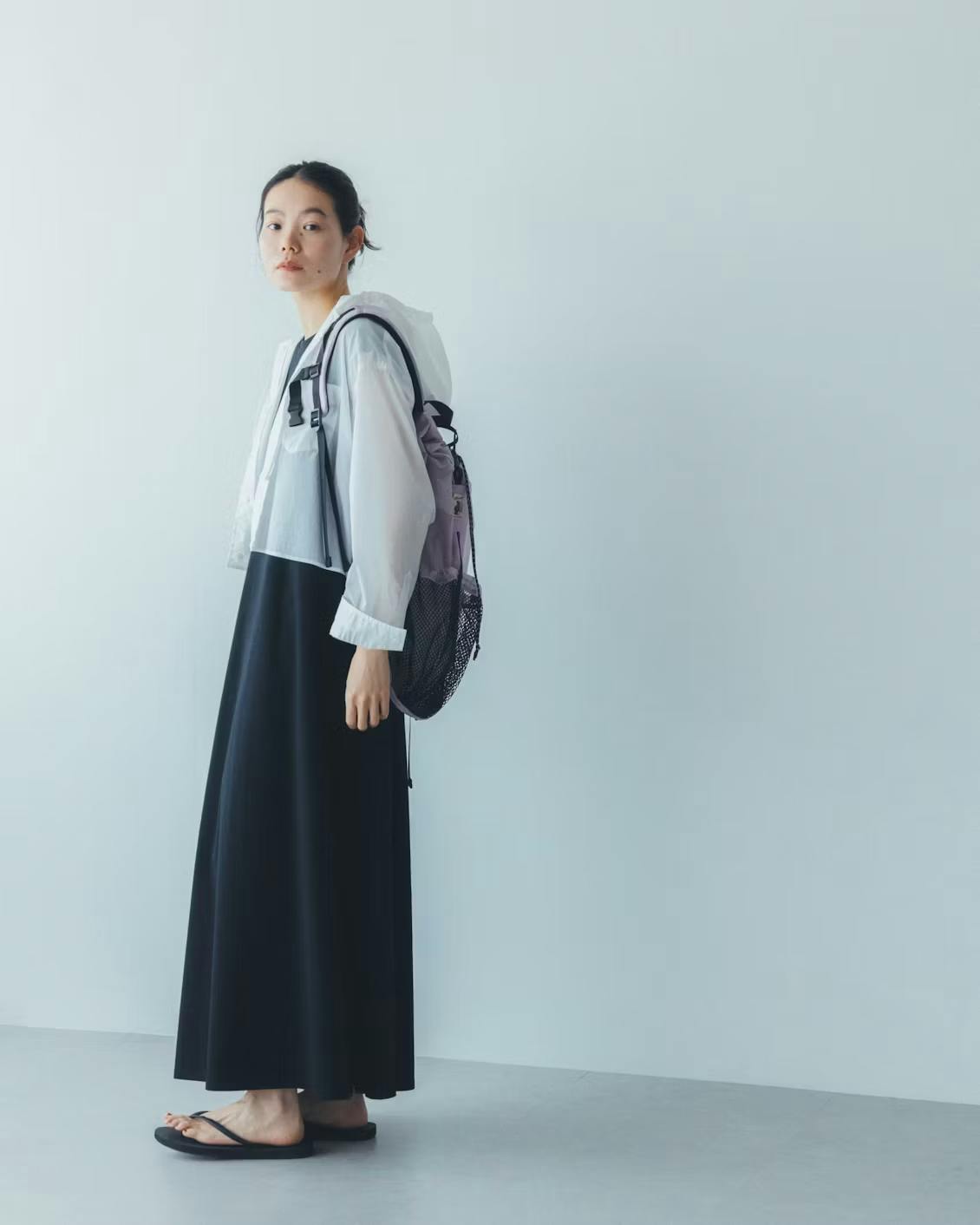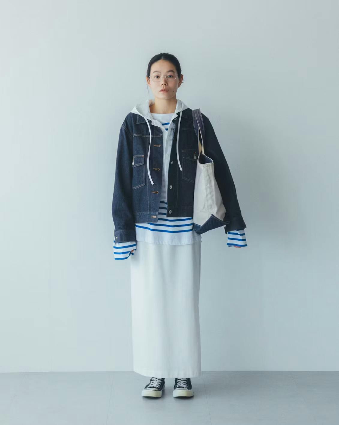 でもこのフード付きシャツを羽織ると、視線が自然と上に上がるからか、コーデ全体のバランスがいつもよりすっきり。