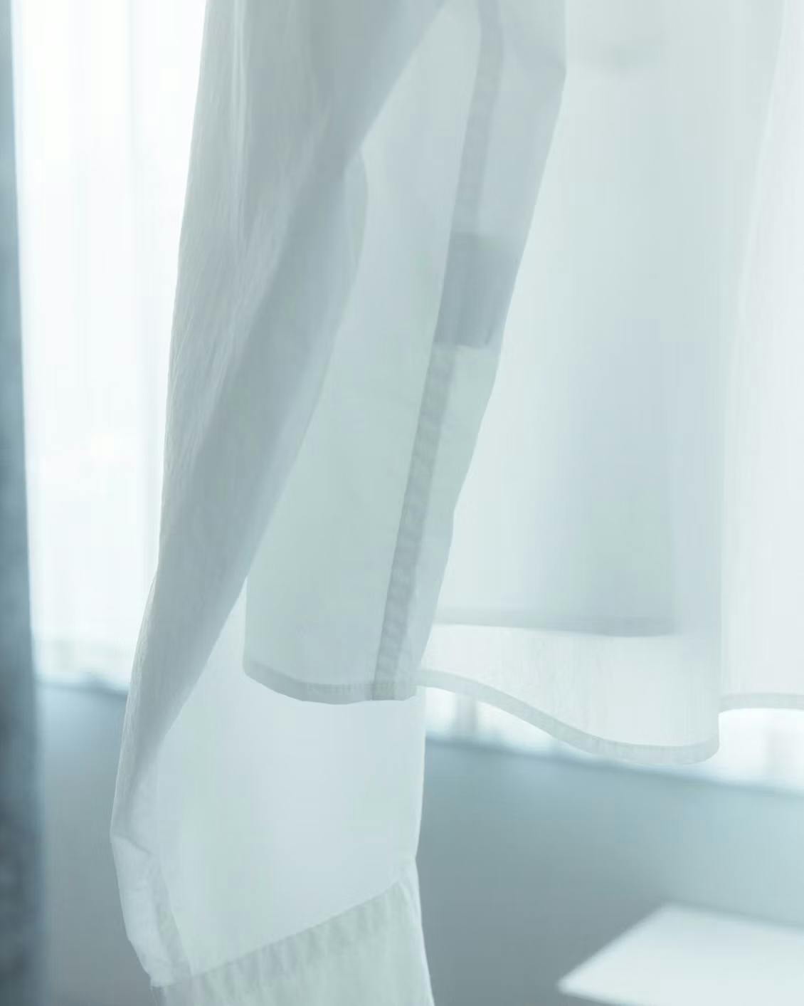 シャリっとした質感があるので、肌にまとわりつきにくく、暑い時期でも心地よく着られそうだなと感じました。