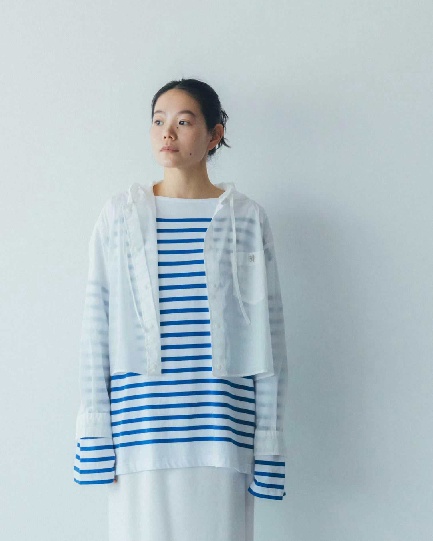 ほんのり透けるシアーな素材感も相まって、Tシャツやボーダーを中に合わせると、コーディネートにさりげない奥行きが生まれます。