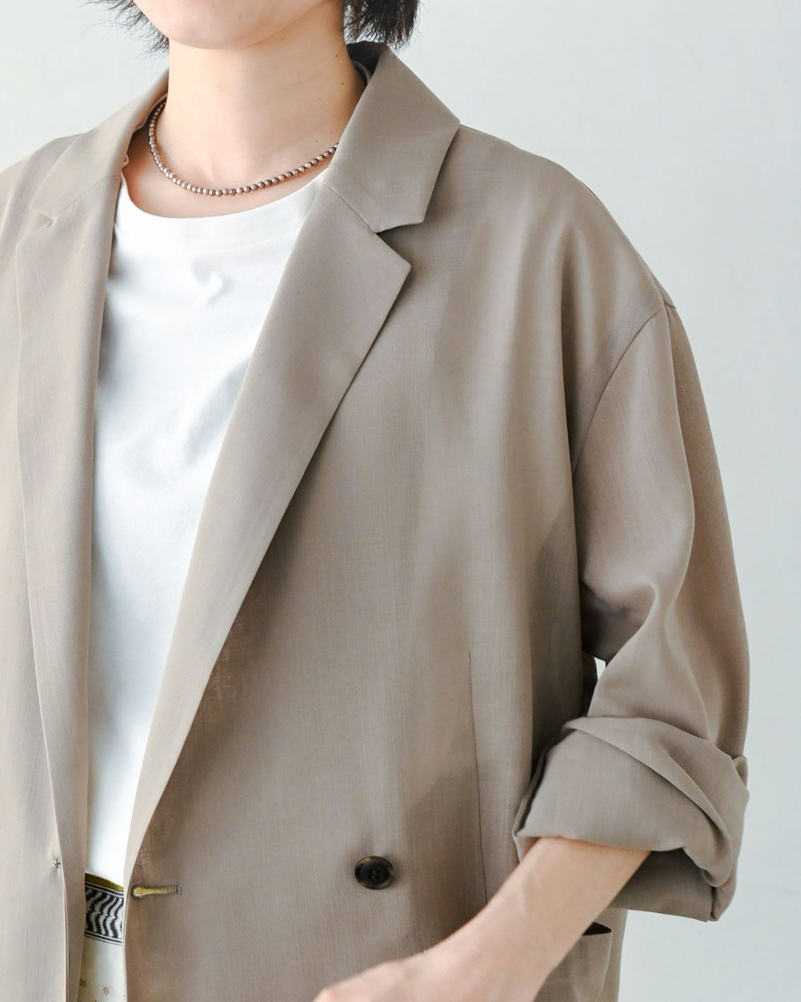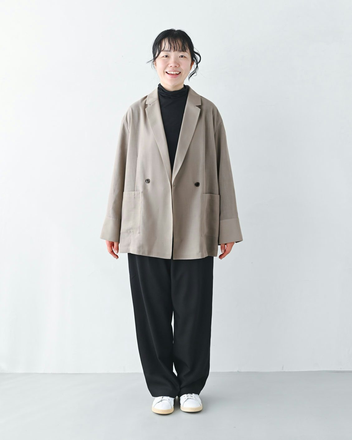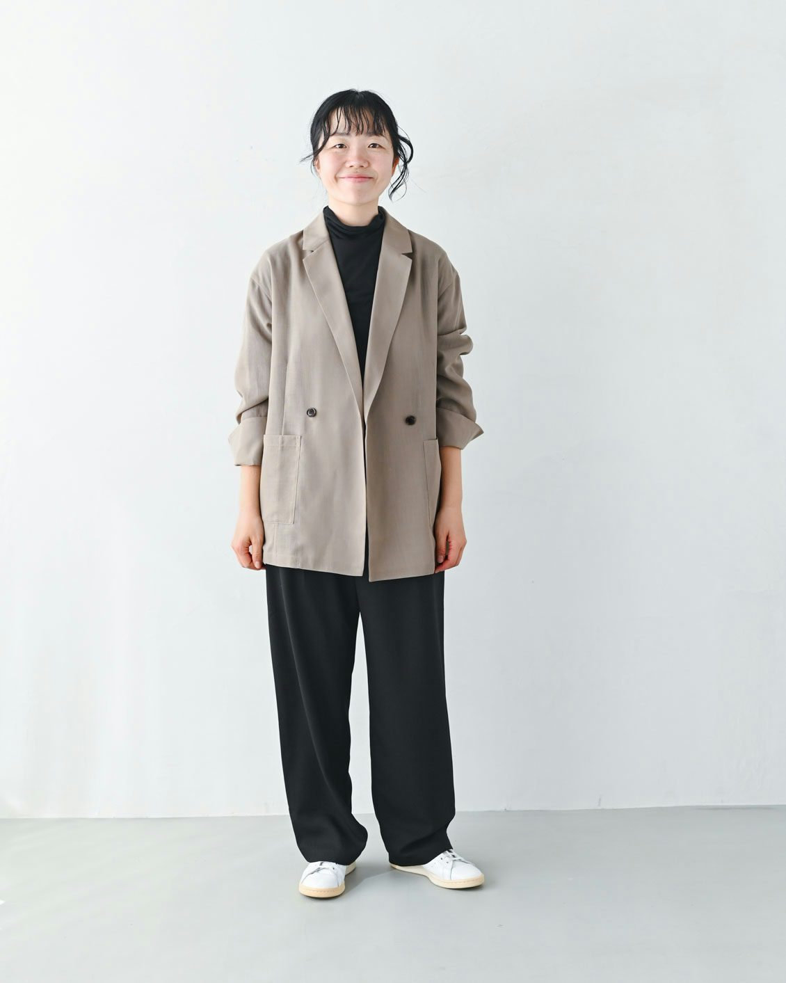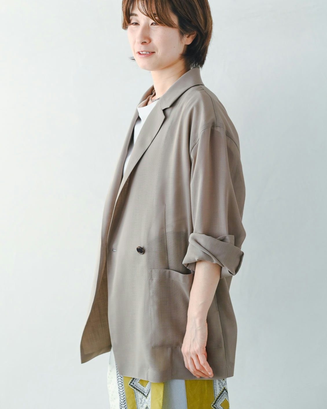 シングルボタンだと学生服のように見えやすくなるところを、ダブルにすることで『大人のおしゃれ着』の雰囲気を纏えるようにしました。