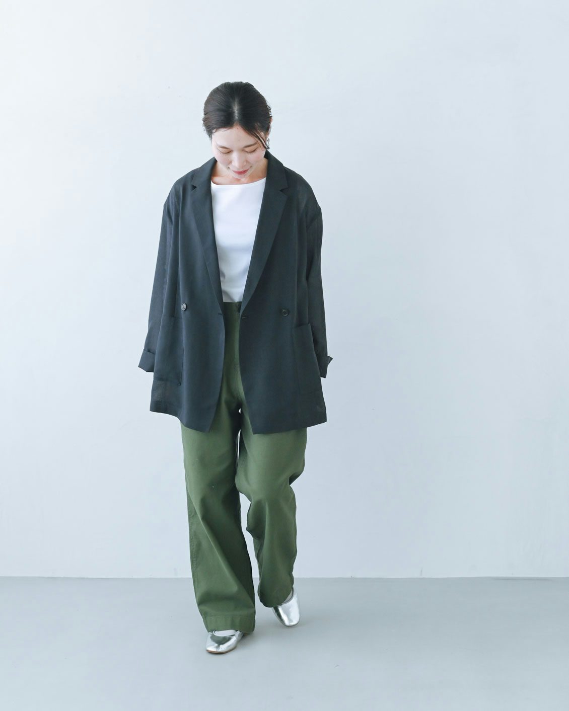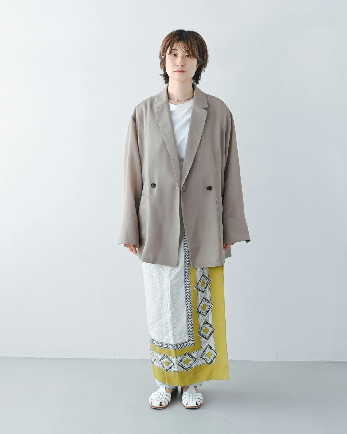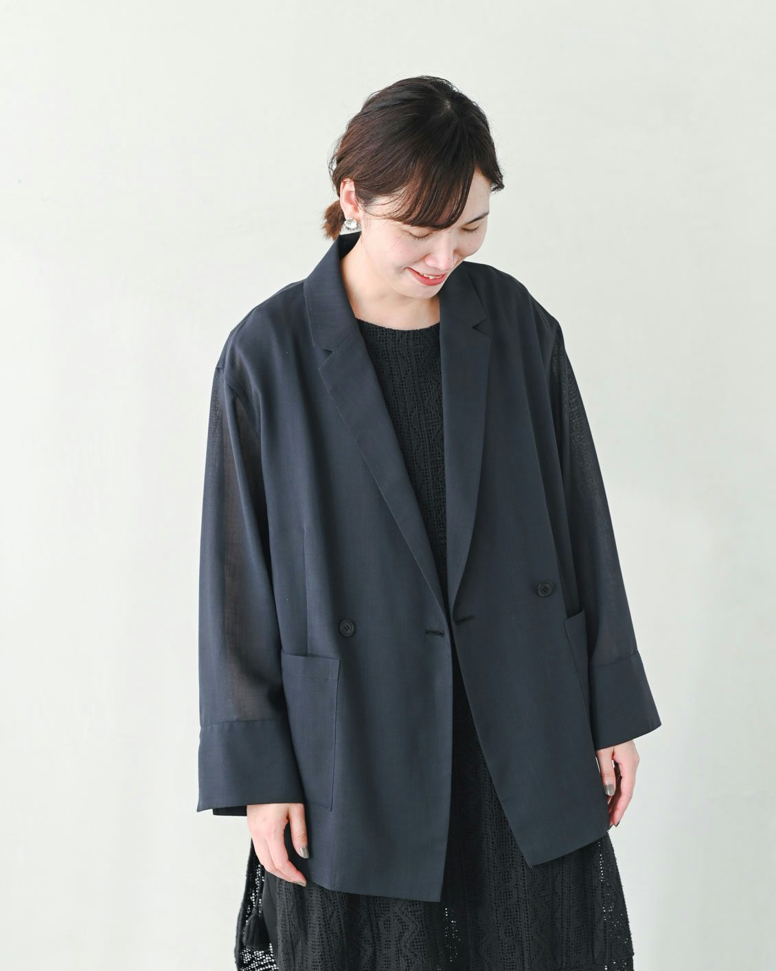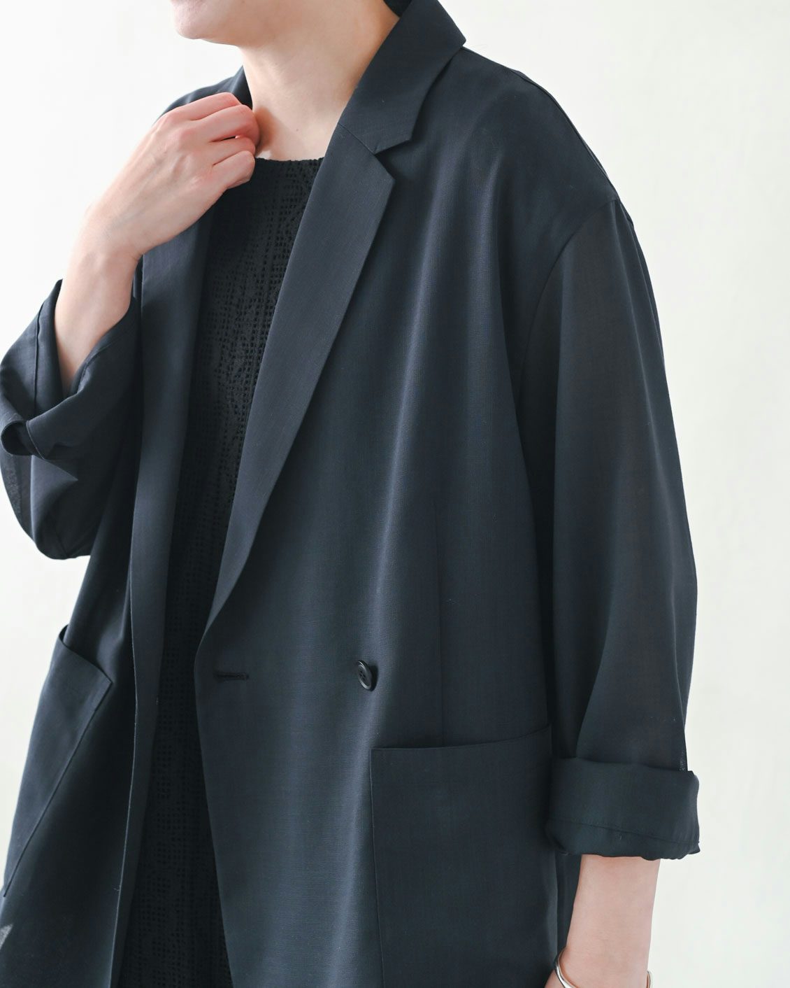 シングルボタンだと学生服のように見えやすくなるところを、ダブルにすることで『大人のおしゃれ着』の雰囲気を纏えるようにしました。