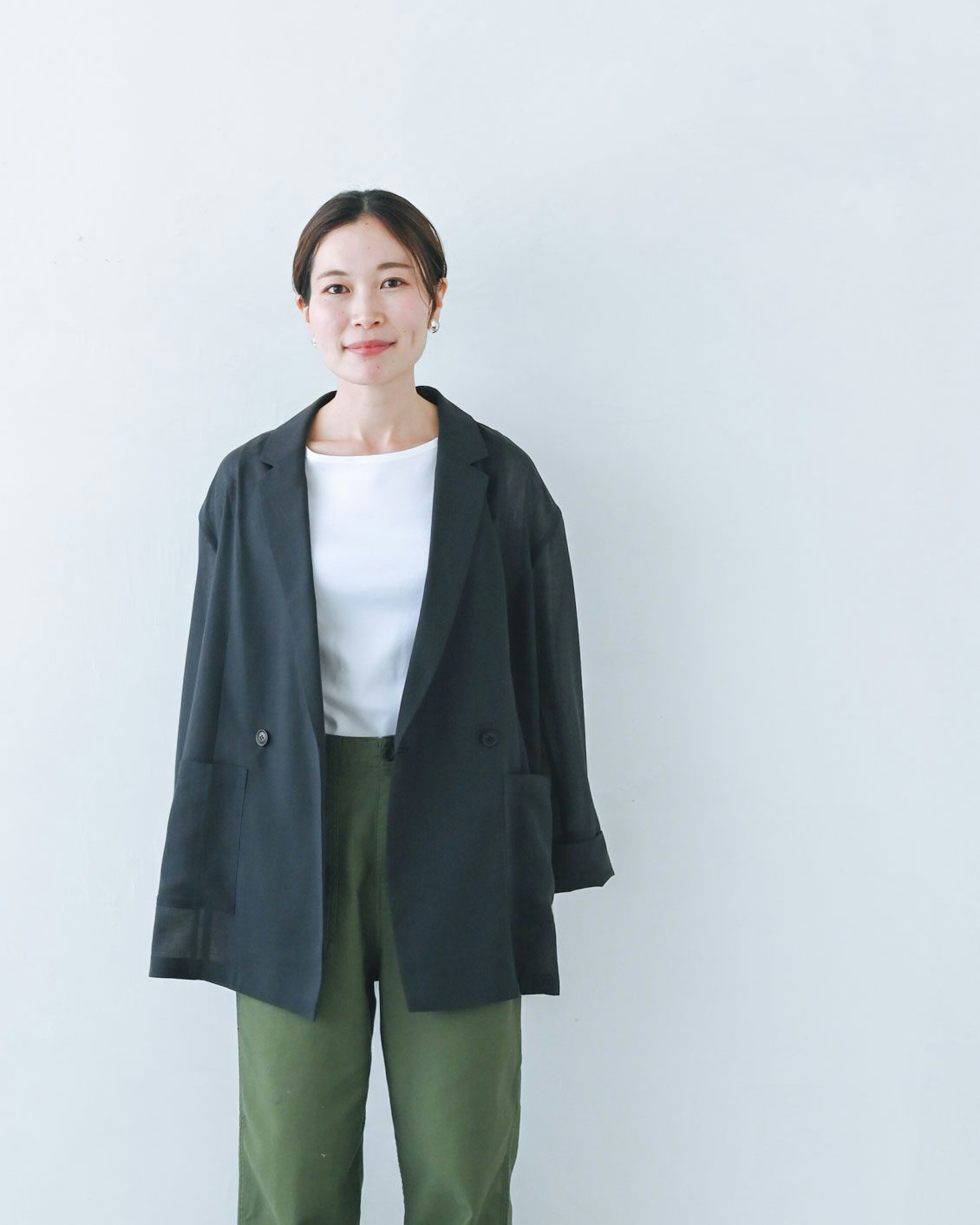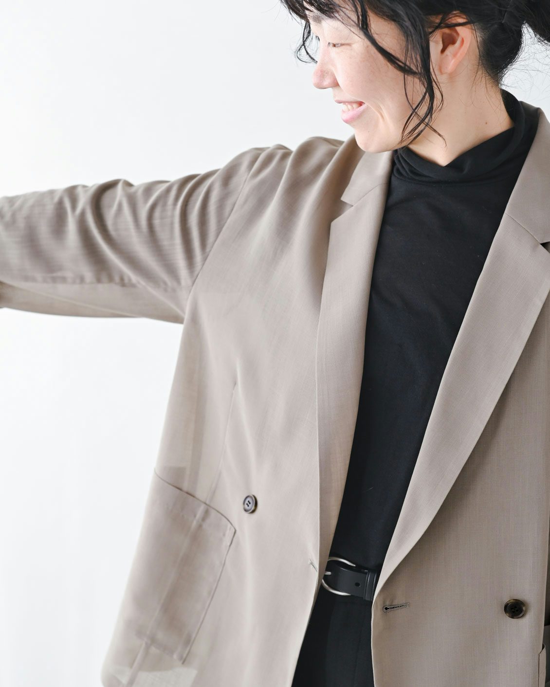 肩パッドが入っていないので、肩のラインを選びにくく、肩幅の狭い方や、私のようななで肩の方にも着やすくなっています。シャツ感覚で着られるジャケットだと思います」