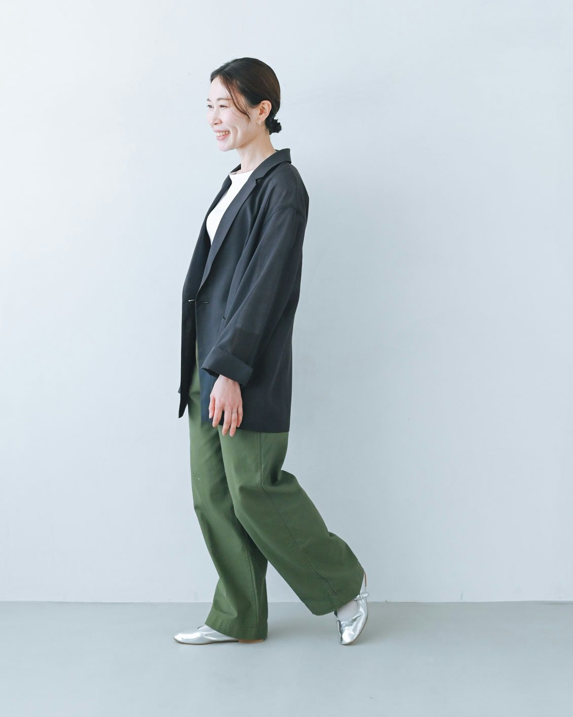 「襟は大きすぎず、小さすぎずの絶妙なバランス。マニッシュすぎないのに、きりっと見せてくれるので、カジュアルコーデに『きれいめ』の要素を足したい日にぴったりです。