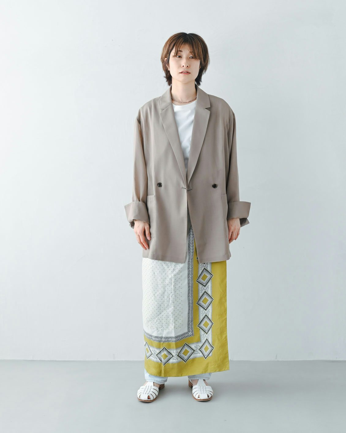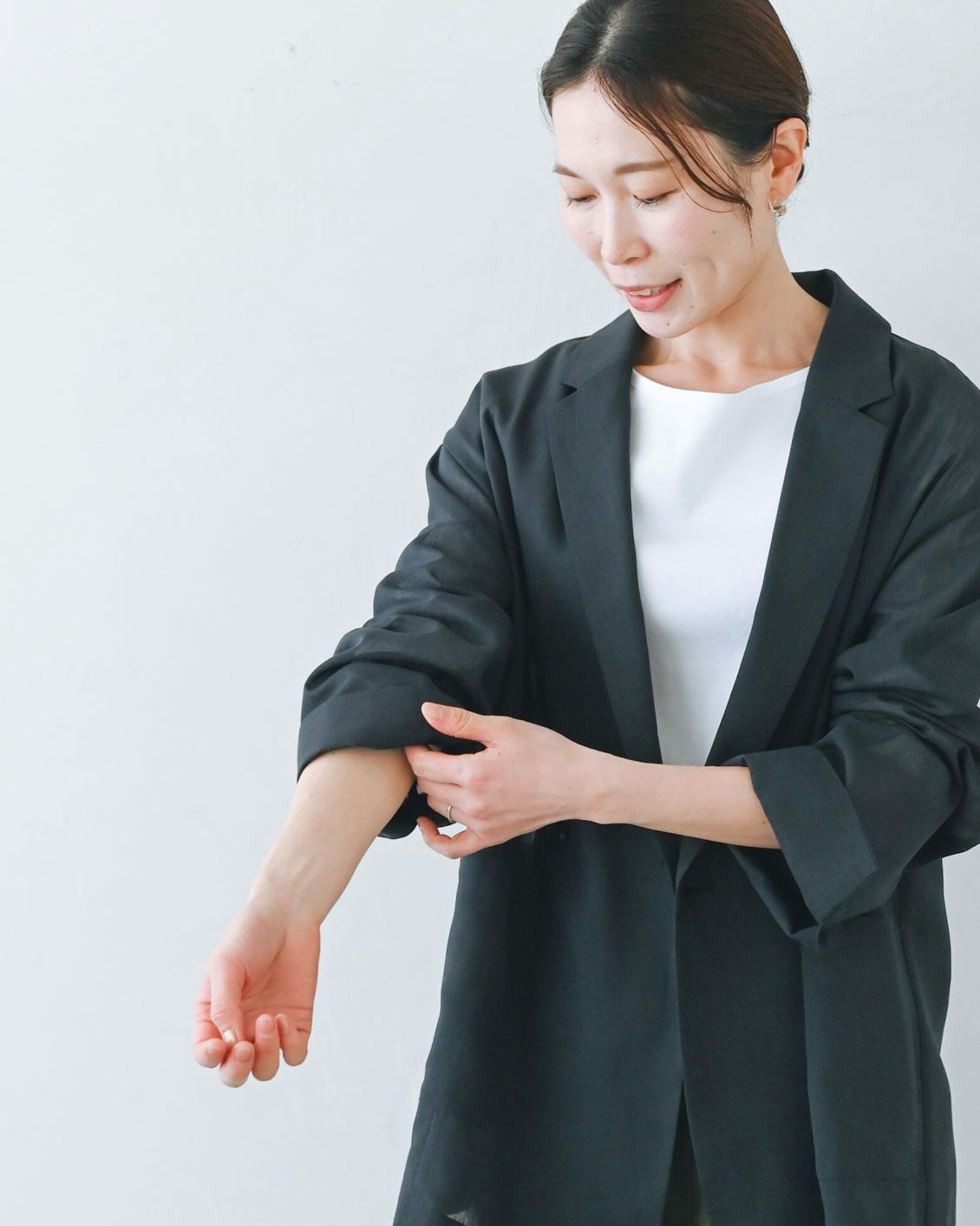 「カーディガン感覚でさっと羽織れるのが嬉しいです。身幅がたっぷりしているので、動いてもつっぱらないのに、見た目はきれいめ。