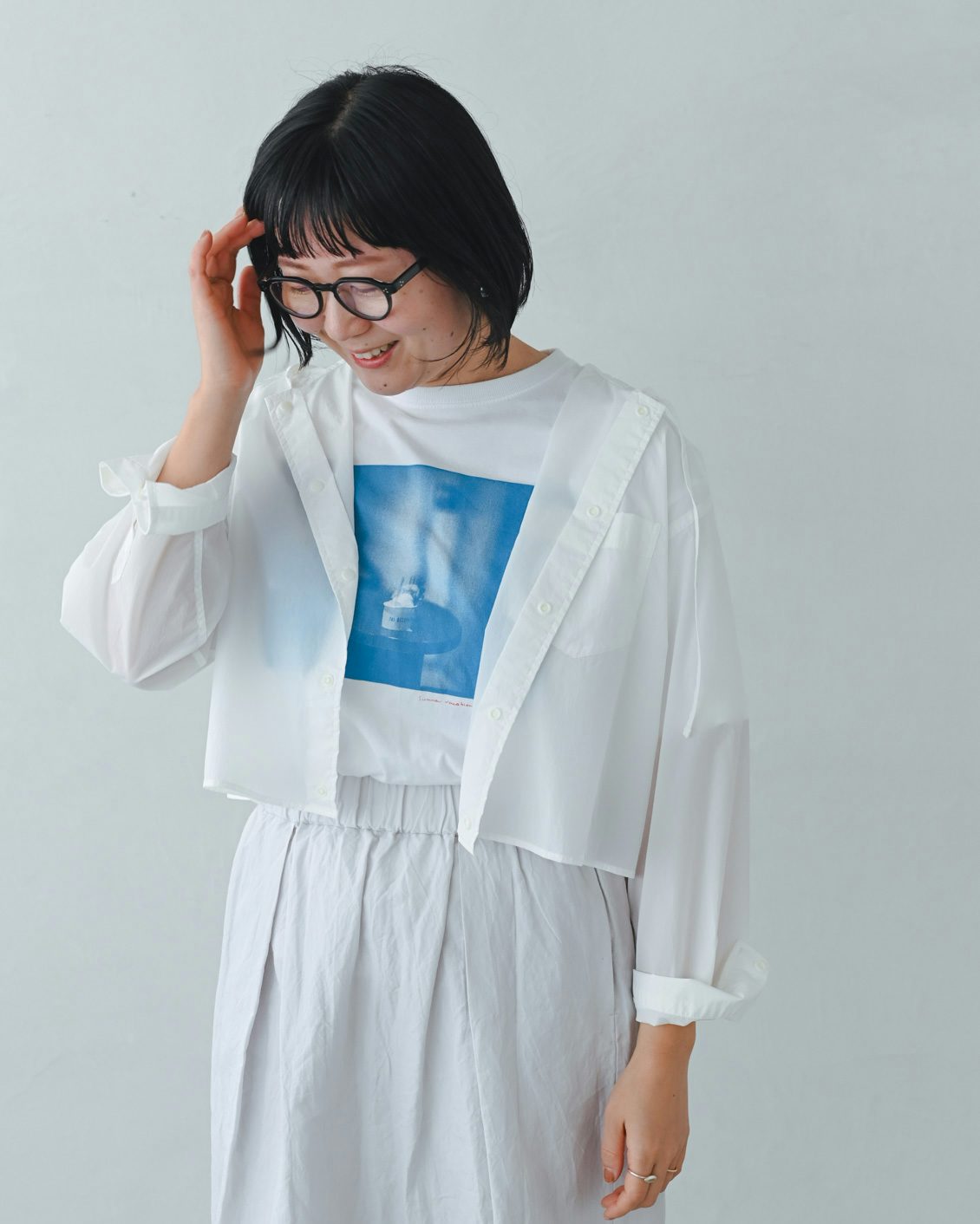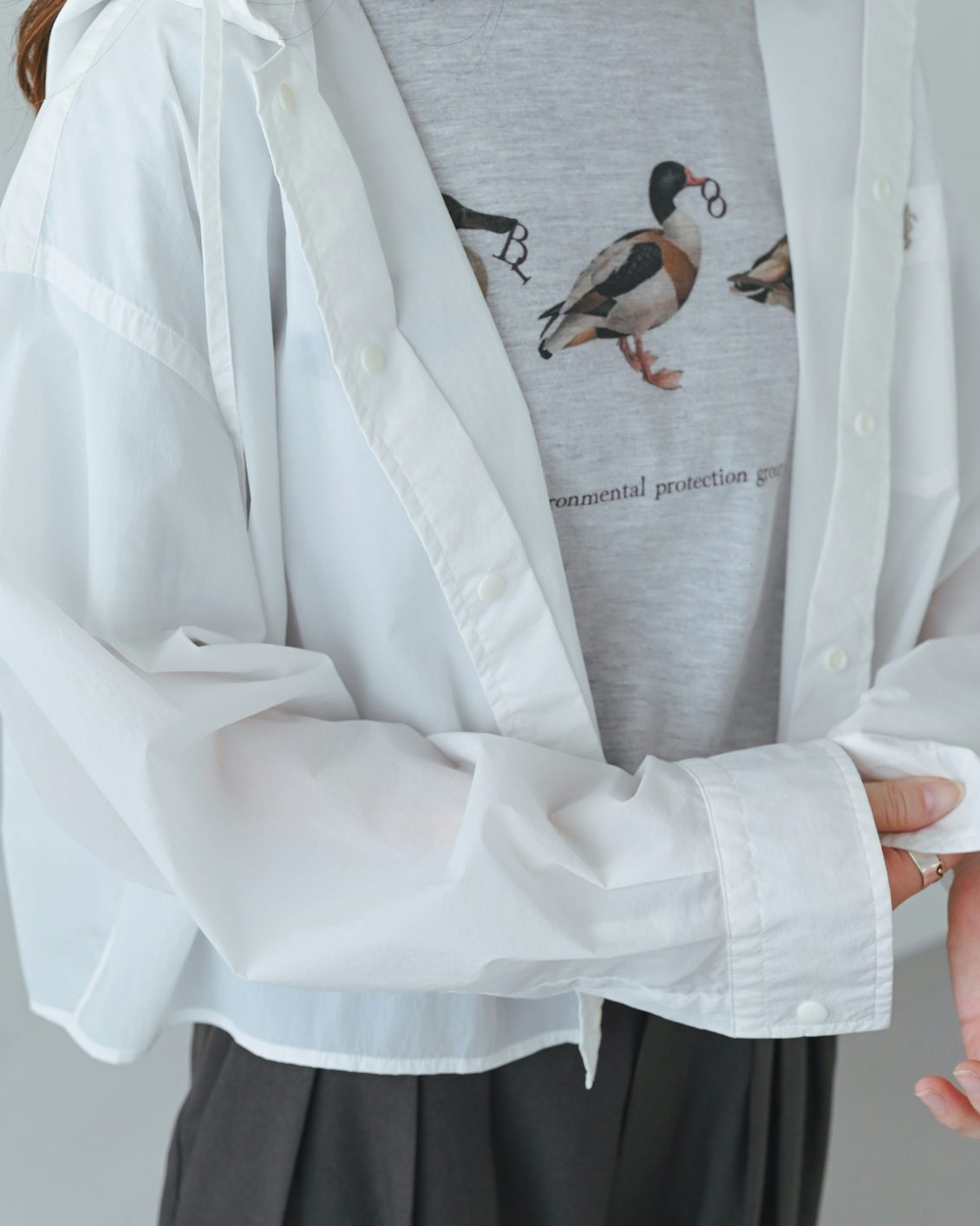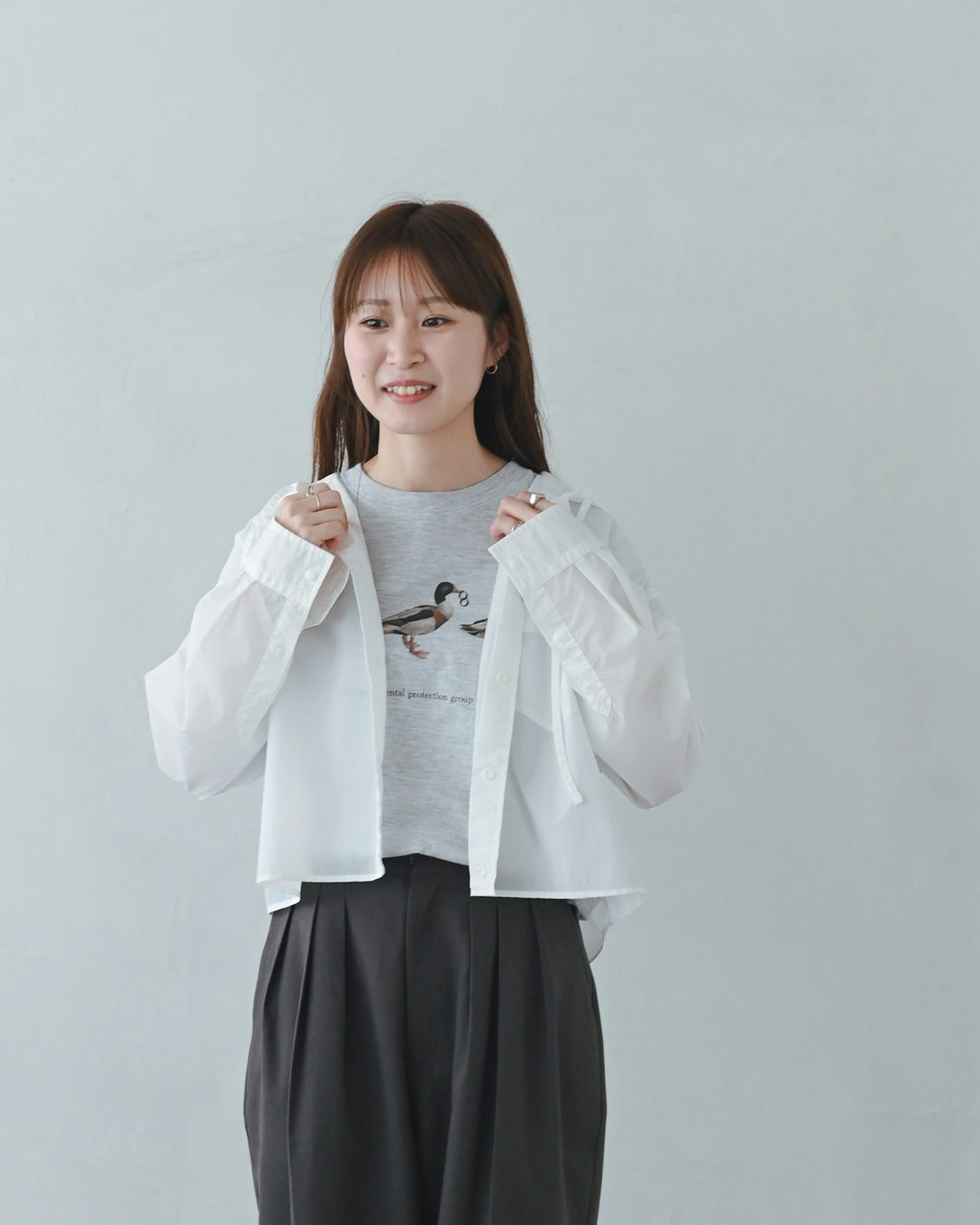 前を閉じて着たときに、Tシャツの柄がほんのり透ける感じもいいですね。