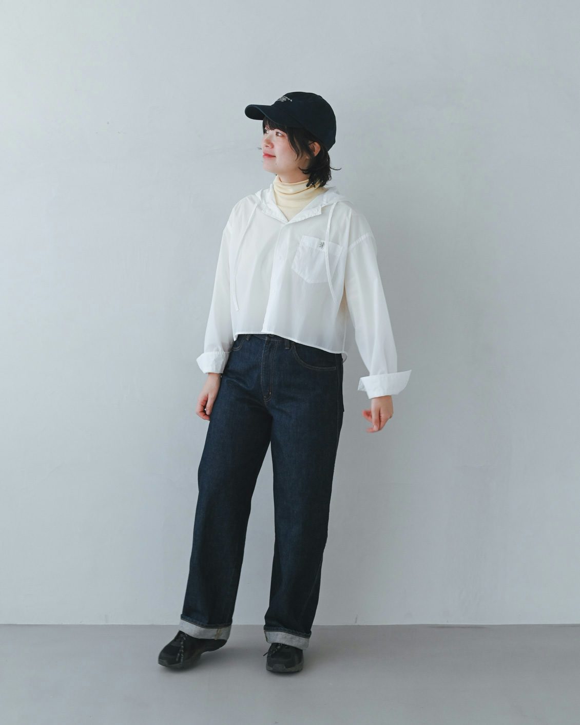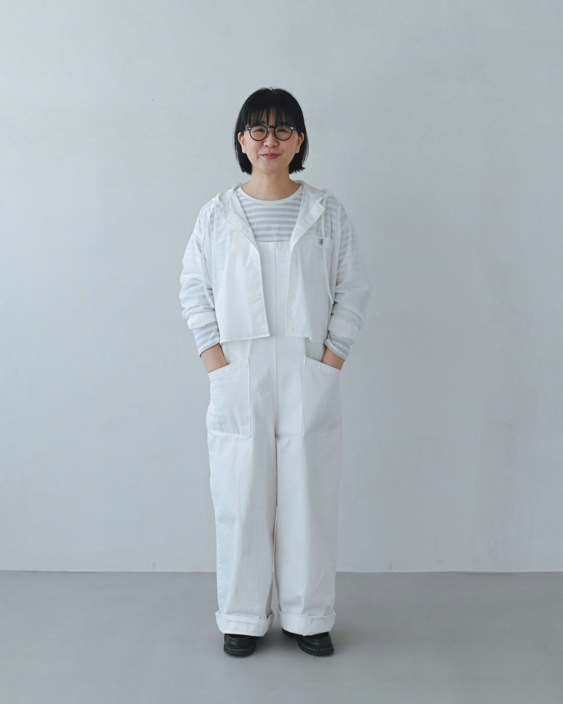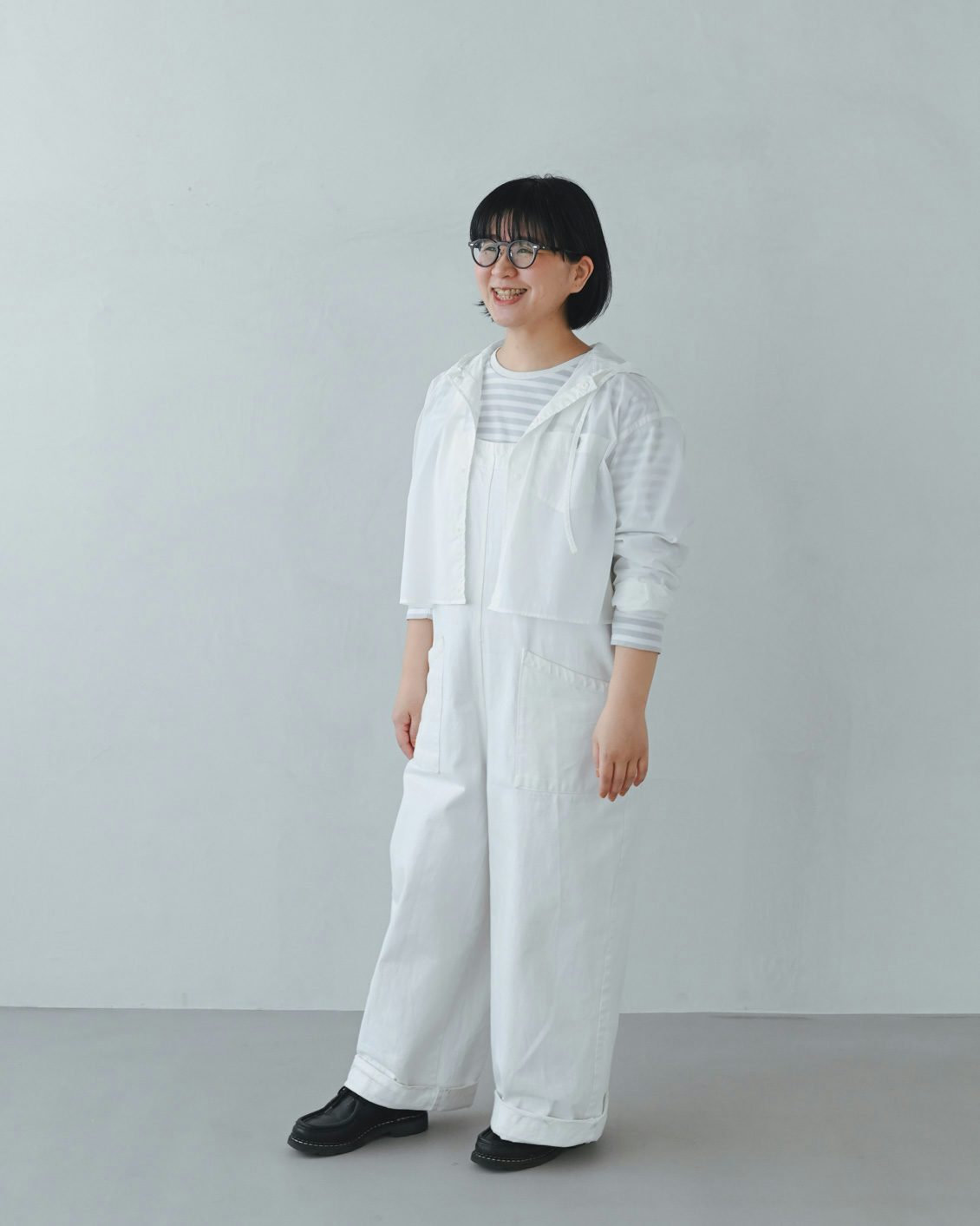 新しいアイテムを取り入れるときは少し緊張するので、ワントーンで合わせるようにしていて。今回は白いサロペットと着てみたら、スポーティな雰囲気が程よく落ち着いて、いつもの自分の延長で着られた気がします」