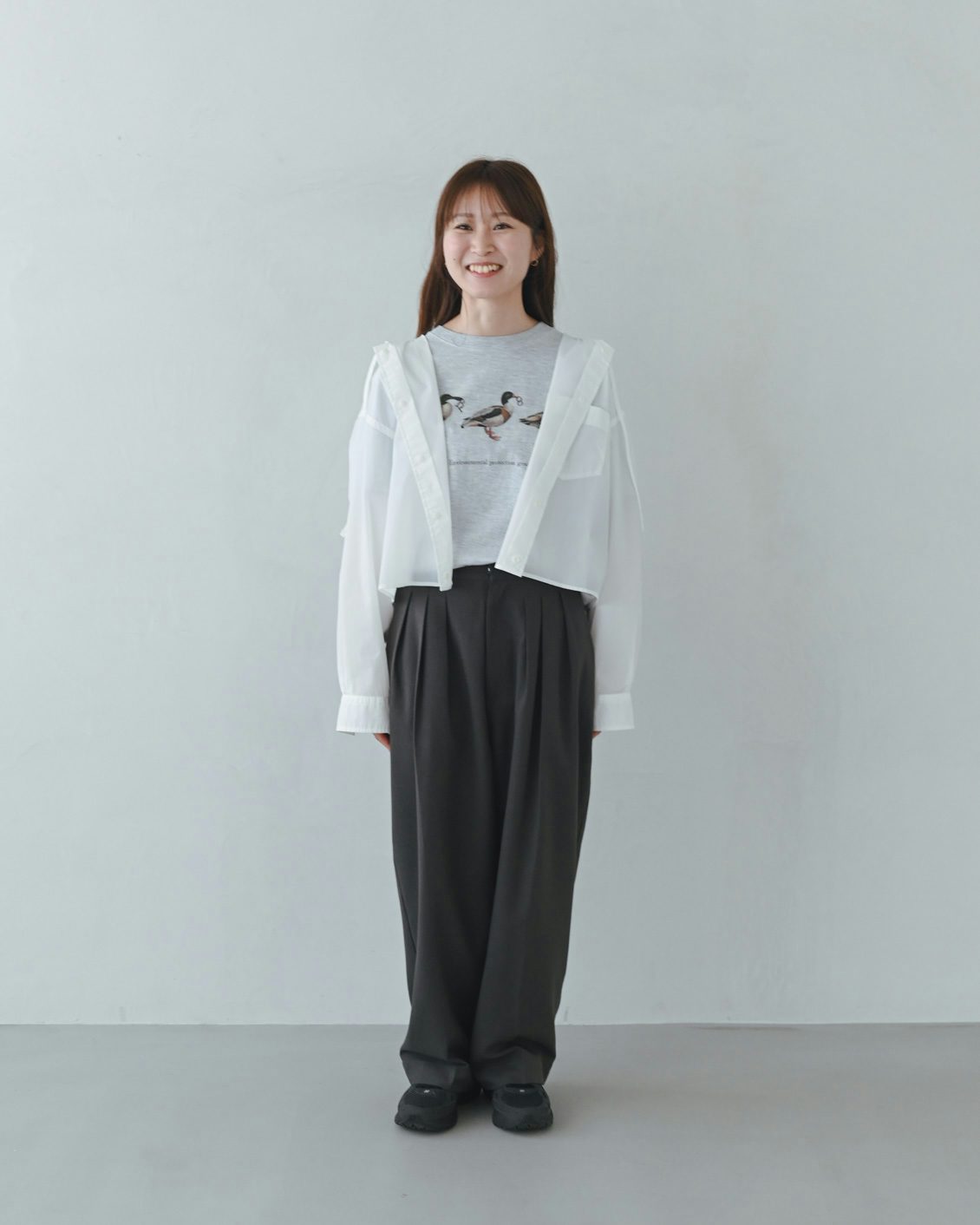 「丈感が可愛いですね〜! 身長が低めなので、バランスの取りやすい短め丈のトップスは普段から重宝していて。この丈のおかげで、スッと脚が長く見えるような気がします。