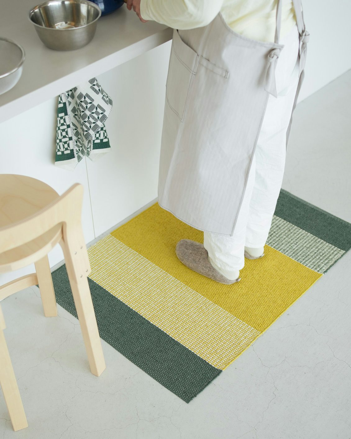 スウェーデンの伝統的な織物であるプラスチックフォイル製のラグは、水や油に強く、汚れた場合もサッと拭き取ることが可能です。
