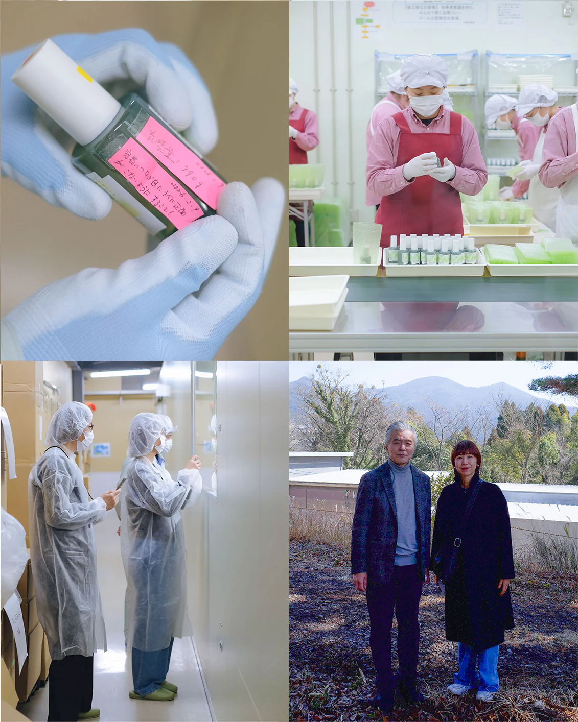 ▲左下:一同でクリーンウェアを着て工程内を見学。右下:メーカーの社長さんと佐藤とで記念撮影。社長さん自らが開発者として生産フローの微調整を重ねてくださり、今回のヘアケアシリーズの使い心地が実現しました