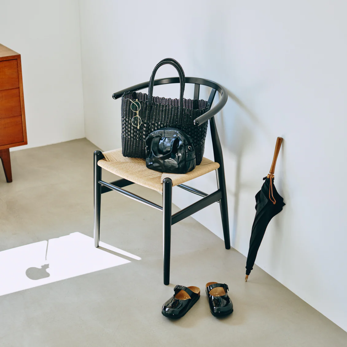 今回はオールブラックのリネンセットアップに、アクセントとしてキラッと光る素材を取り入れたいと思い、シルクのブラウスや、エナメル素材のシューズ、バッグを合わせてみました」