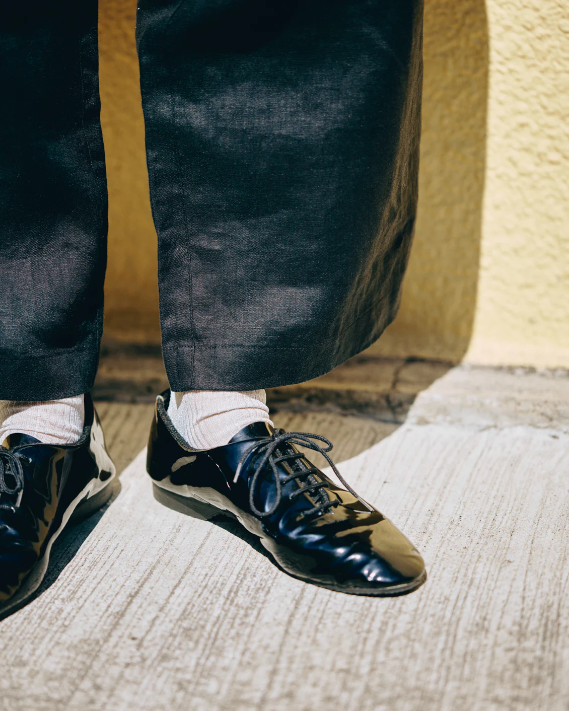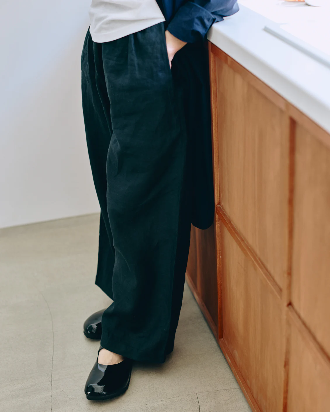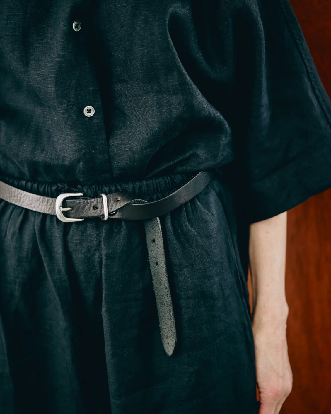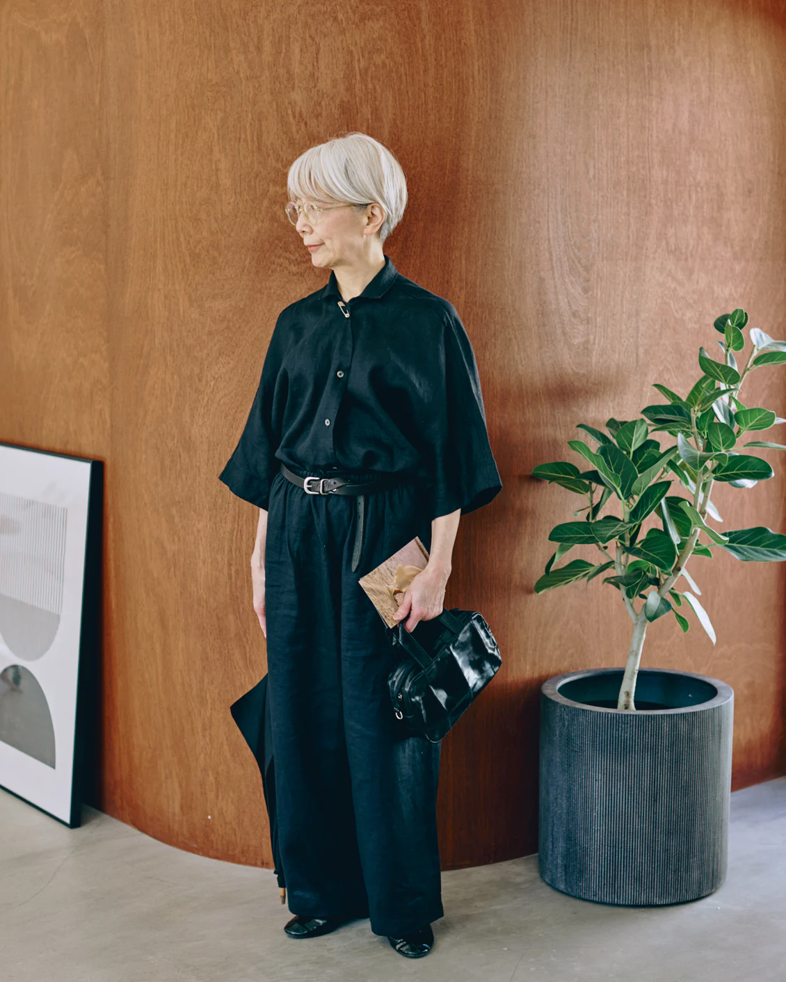 薄手のリネン素材だから、艶のあるエナメルの太いベルトをしてメリハリをつけたり、トップスのボタンを開けて中に白いTシャツを着たりして、夏でもブラックを軽やかに楽しめると思います」