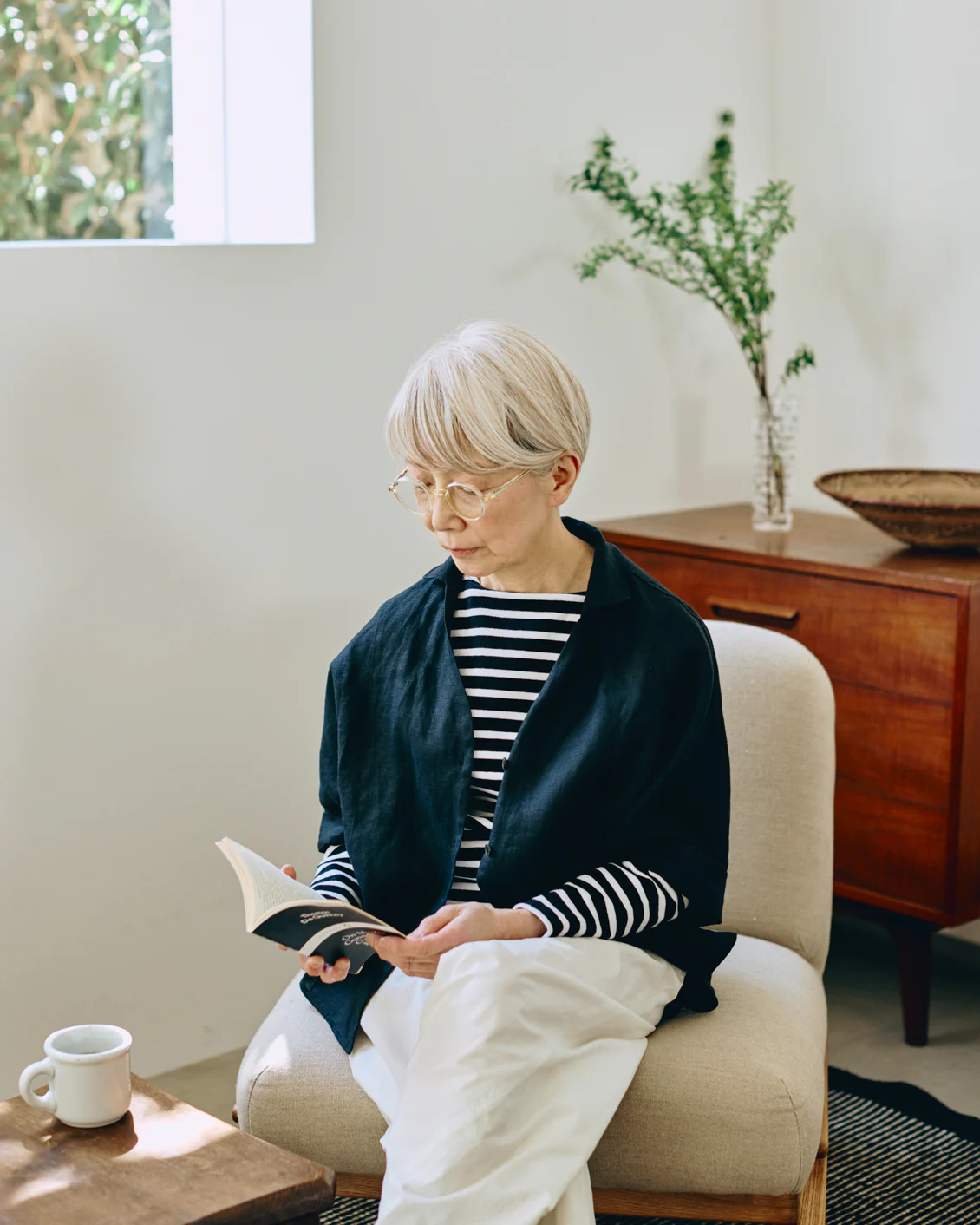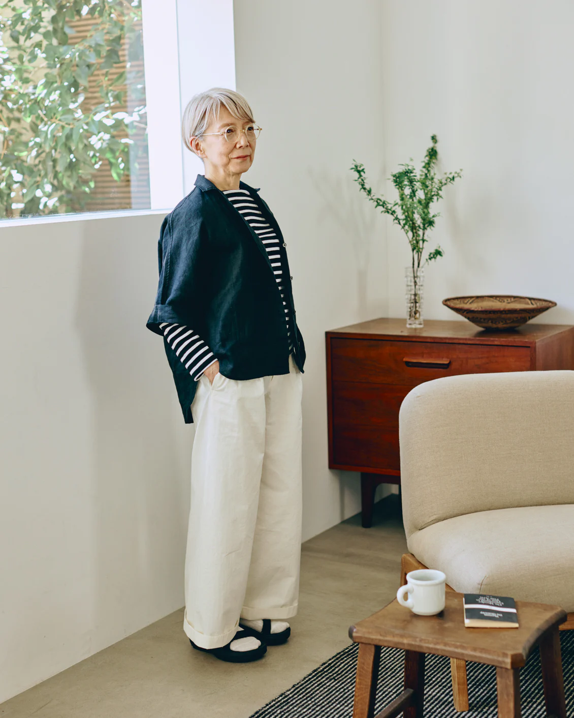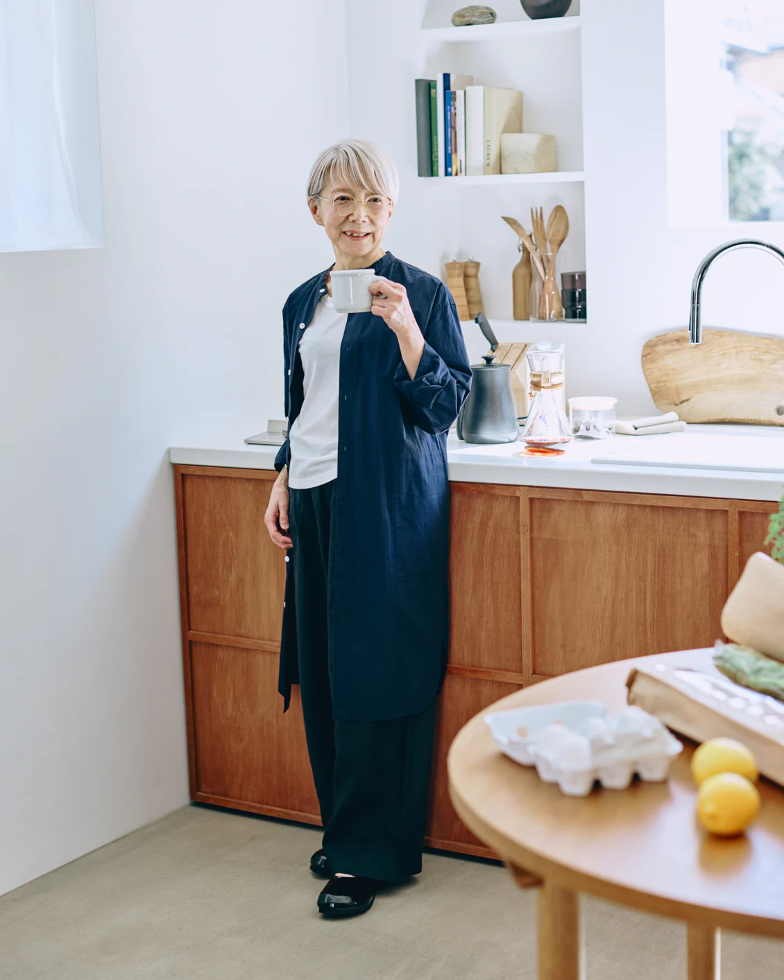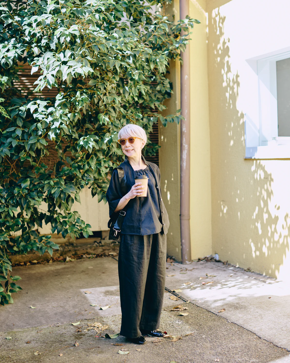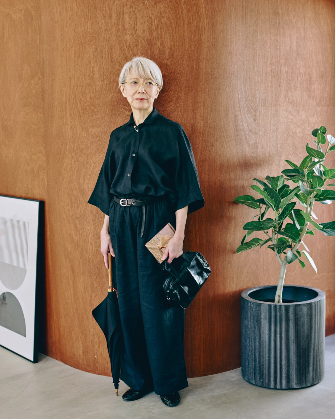 30代でイギリスに渡り、マーガレット・ハウエルの工房で働いていたこともある渡辺さん。シンプルで洗練された着こなしは、いつだって私たちの憧れです。