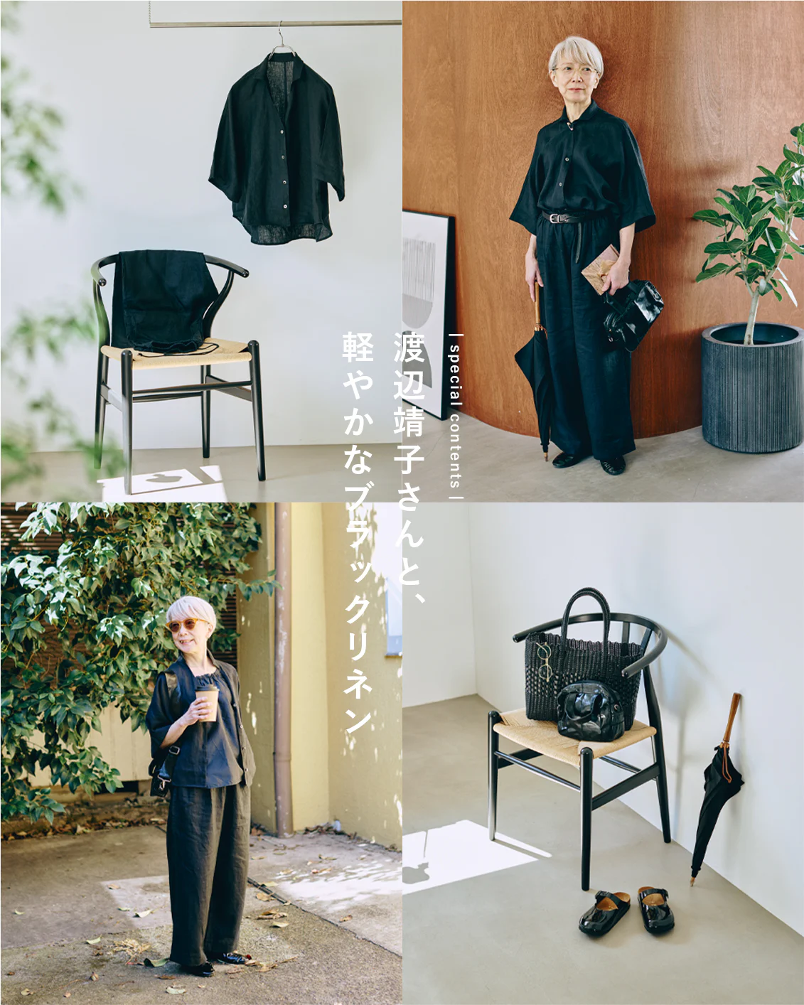 こちらの特集では新色の発売を記念して、渡辺靖子さんにブラックを装う魅力について伺いながら、私服と合わせた着まわしコーデを見せていただきました。