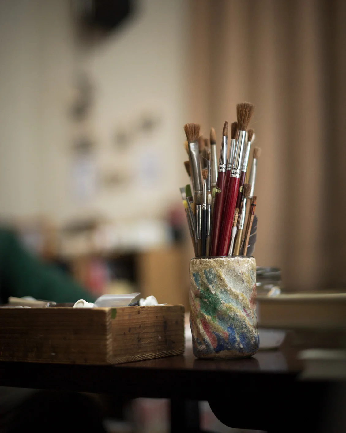 机の上に、愛らしい絵筆入れがありました。山室さんの手作りでしょうか?