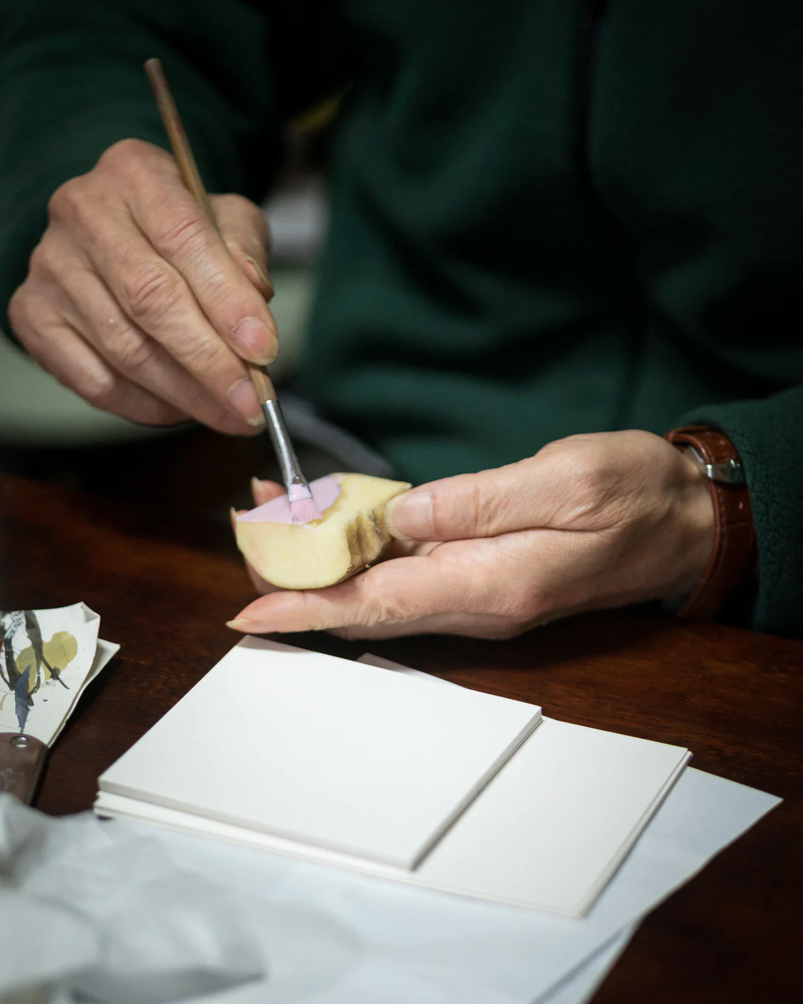 いも版の材料といえばさつまいもが一般的ですが、山室さんはじゃがいも派。さつまいもだと粘りがあって油絵のようなタッチになりますが、じゃがいもはさらりとしていて、絵の具が滲むこともなく繊細に仕上がります。それでいて、いもならではのしっとりとした柔らかさや温かみも感じられる。