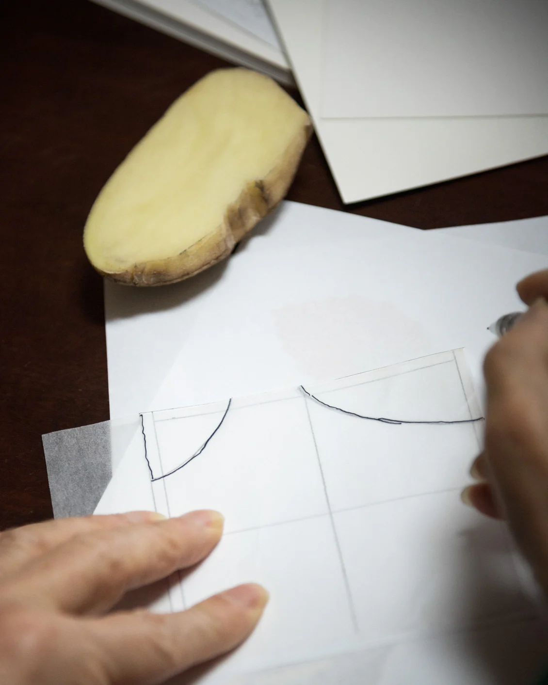 下書きを、水性ペンでグラシン紙に写したら、じゃがいもの断面にぴたっとくっつけて転写します。