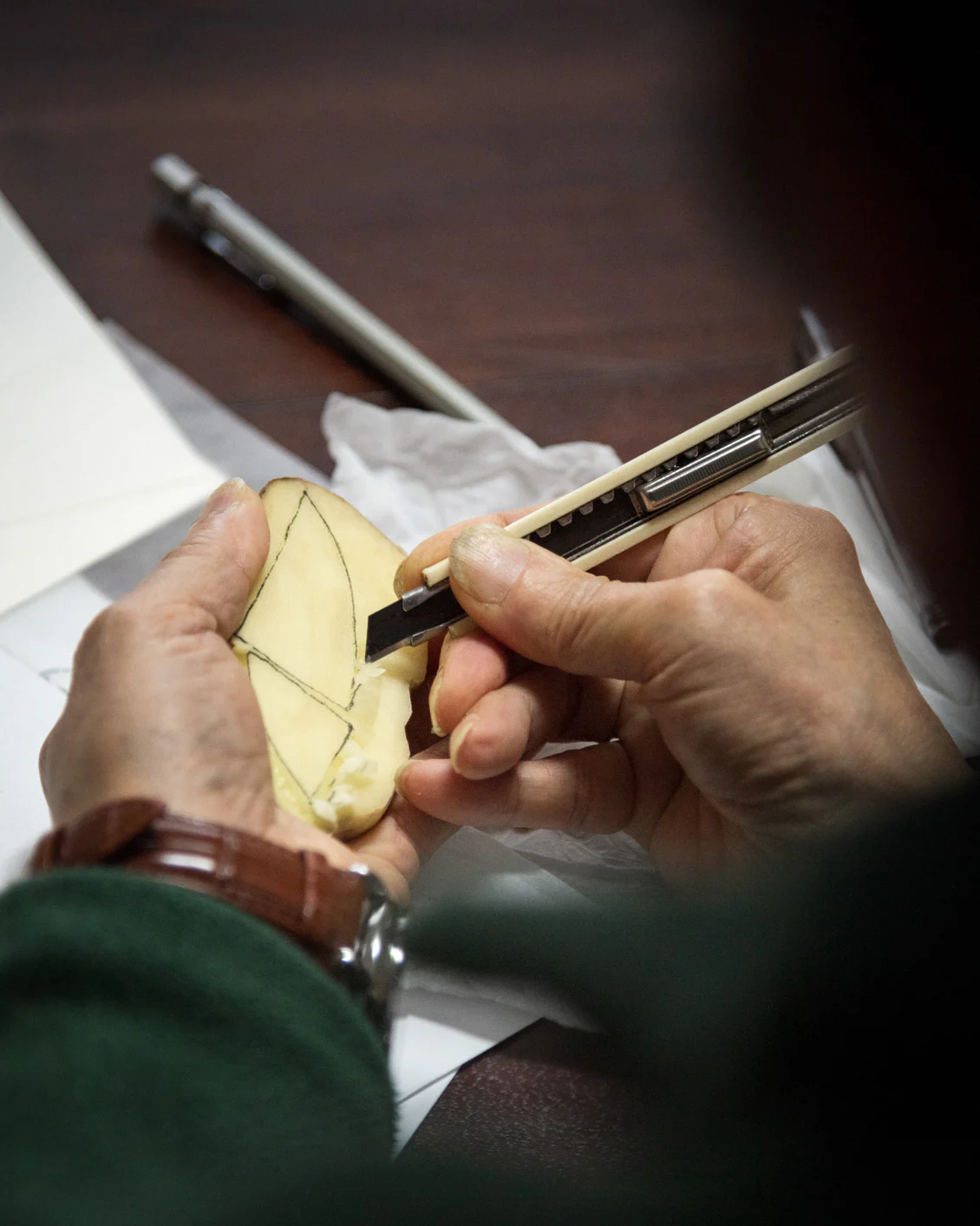 「力をいれずに すーっと切れるでしょう。周りを削っていくと、じゃがいもはやわらかいですから、ポロポロと落ちていくんです。不要な部分は肥後守(ひごのかみ)で切り落として… 肥後守って、若い方はあまり使わないかしら。私が子どもの頃は、この刃物ひとつで、竹を割ったり木を削ったりして遊び道具を作ったんですよ」