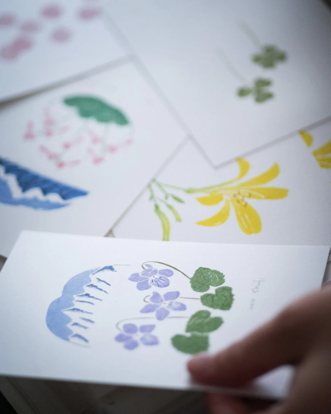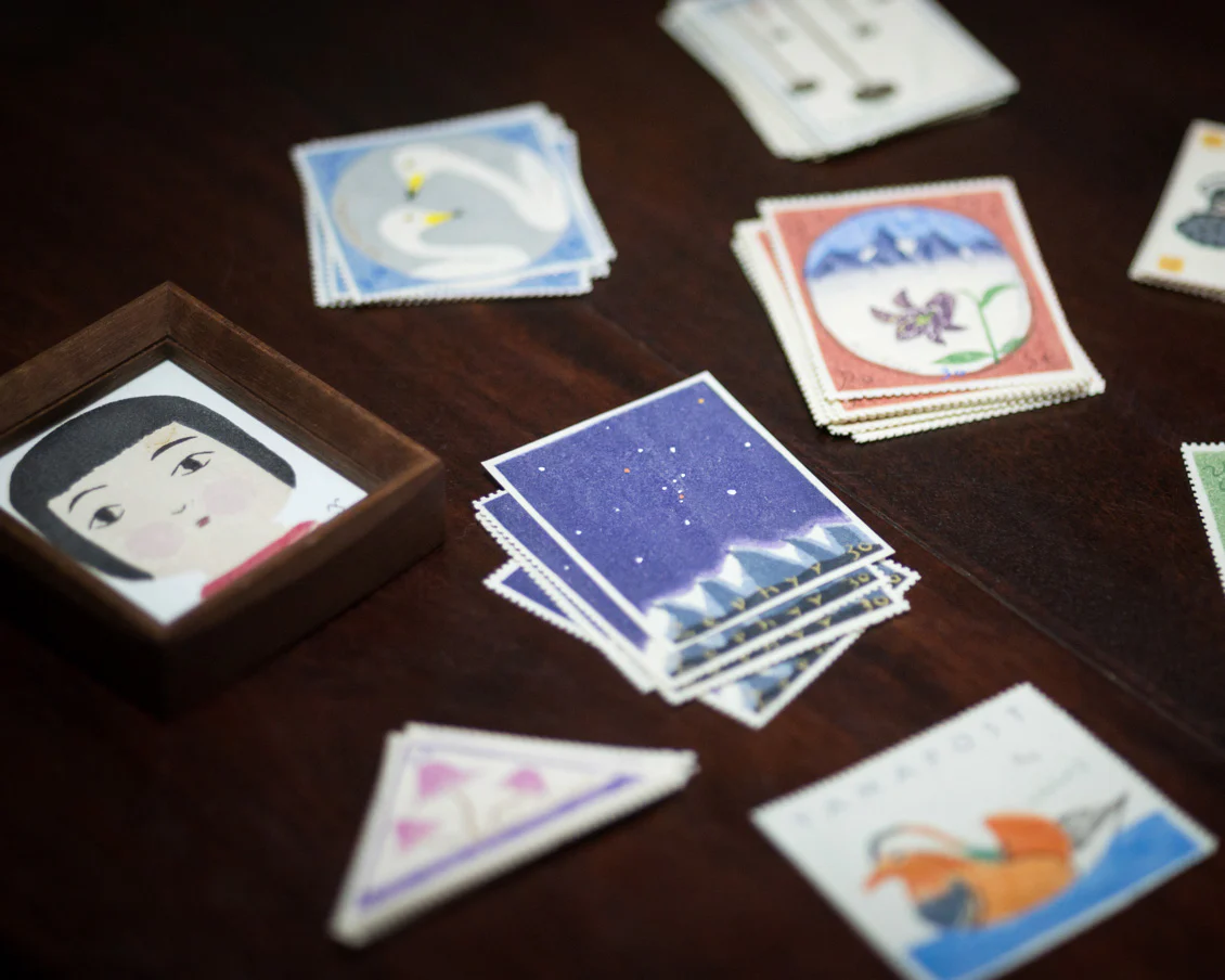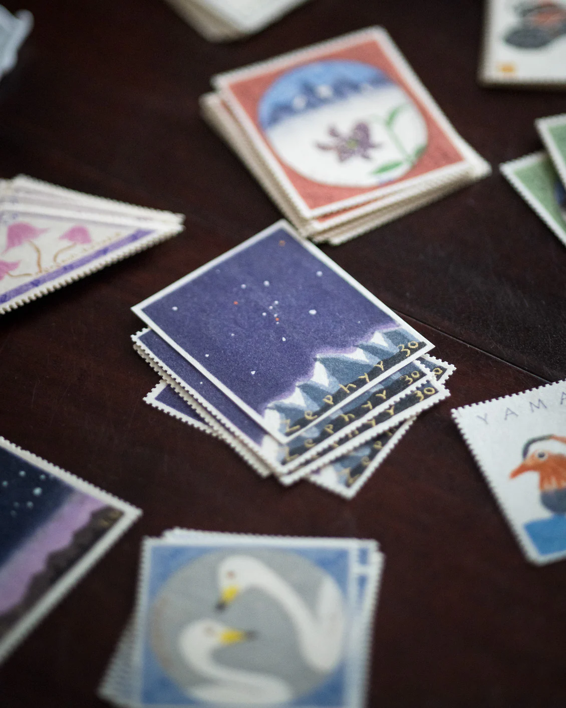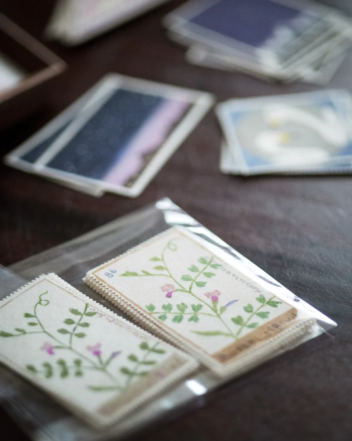草花に野鳥、星空……切手サイズの紙片のなかで、ささやかな自然が息づいています。