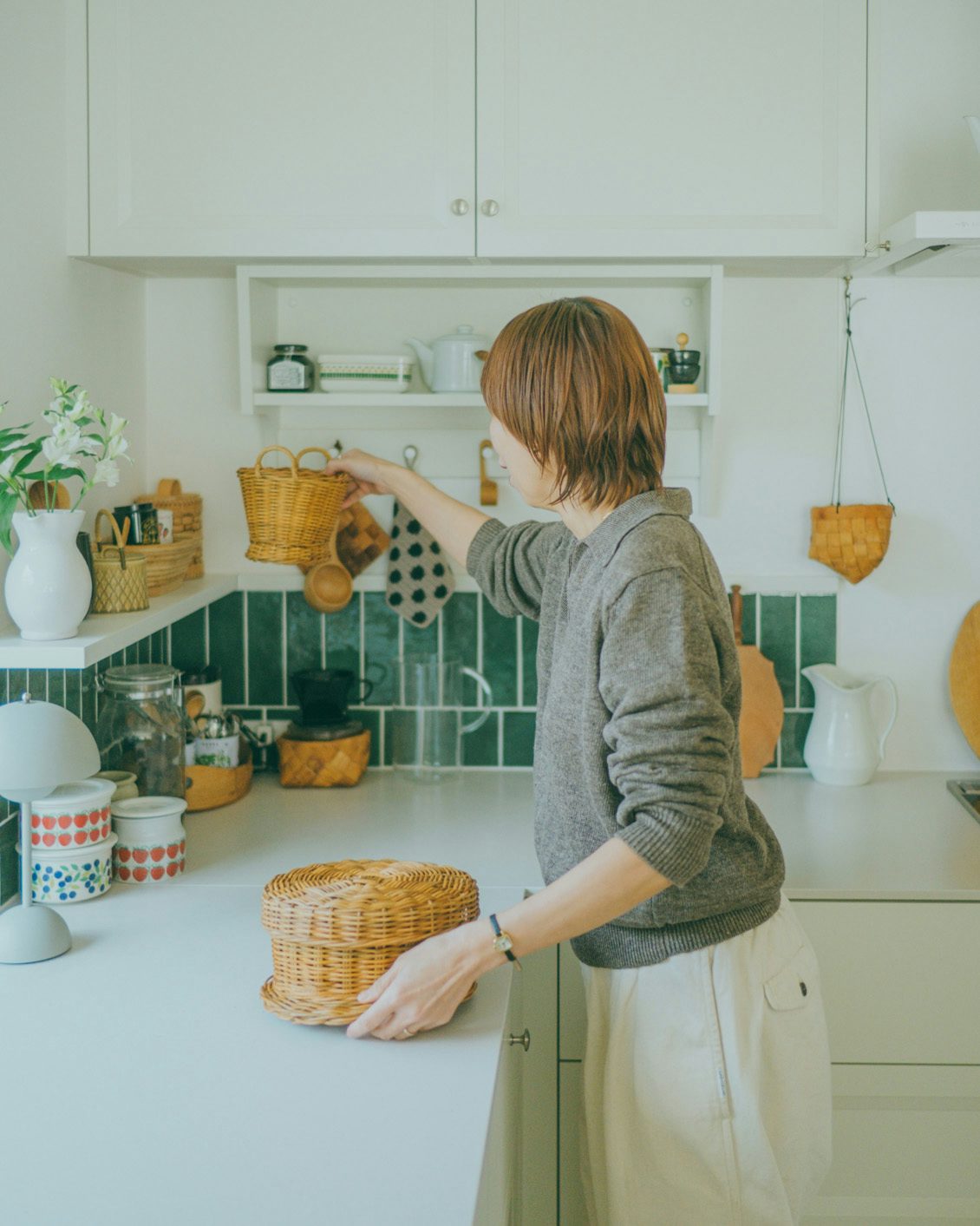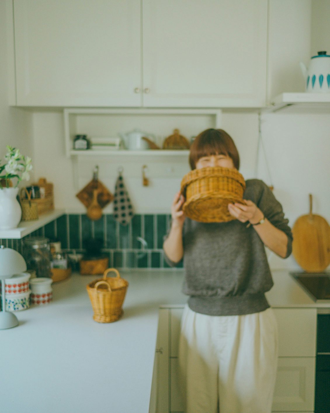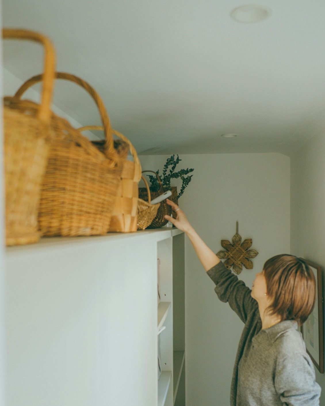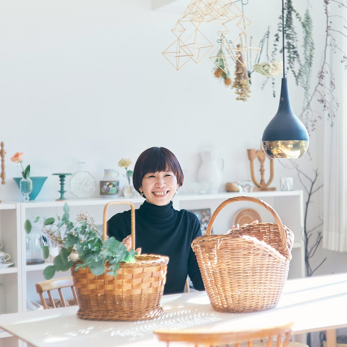 昨年の春に構えた新居では、大切なかごの寸法にあわせて造作棚の高さを決めたほど。天井近くにかごをずらっと並べるのは、小学生の頃からずっと憧れていた景色だったんです」