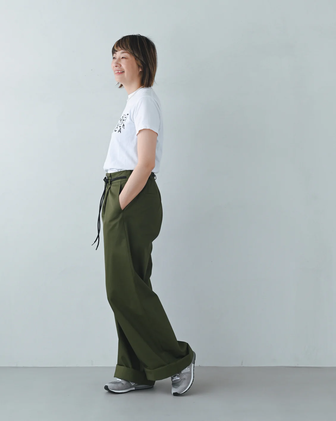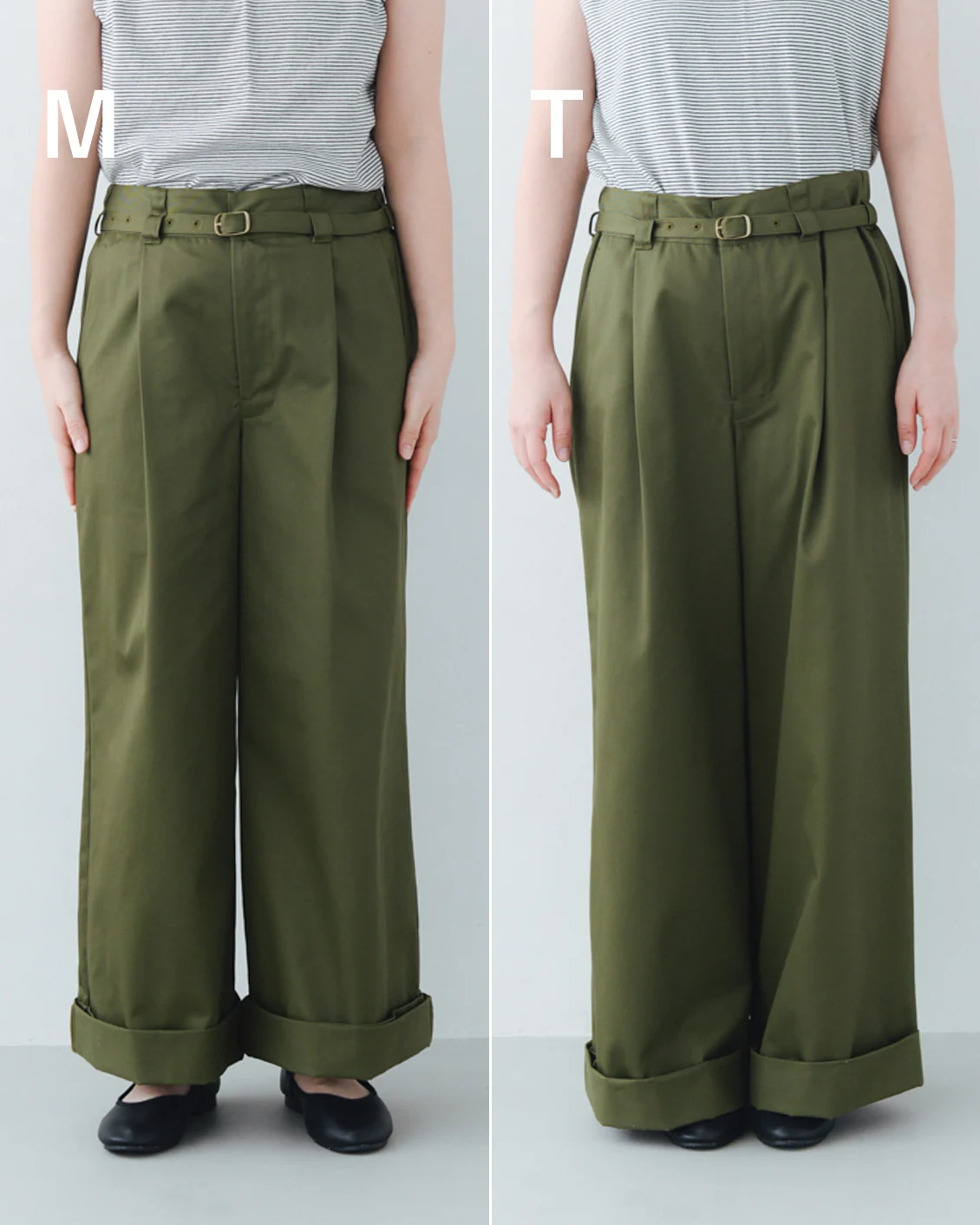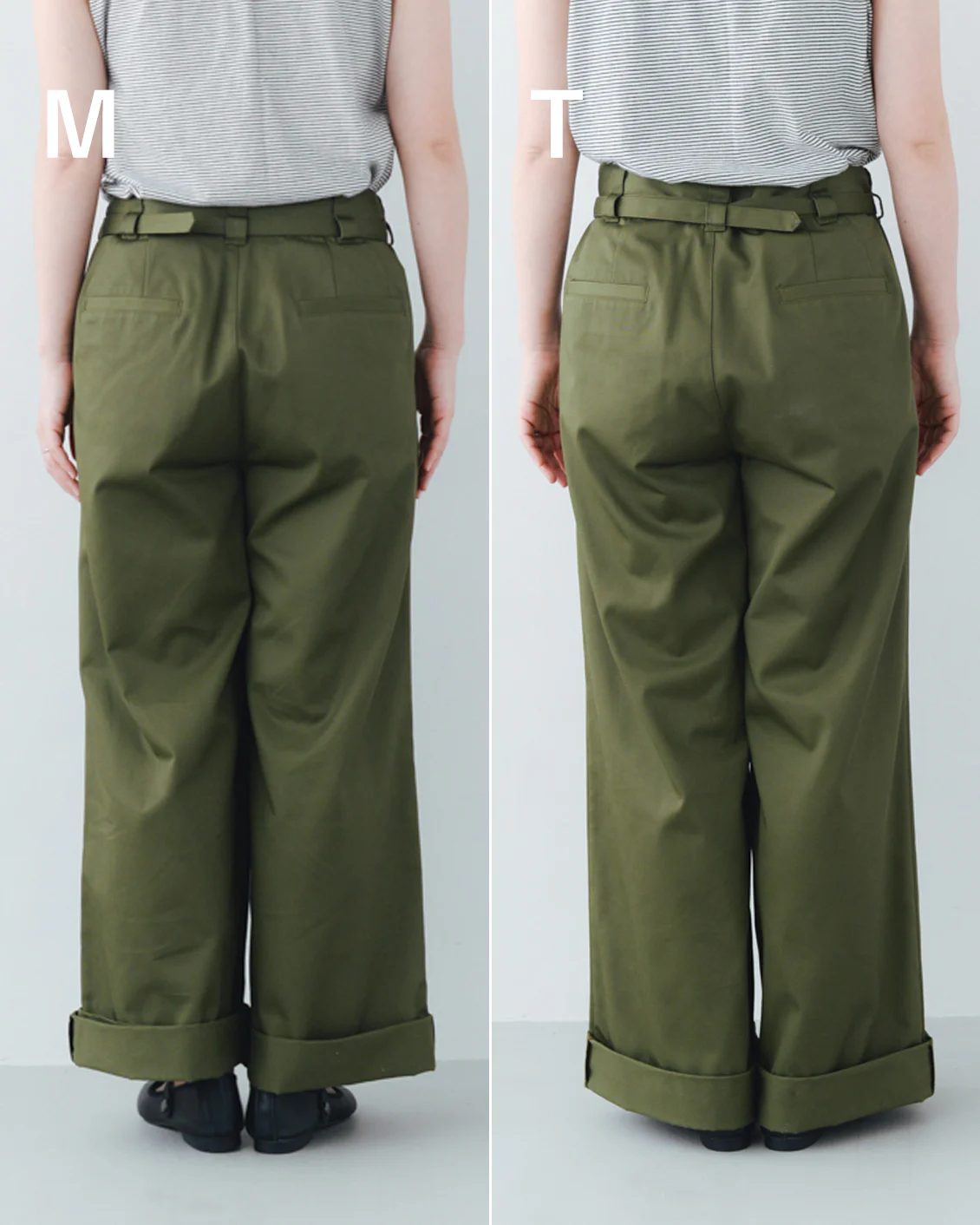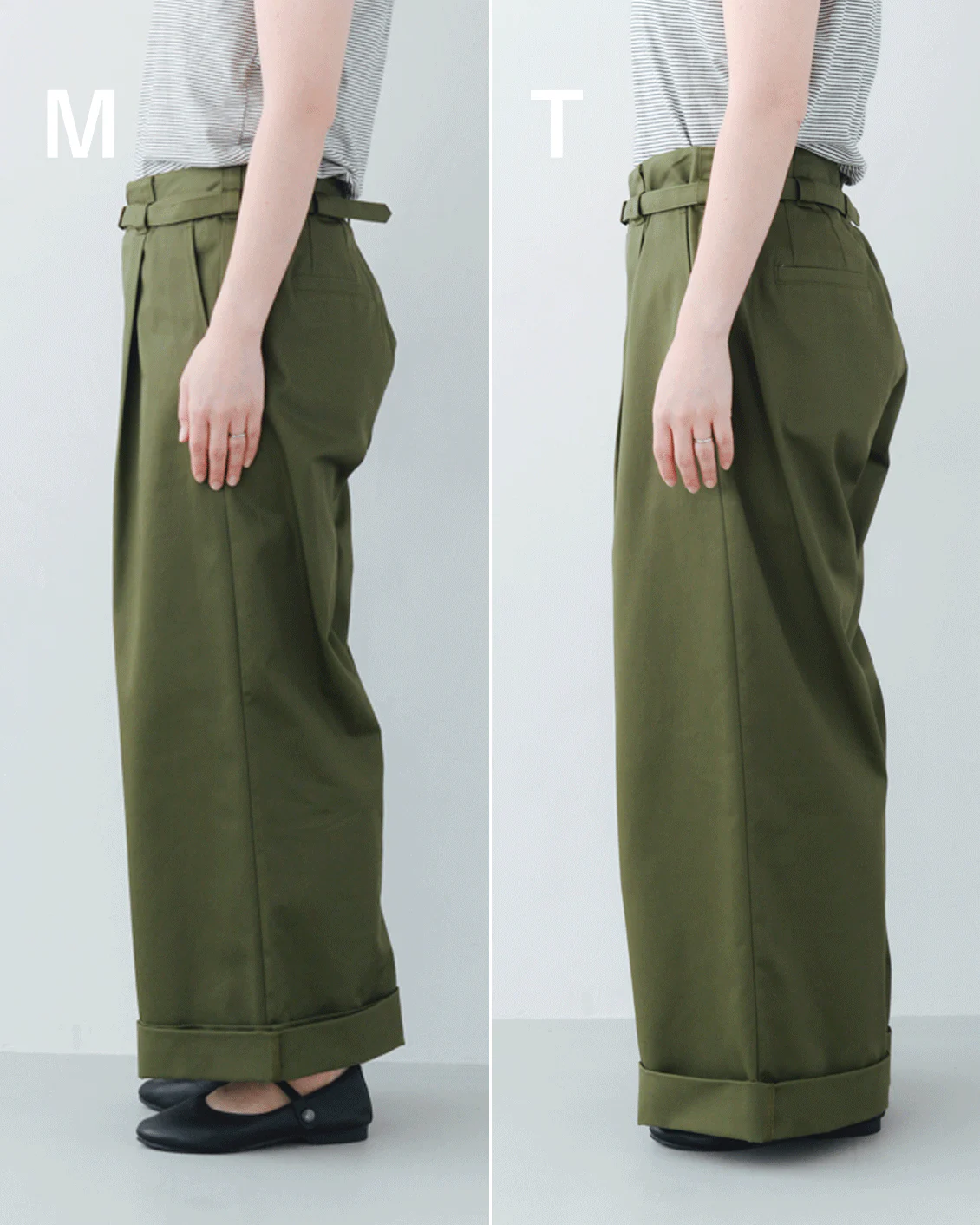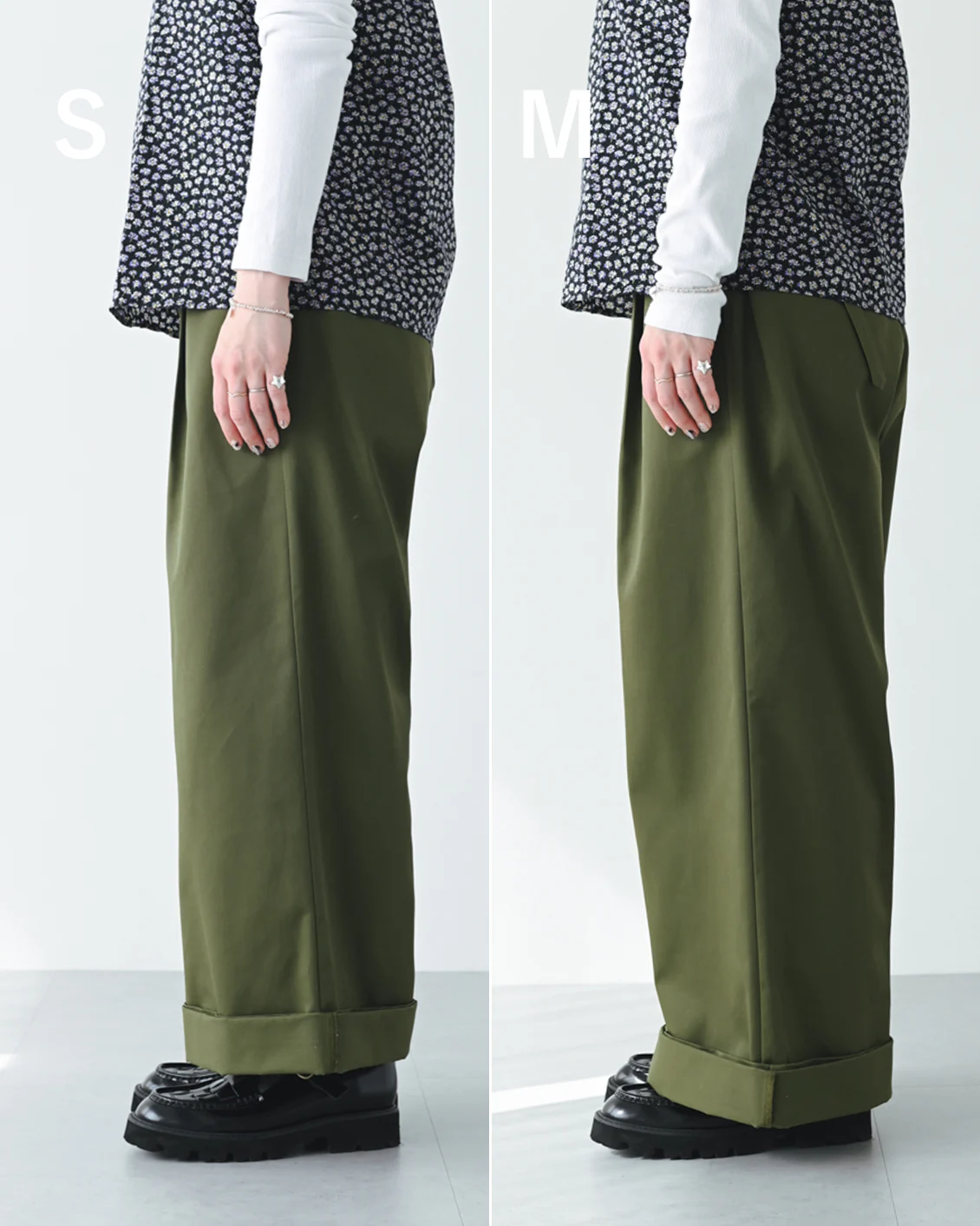 「Tサイズは長めの丈感になりましたが、フラットシューズでも裾は床につかずに穿けました。このゆるっとした落ち感を楽しむのも良いですね」