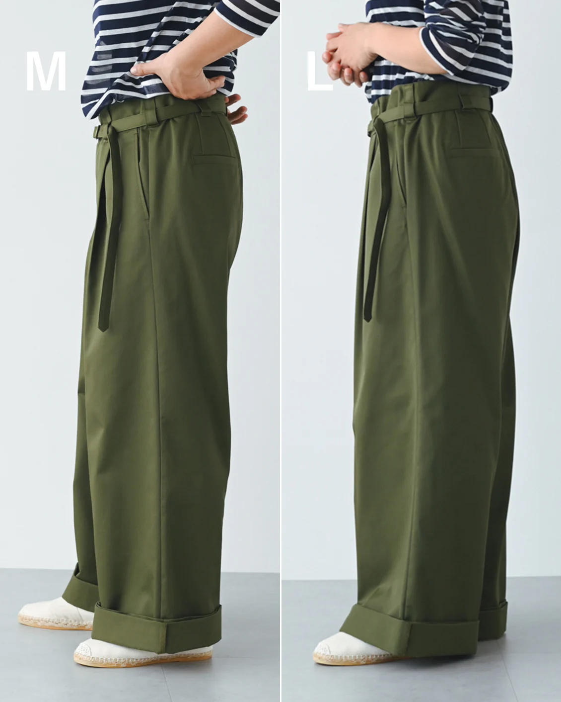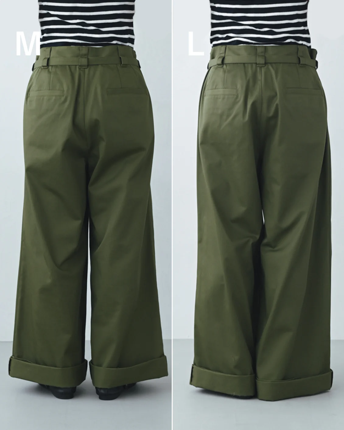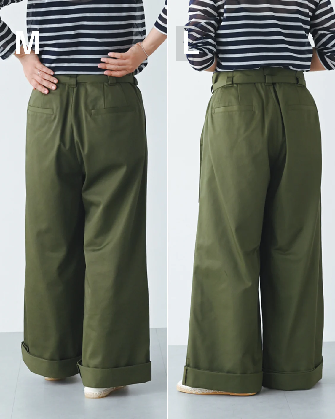 「ウエストはMサイズもLサイズもやや大きめでした。でも、ベルトで調整できるので問題はないですね。好みの落ち感に調整できそうだなと思いました。