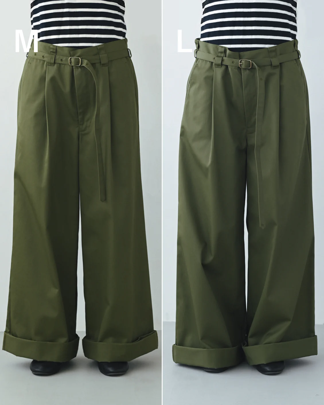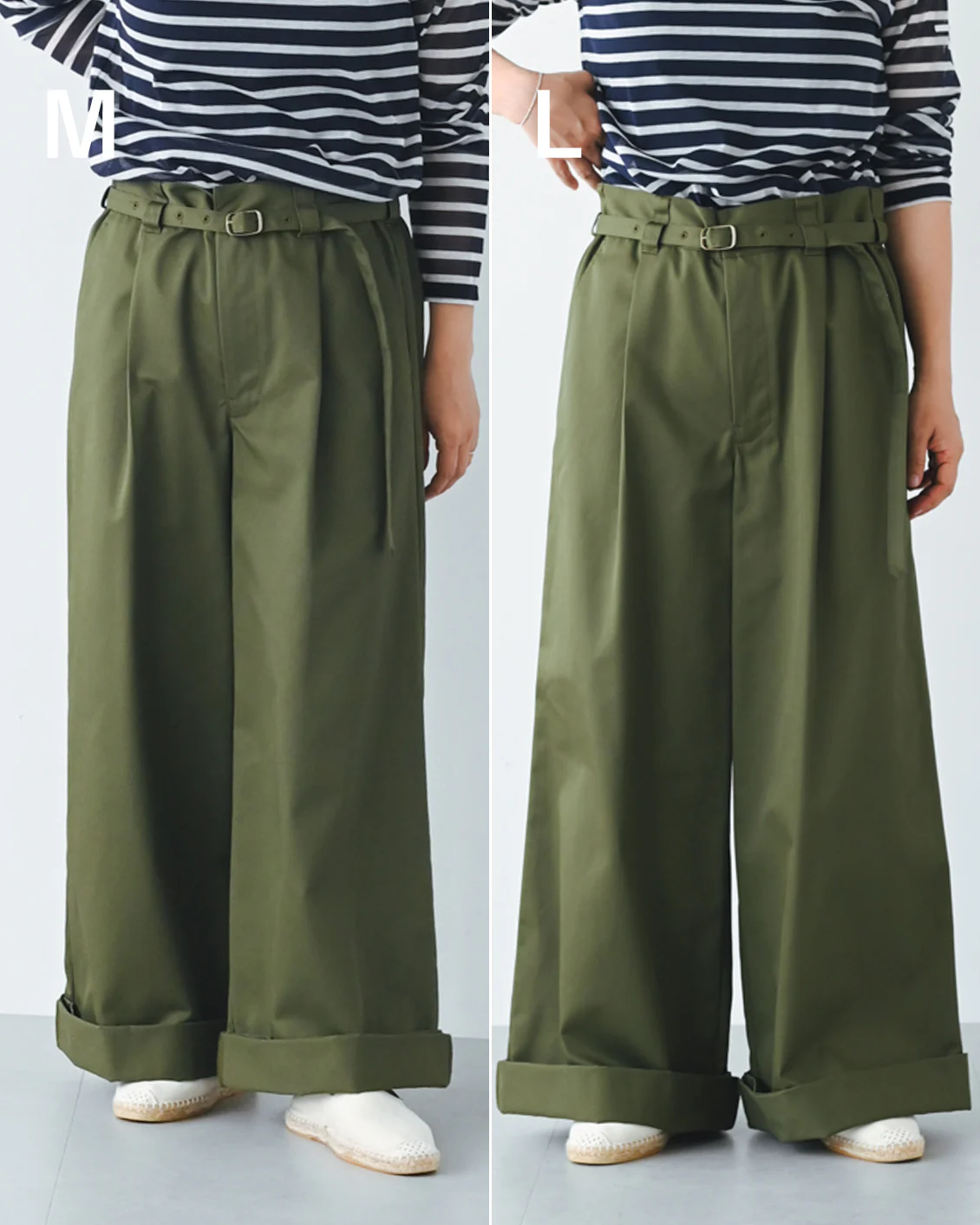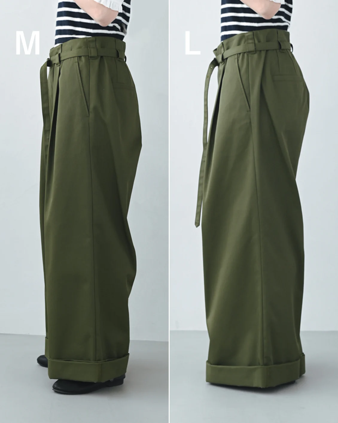「ウエストはMサイズもLサイズもやや大きめでした。でも、ベルトで調整できるので問題はないですね。好みの落ち感に調整できそうだなと思いました。
