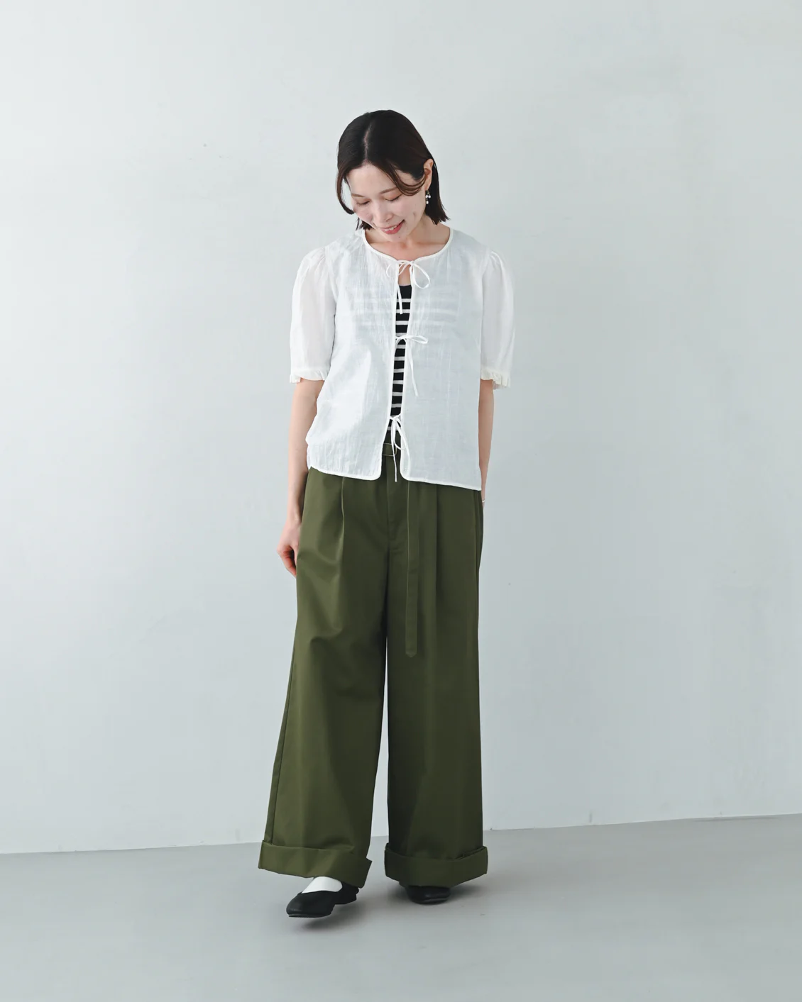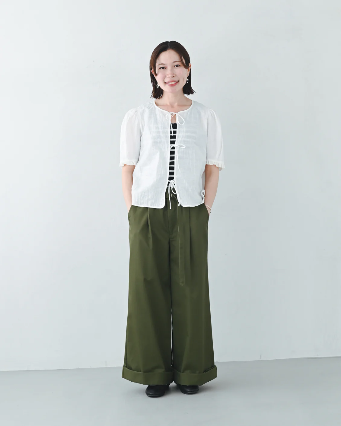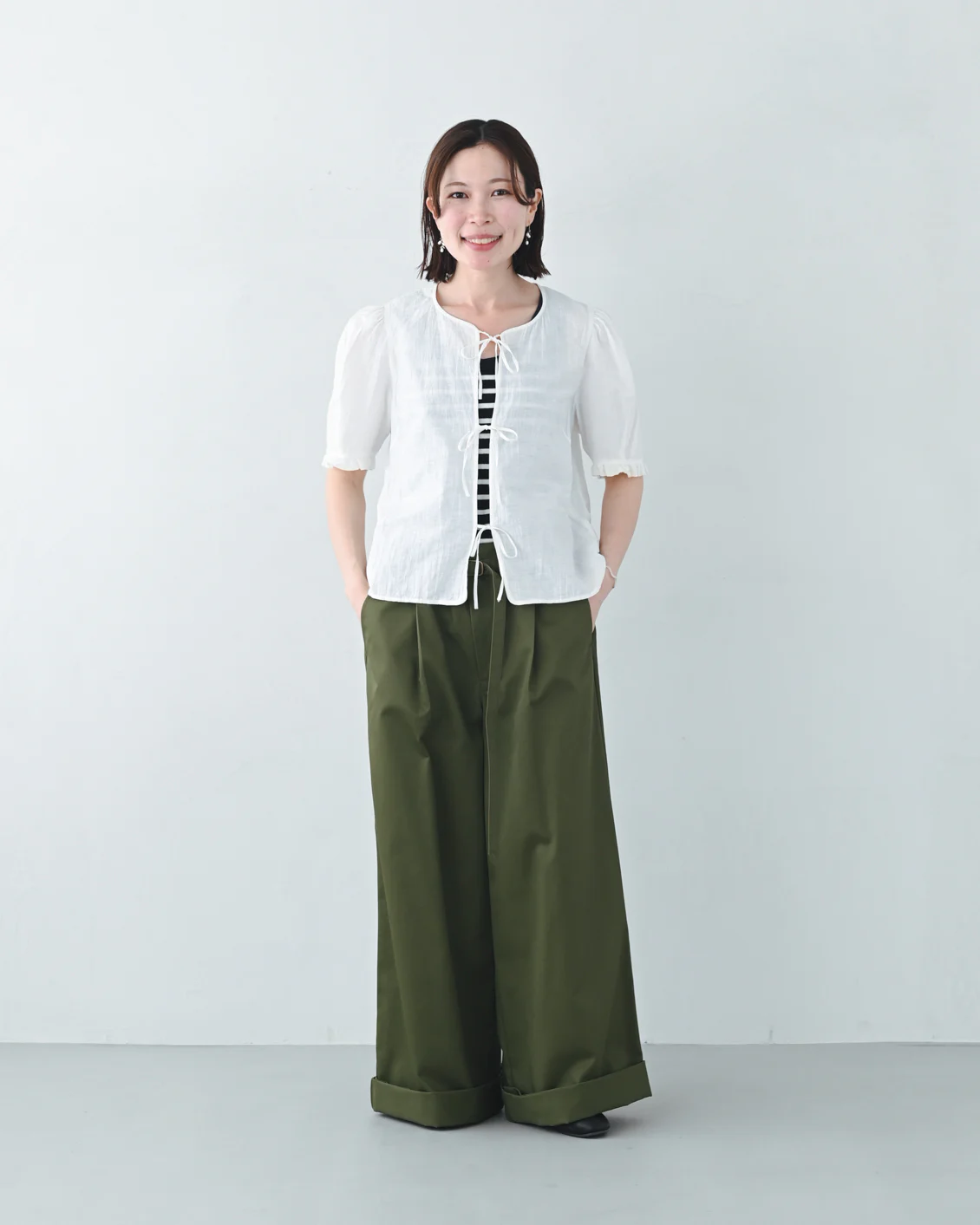 「ストンと落ちるシルエットがきれい。ワイドだけどセンタータックが効いていて、ほどよくきちんと感もあります。甘めのトップスも似合いそうだなと思って、リボンのついたブラウスを合わせてみました。
