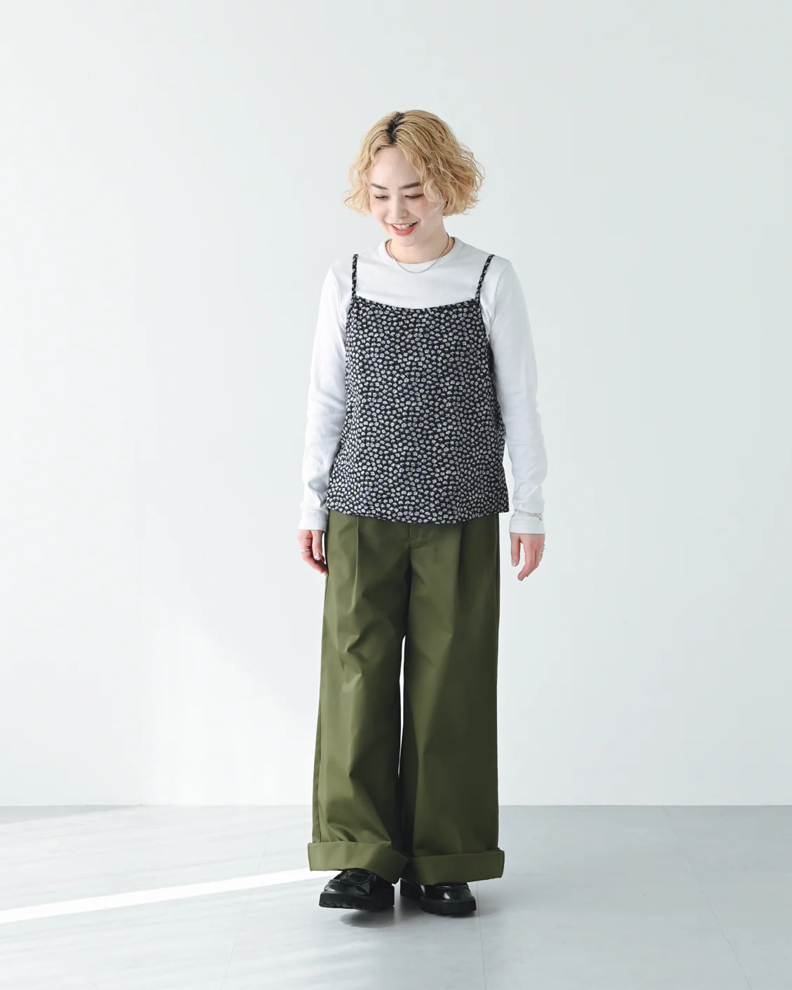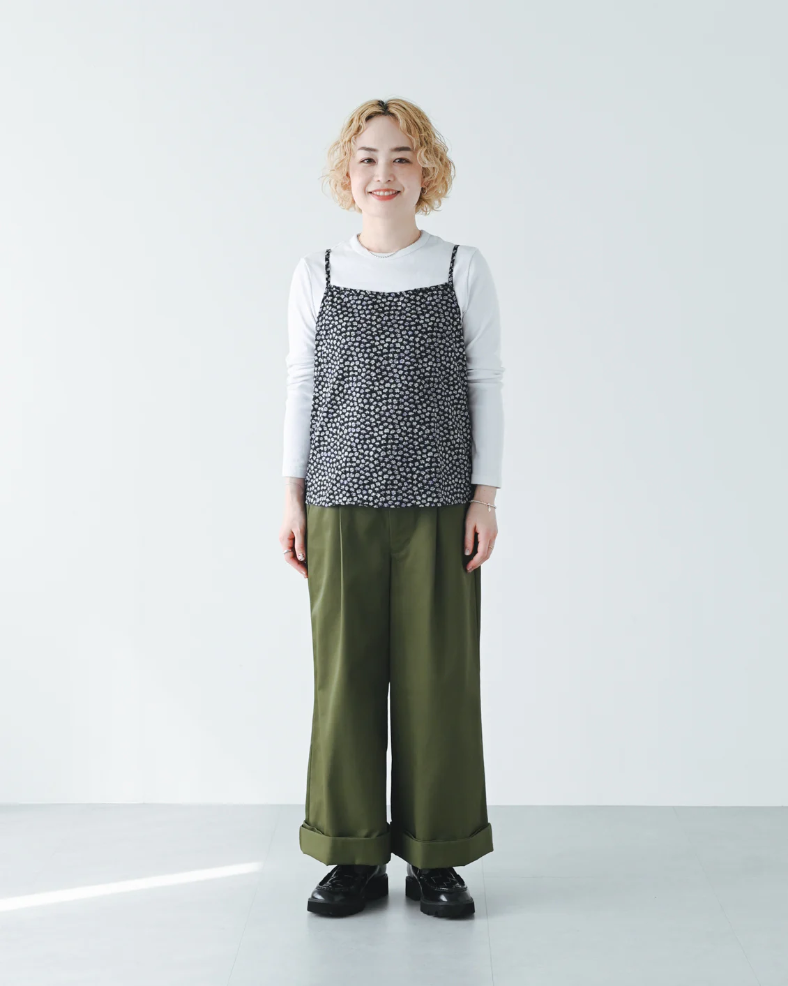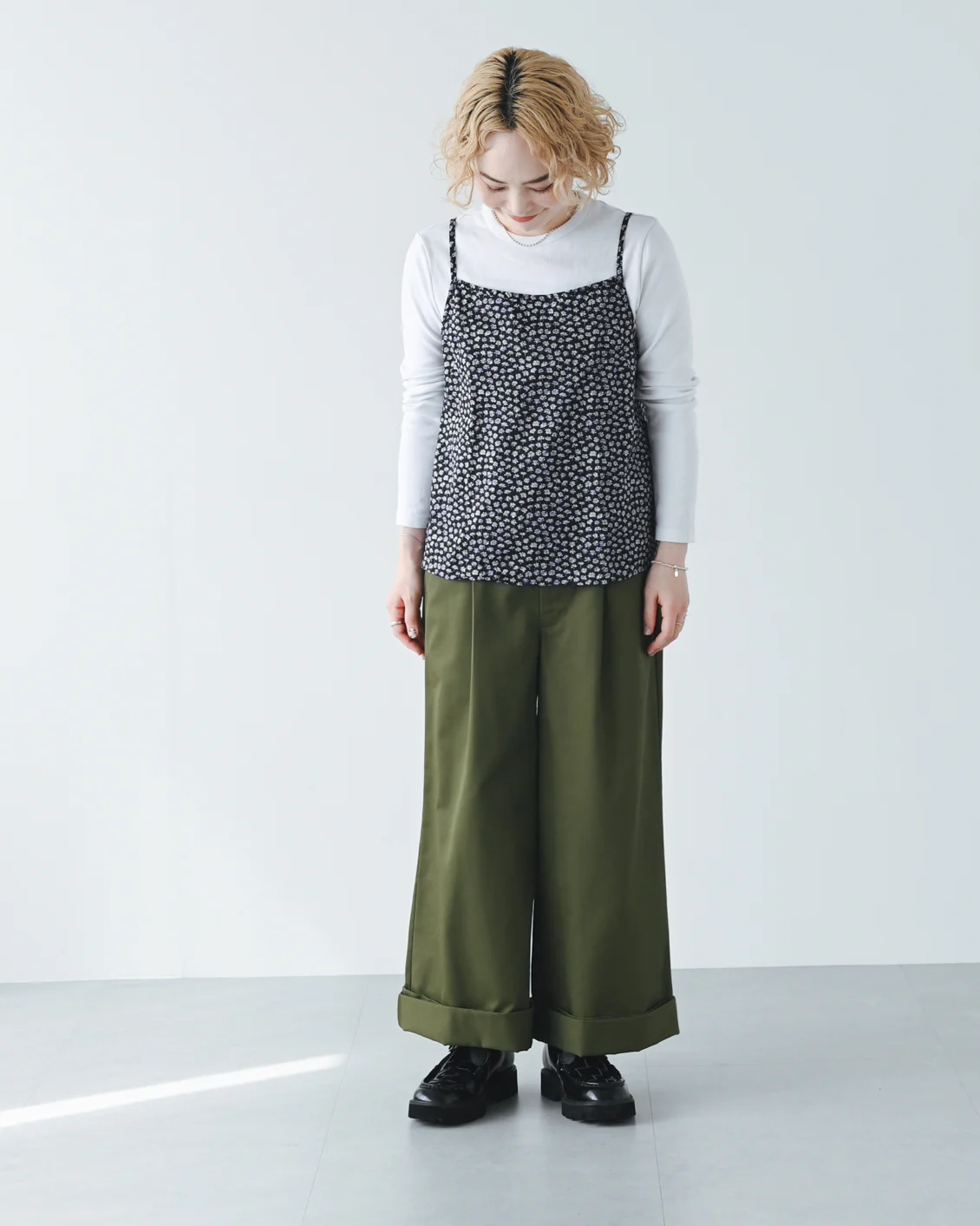 普段あまり太いパンツを選ばないからか、いつものトップスも新鮮な気持ちで楽しめました。小花柄みたいな甘さのあるアイテムもいいバランスになりますね。