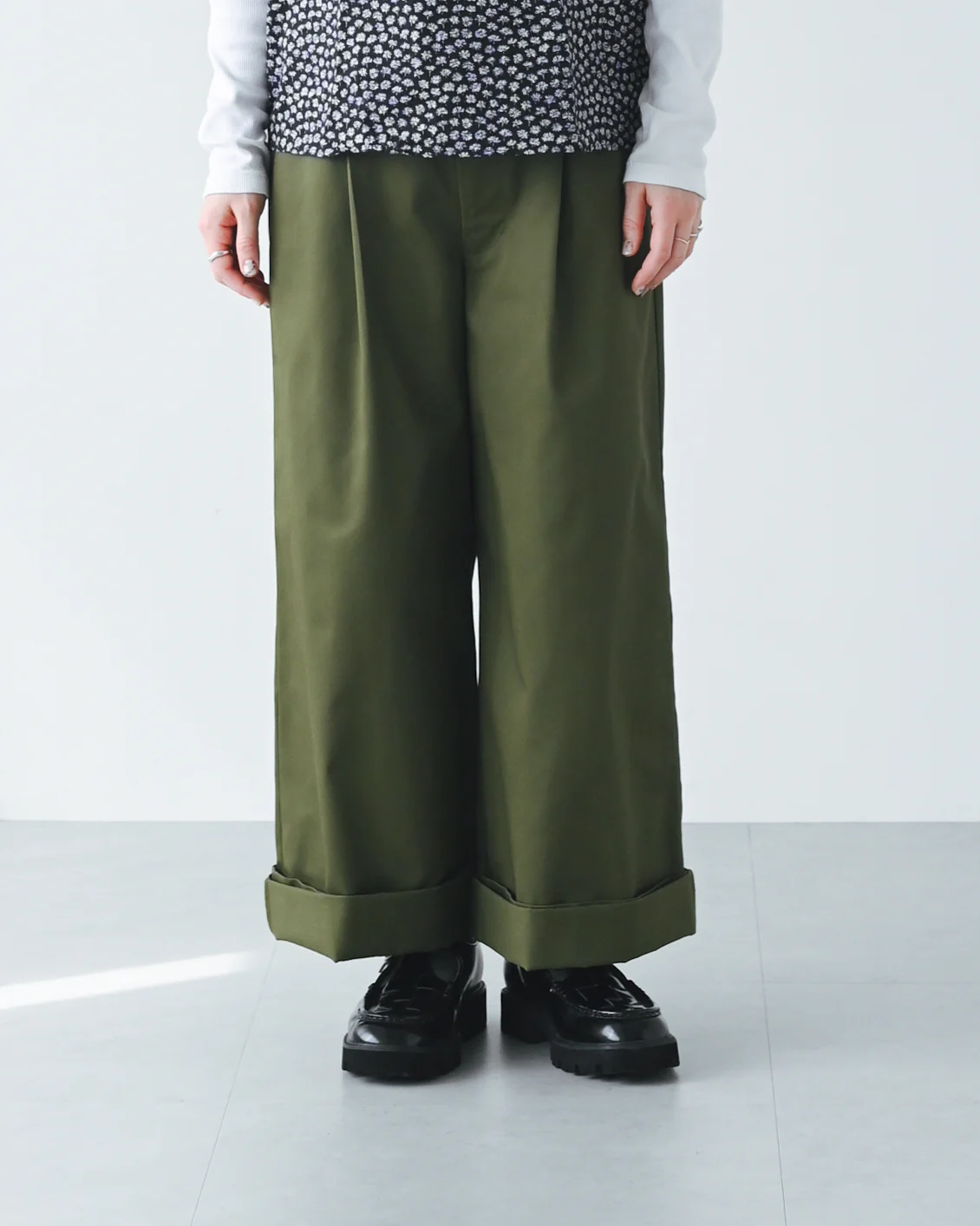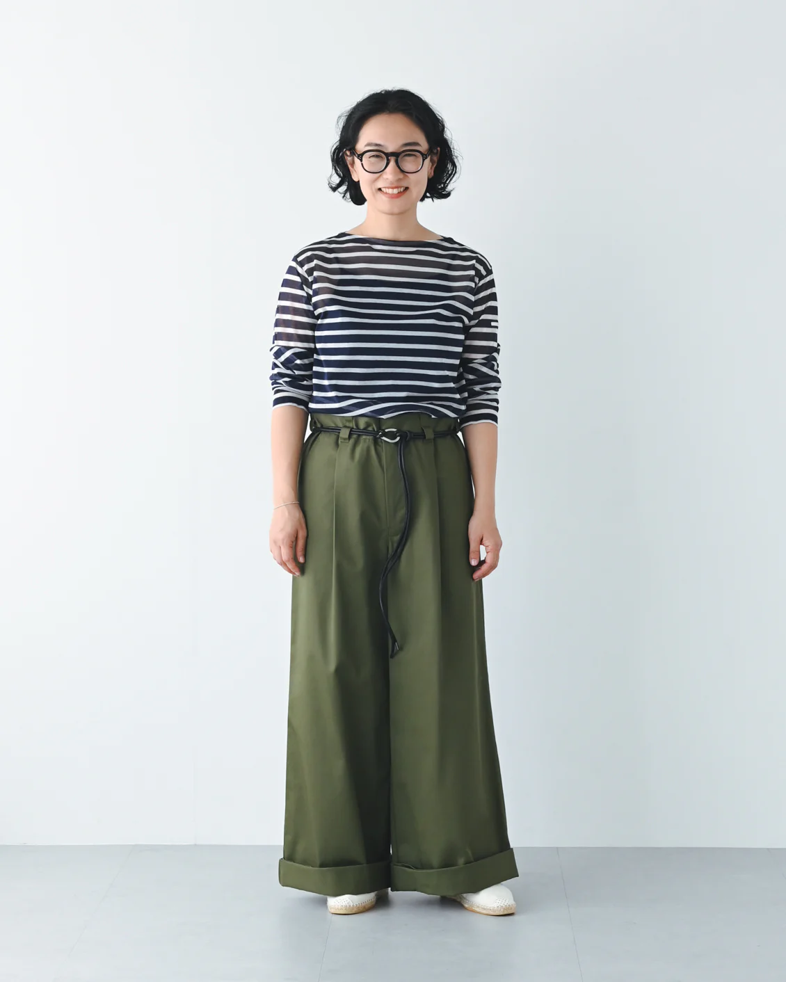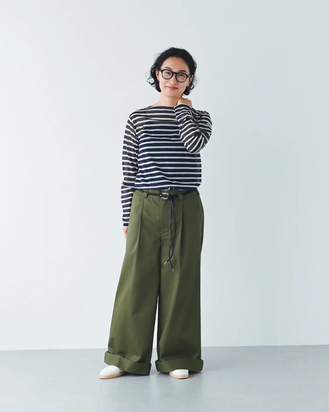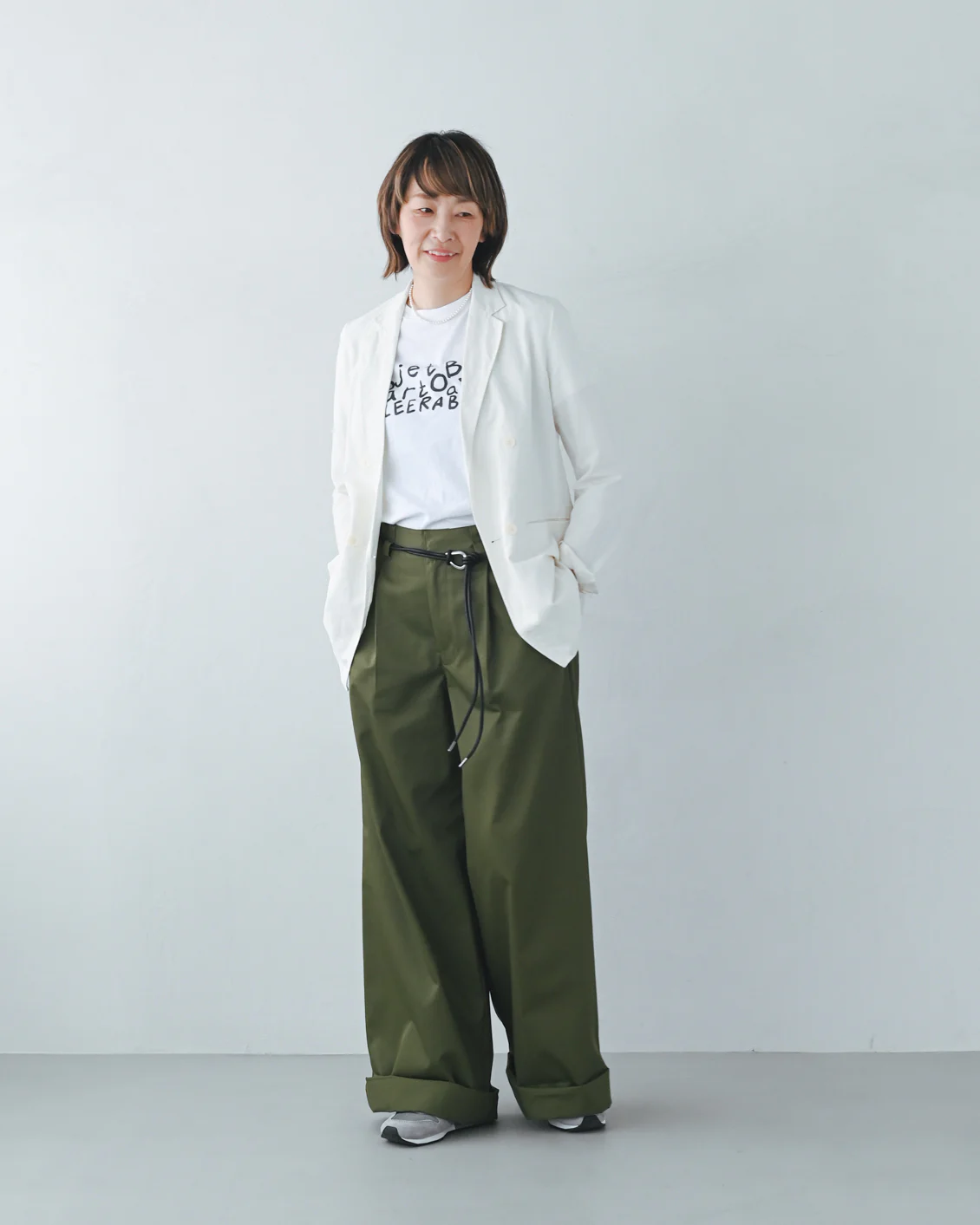 ワイドパンツならではの、空気をはらむ感じもありますね。