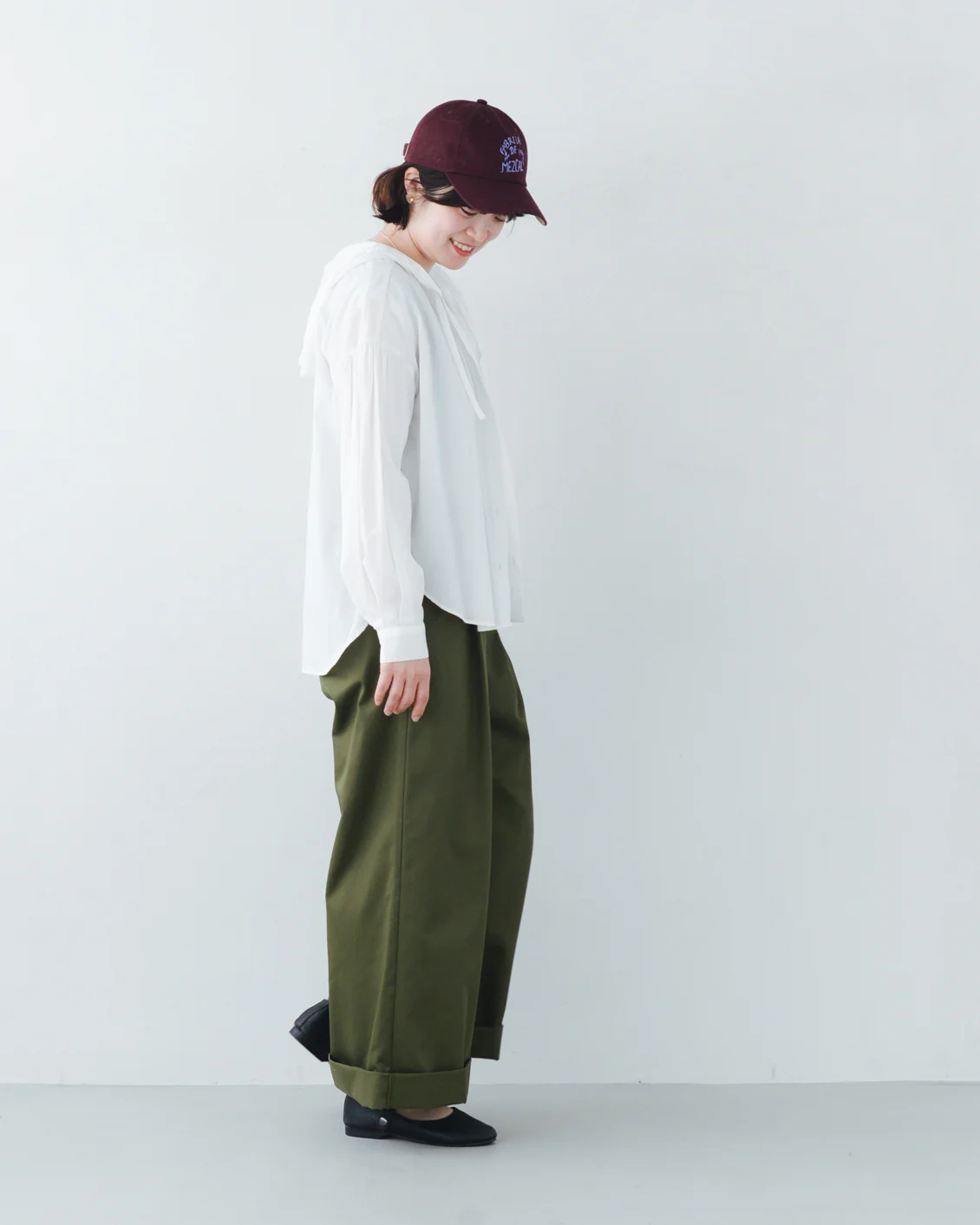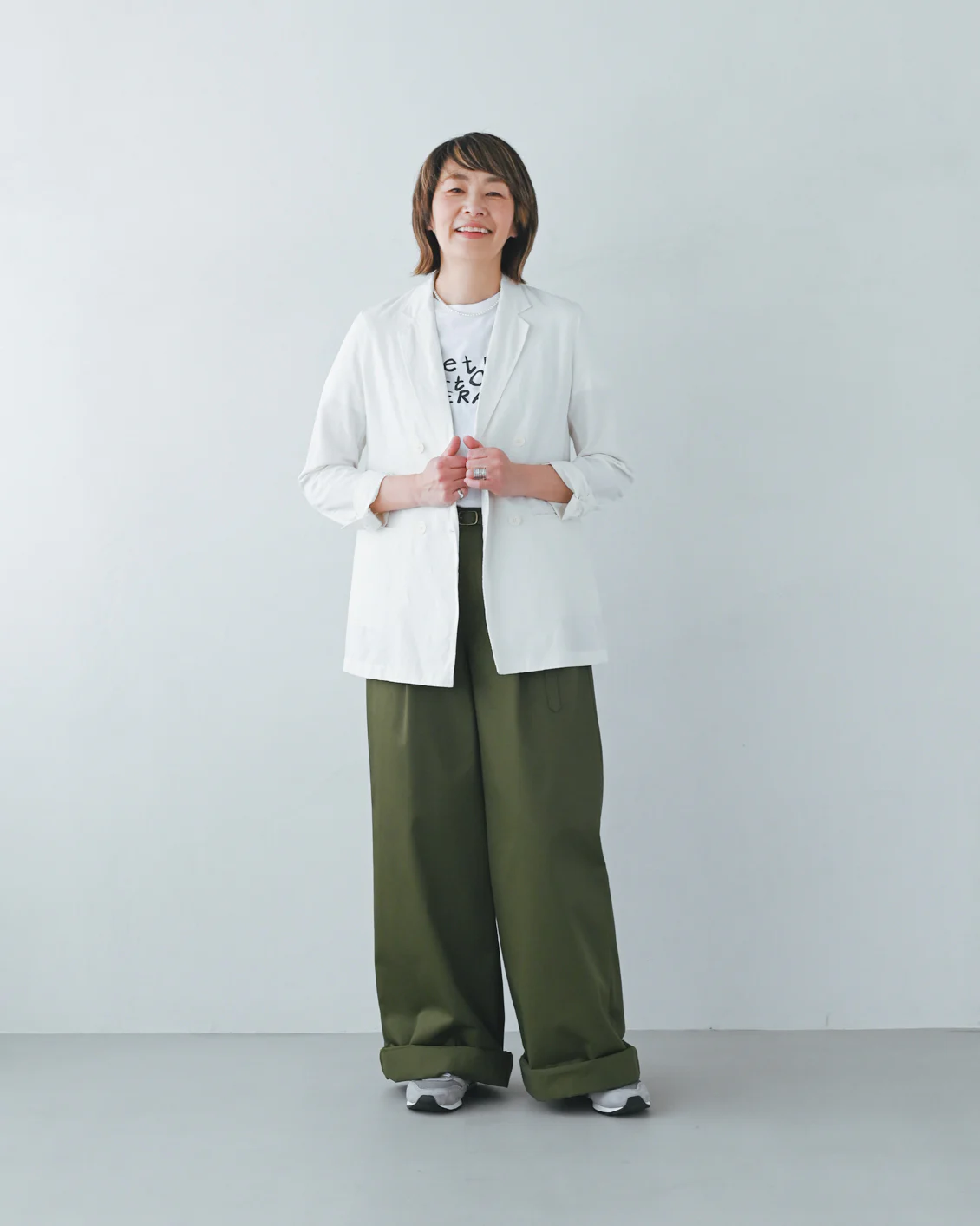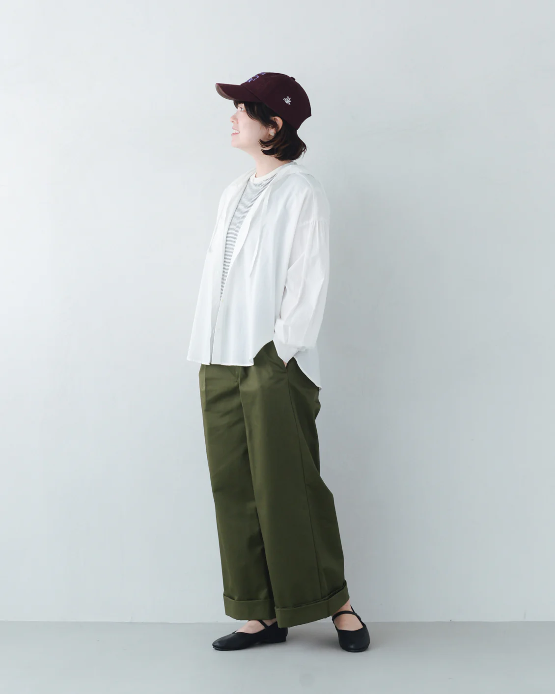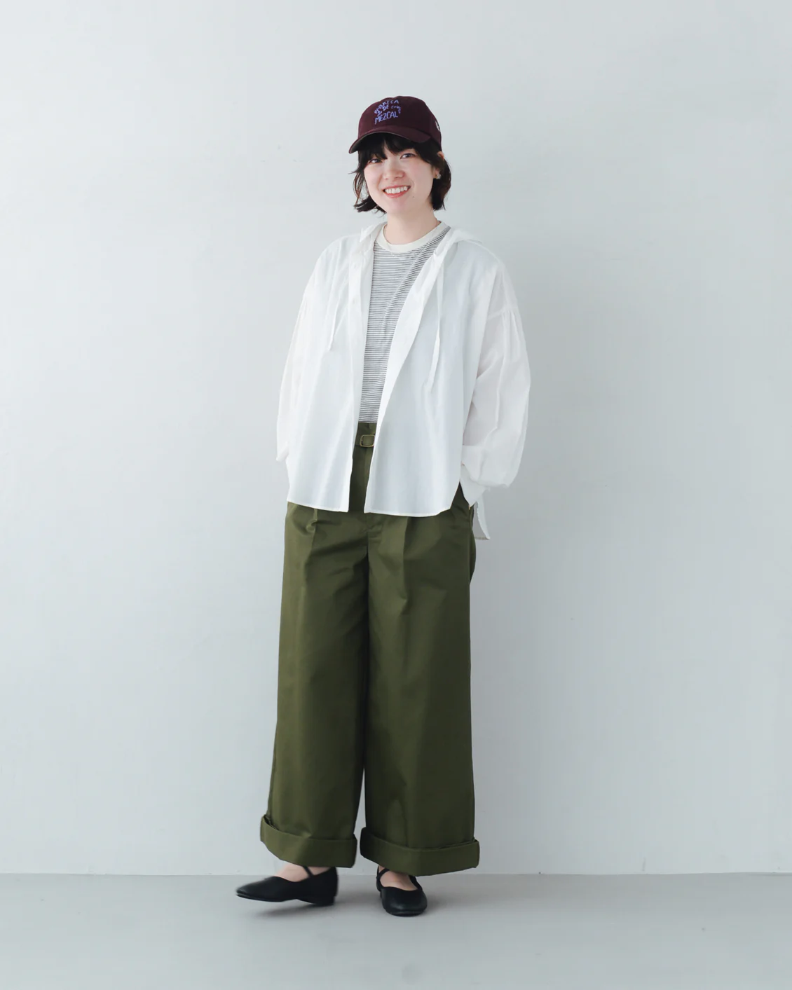 ツヤとハリのある生地で、カジュアルだけど、清潔感のあるきちんとした印象が保てますね」