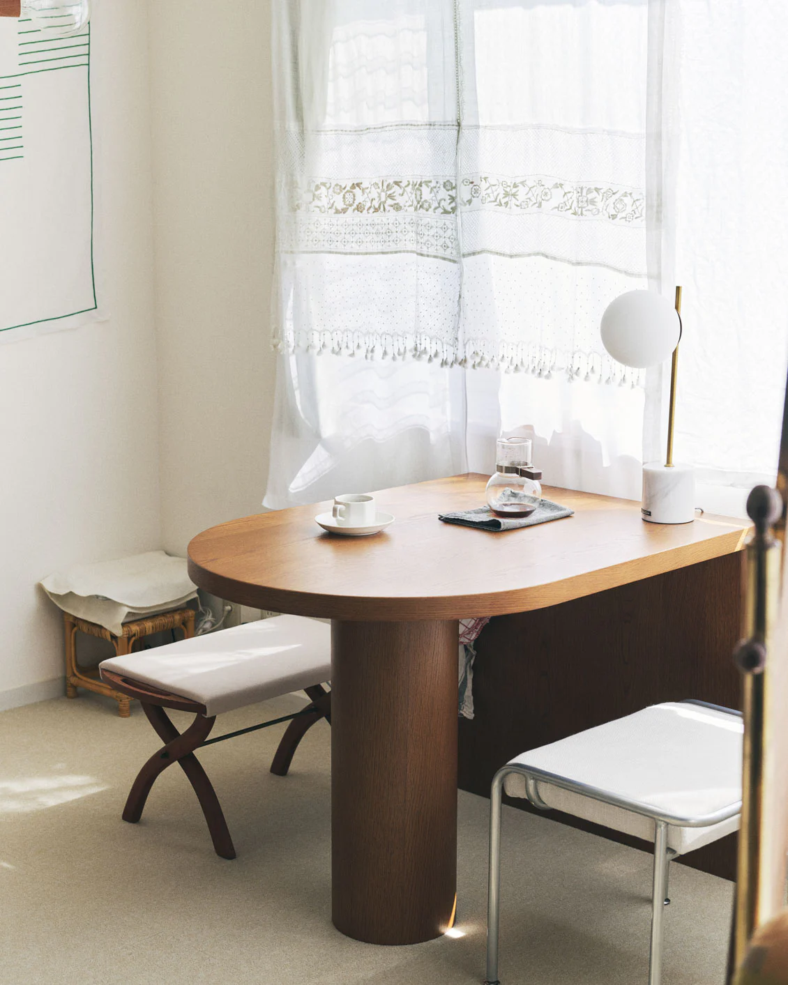 「『JOURNAL STANDARD FURNITURE』のダイニングテーブルは、大きすぎないサイズ感と、脚が板になっているためブラウンの面積が多く、他の木の家具とも馴染むところが気に入っています。