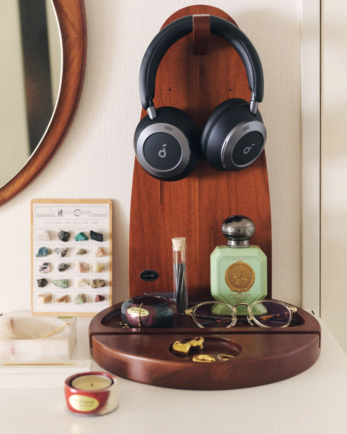『ACME Furniture』で購入したマルチスタンドにはヘッドホンをかけられるようになっていて、アクセサリーや香水もまとめて置いています。バッグもサッと手に取れるようまとめて収納しました。