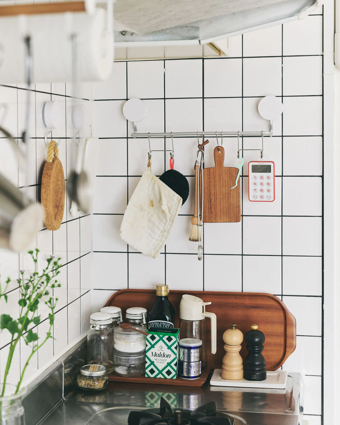 ▲壁に何か飾るときは『マジカルピンフック』で。対荷重が4kgあるうえ、外しても穴が目立たないので賃貸でも安心して使えているそう