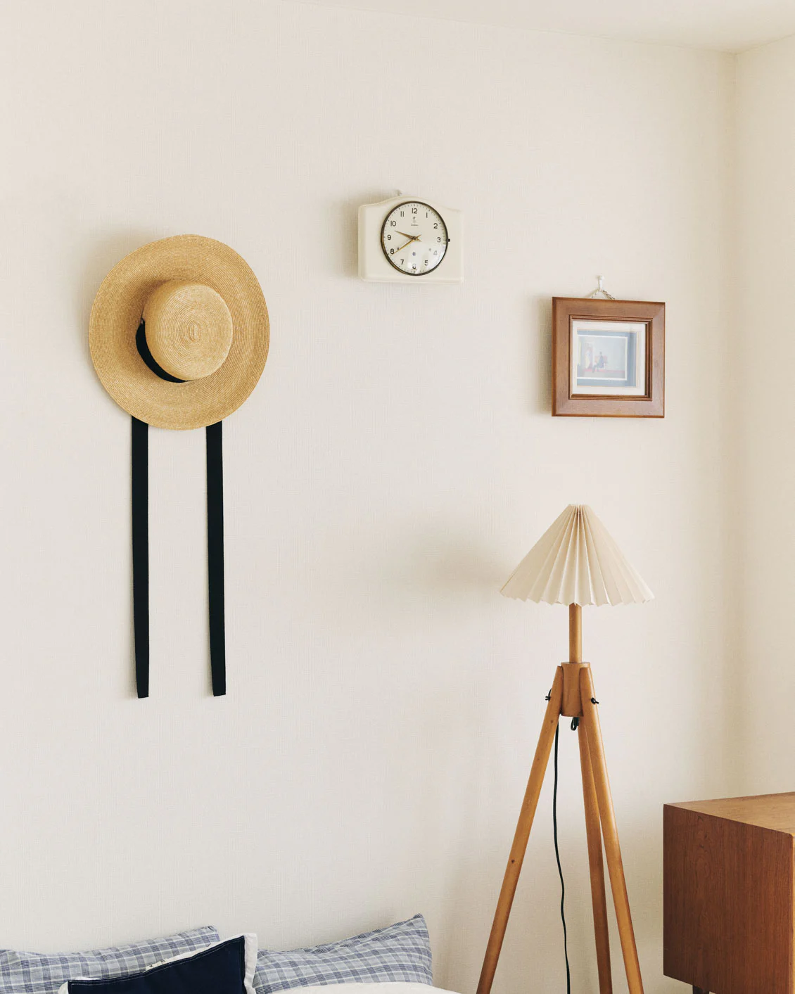 前の家でも壁に色々飾るのが好きで、この部屋でも壁は活用していますね。麦わら帽子、プラスチックの時計、木の額縁と素材の違うものを組み合わせることを意識するとうまくいく気がします」