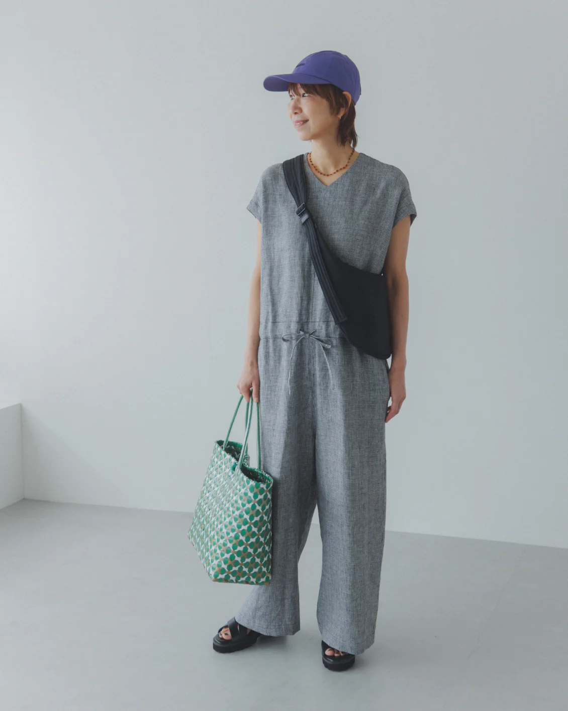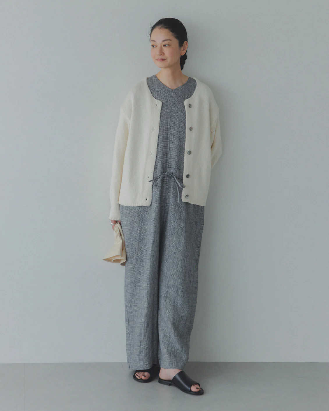 夏場も日差しよけや冷房対策として、カーディガンなどの羽織ものは欠かせなくて。このオールインワンは羽織ものにも合わせやすいデザインと色合いなので、その点も重宝しそうです」▲ウエストの絞り具合で好みのシルエットや着丈に調整できる仕様です。「わたしはあまり絞らずにストンと着るのが好きですね」と奥田さん