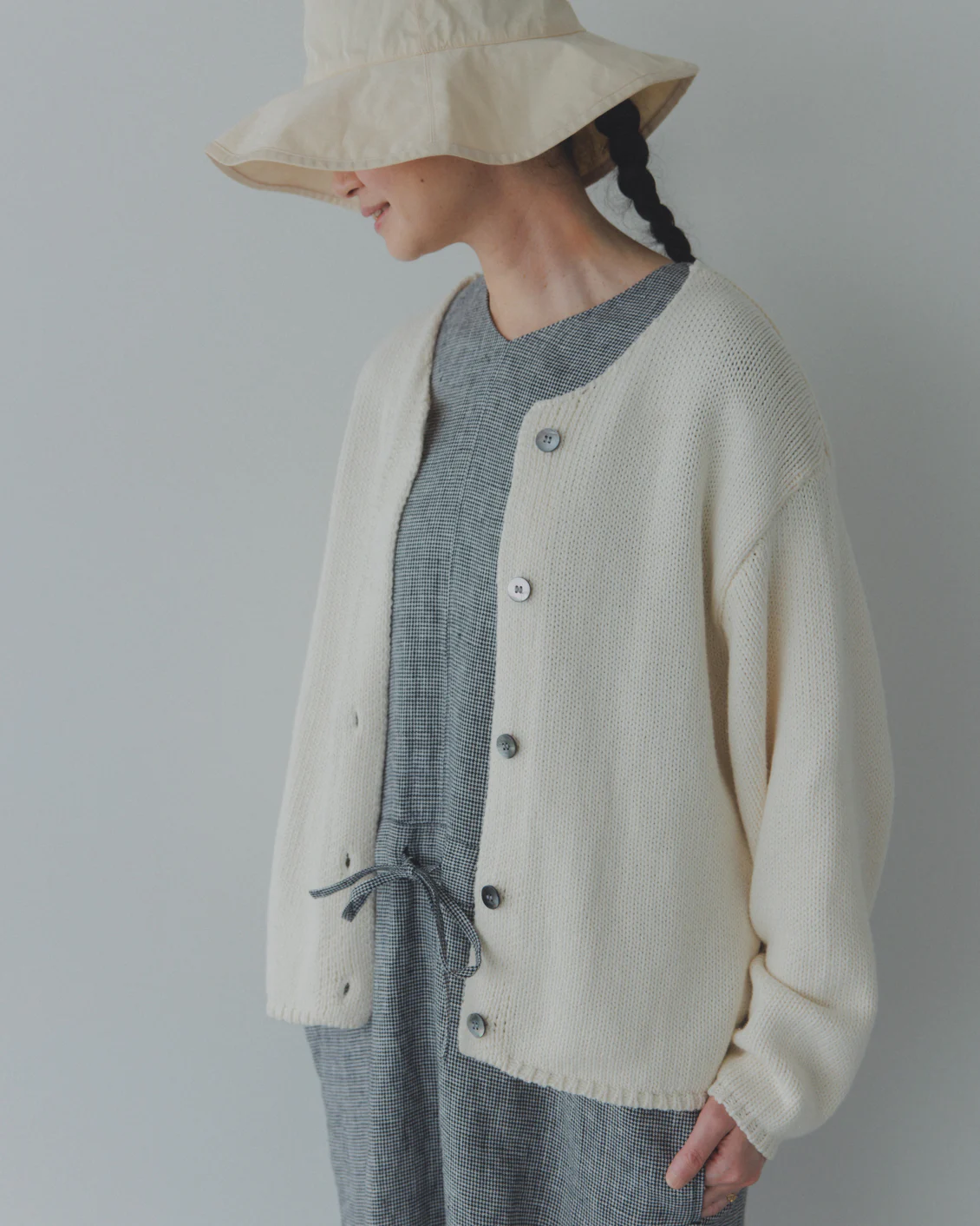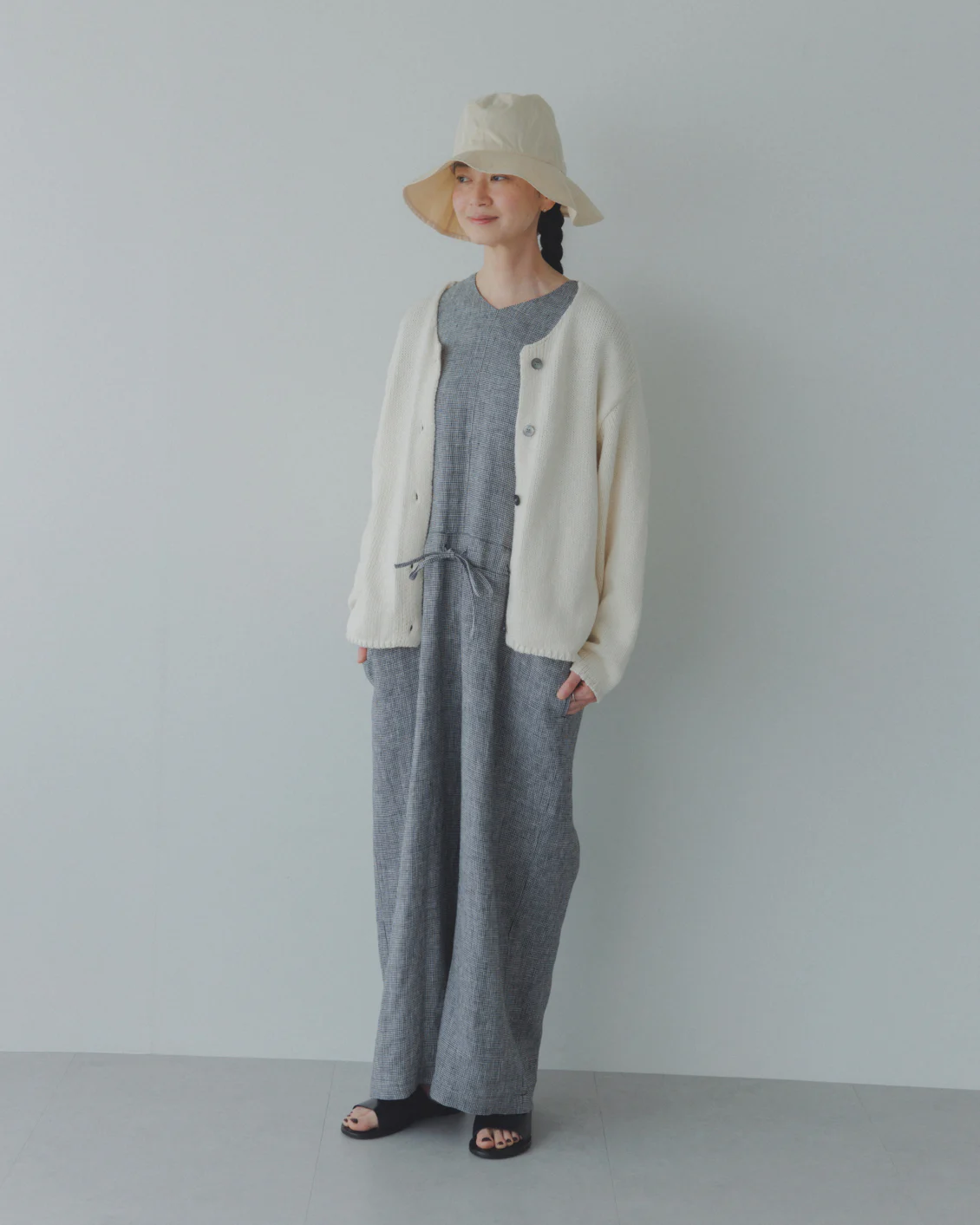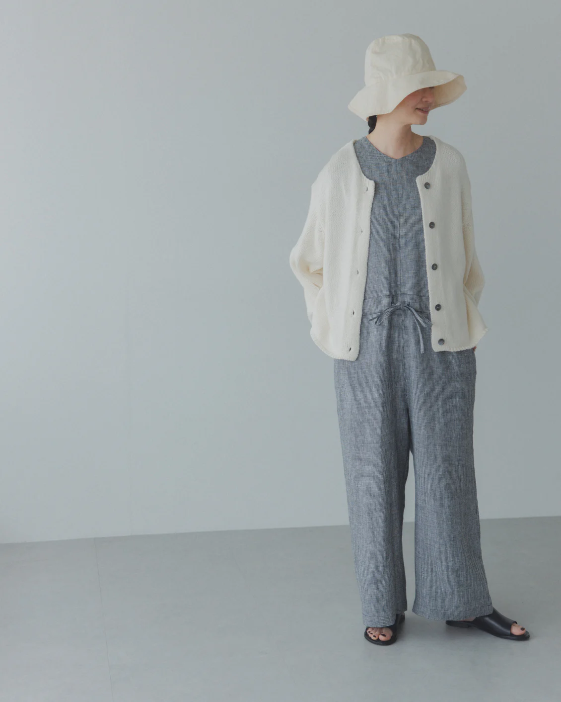 まずはコラボアイテムの「千鳥柄のリネンオールインワン」に、アイボリーのカーディガン(かぐれ / コットンローゲージショートカーディガン)*とハット(奥田さん私物)と合わせたコーディネートを。