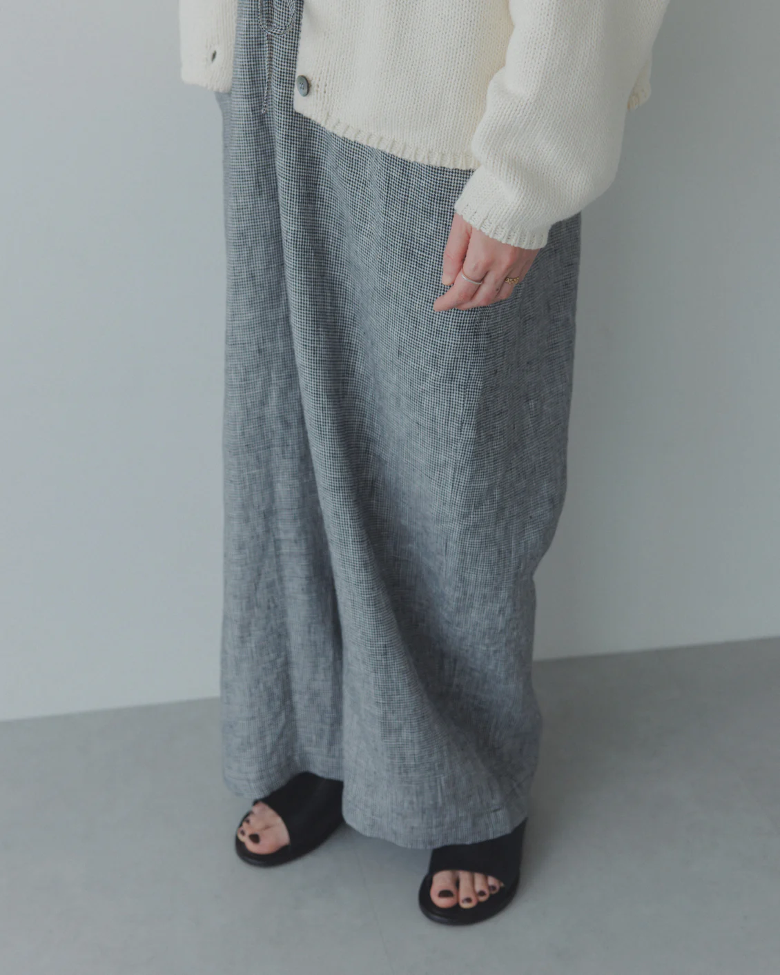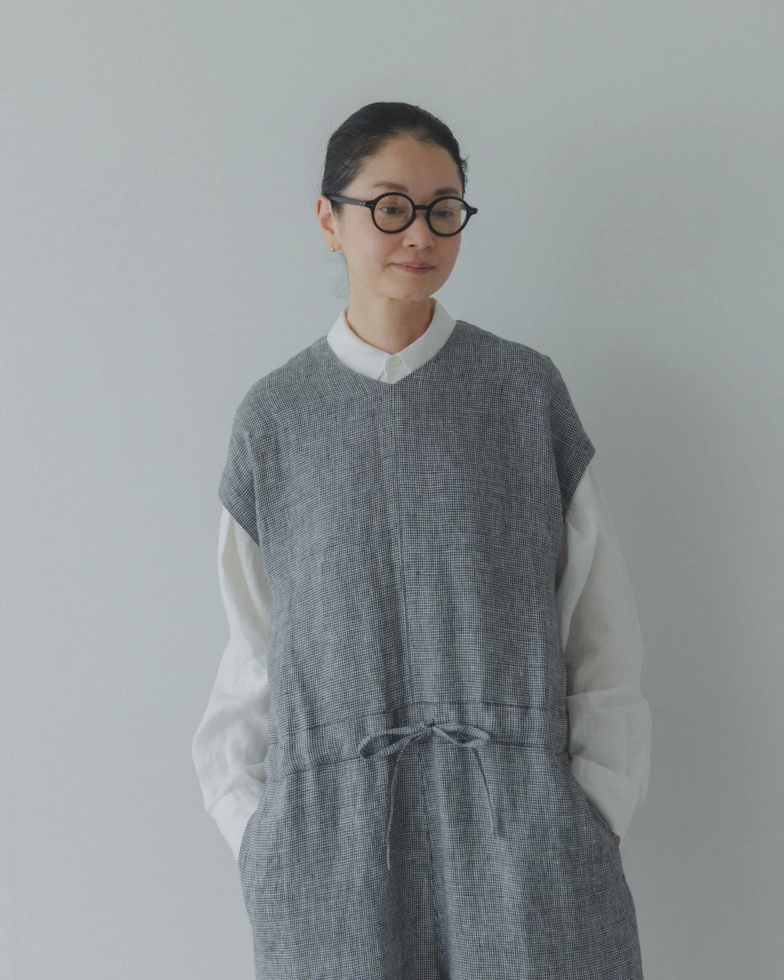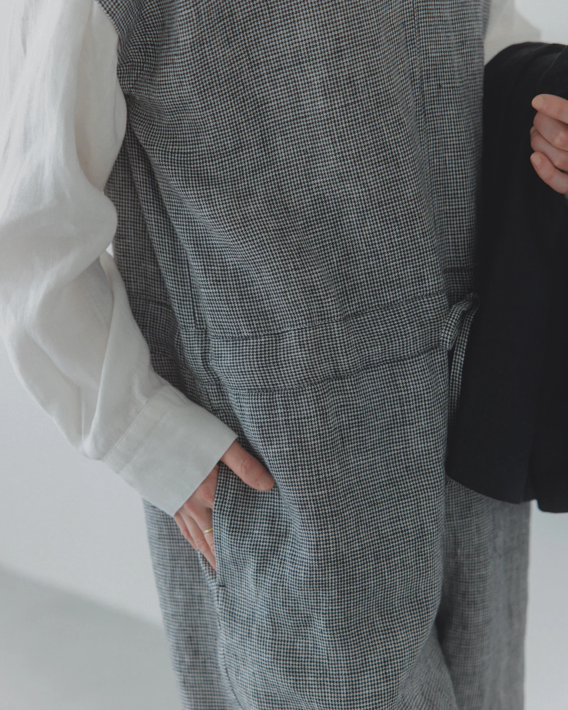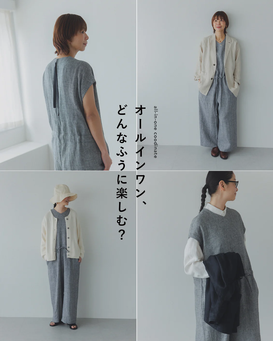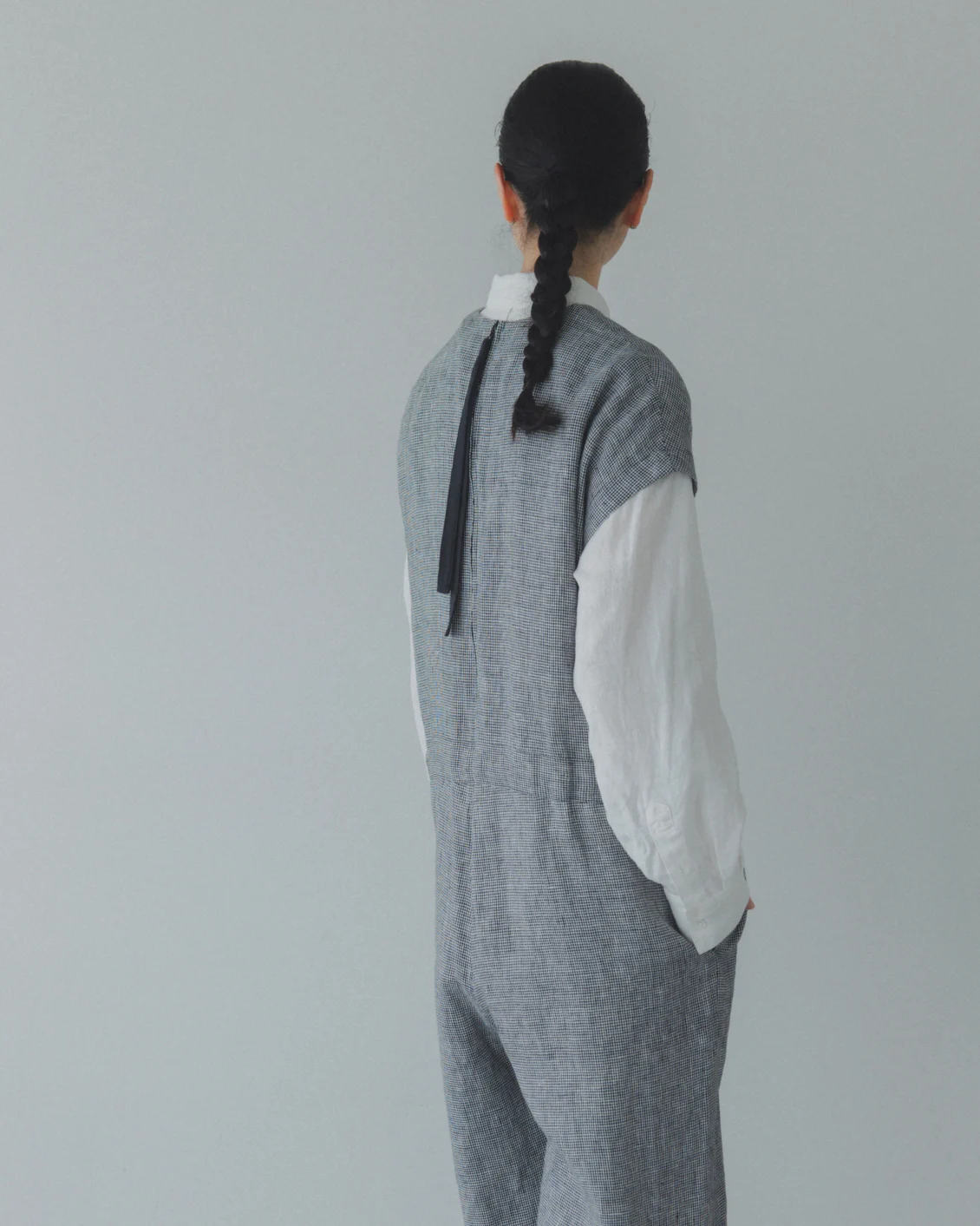 かぐれと一緒につくった、「後ろ姿に、アクセント」千鳥柄のリネンオールインワン。身長やお好みの着丈に合わせて選べる「S・M・T」の3サイズをご用意しています。