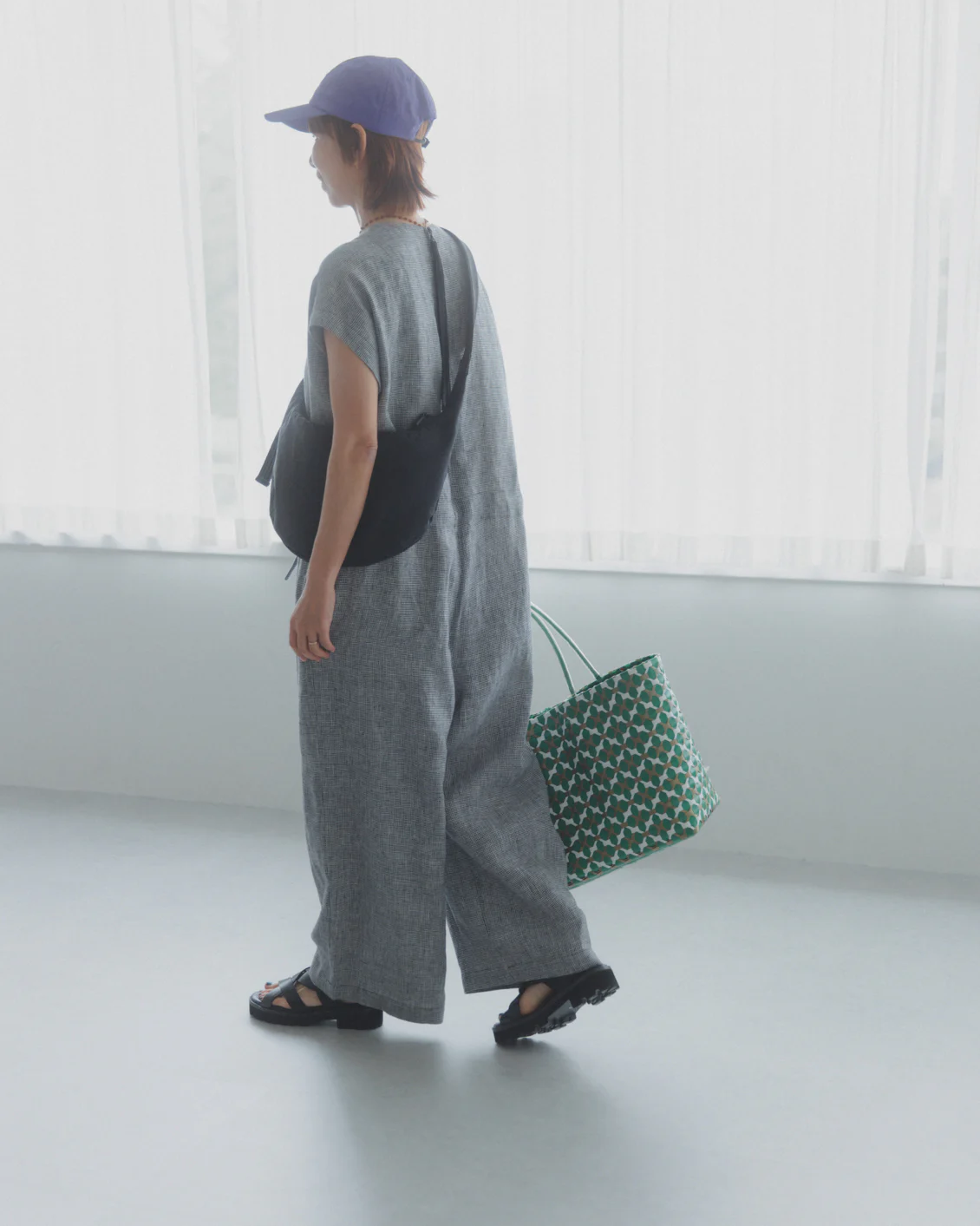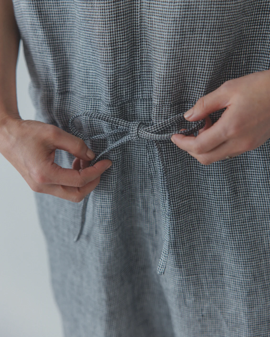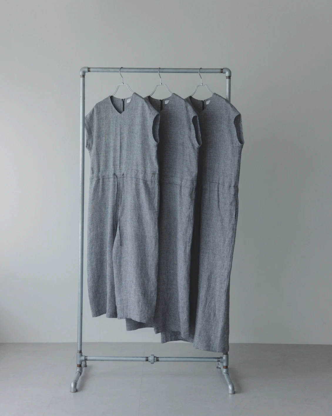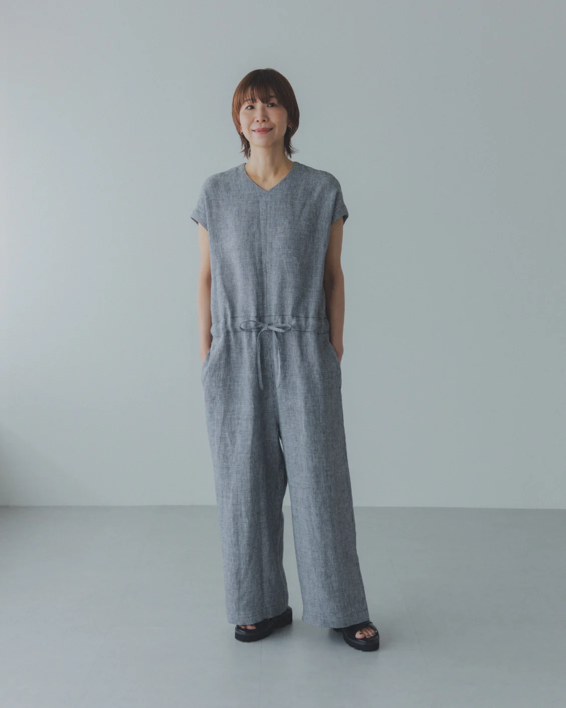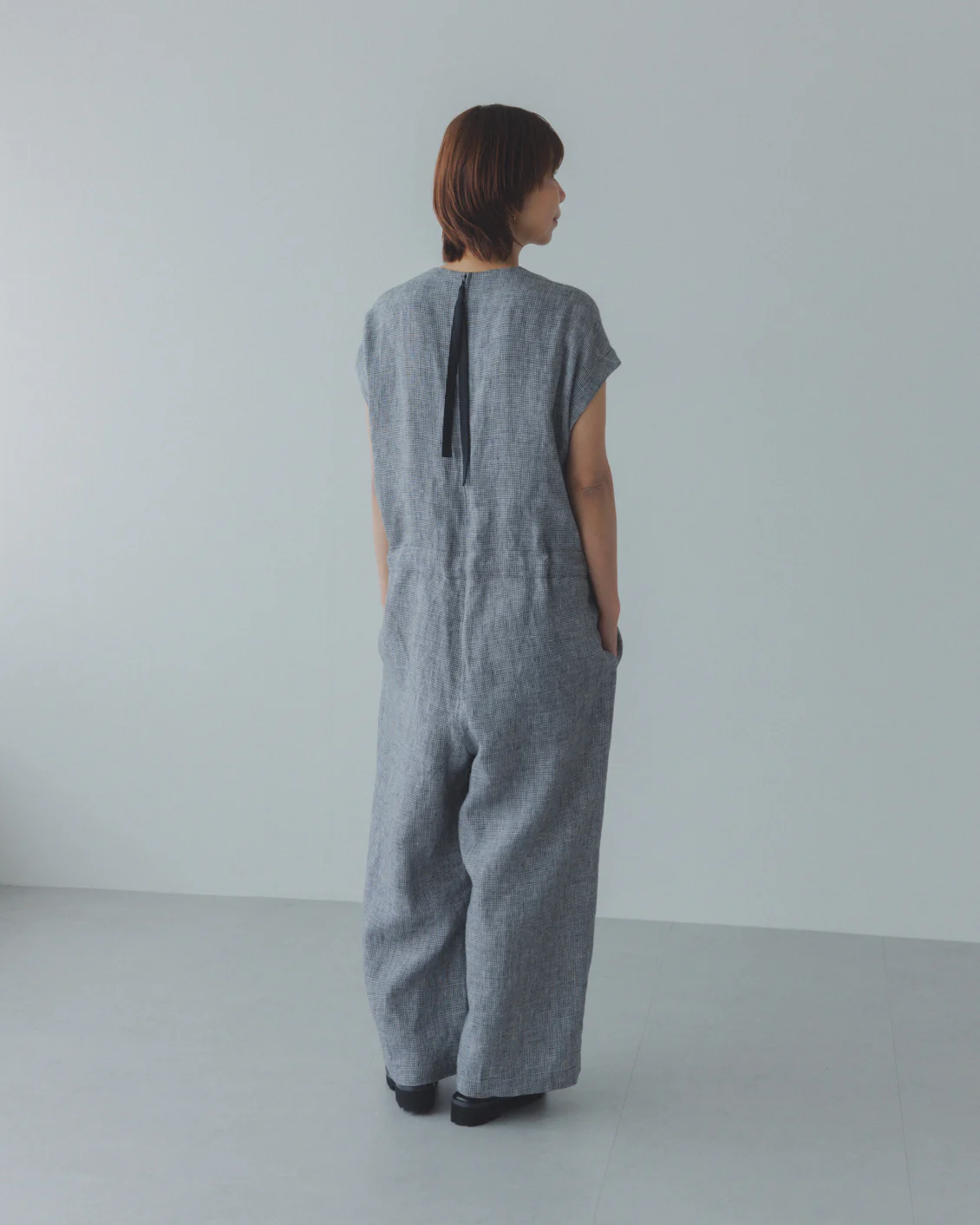 かぐれと一緒につくった、「後ろ姿に、アクセント」千鳥柄のリネンオールインワン。身長やお好みの着丈に合わせて選べる「S・M・T」の3サイズをご用意しています。