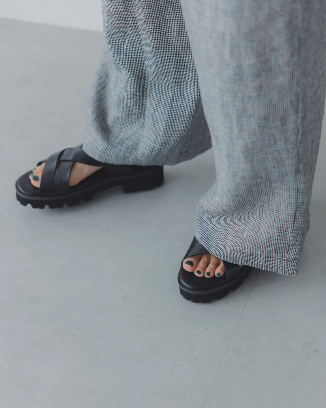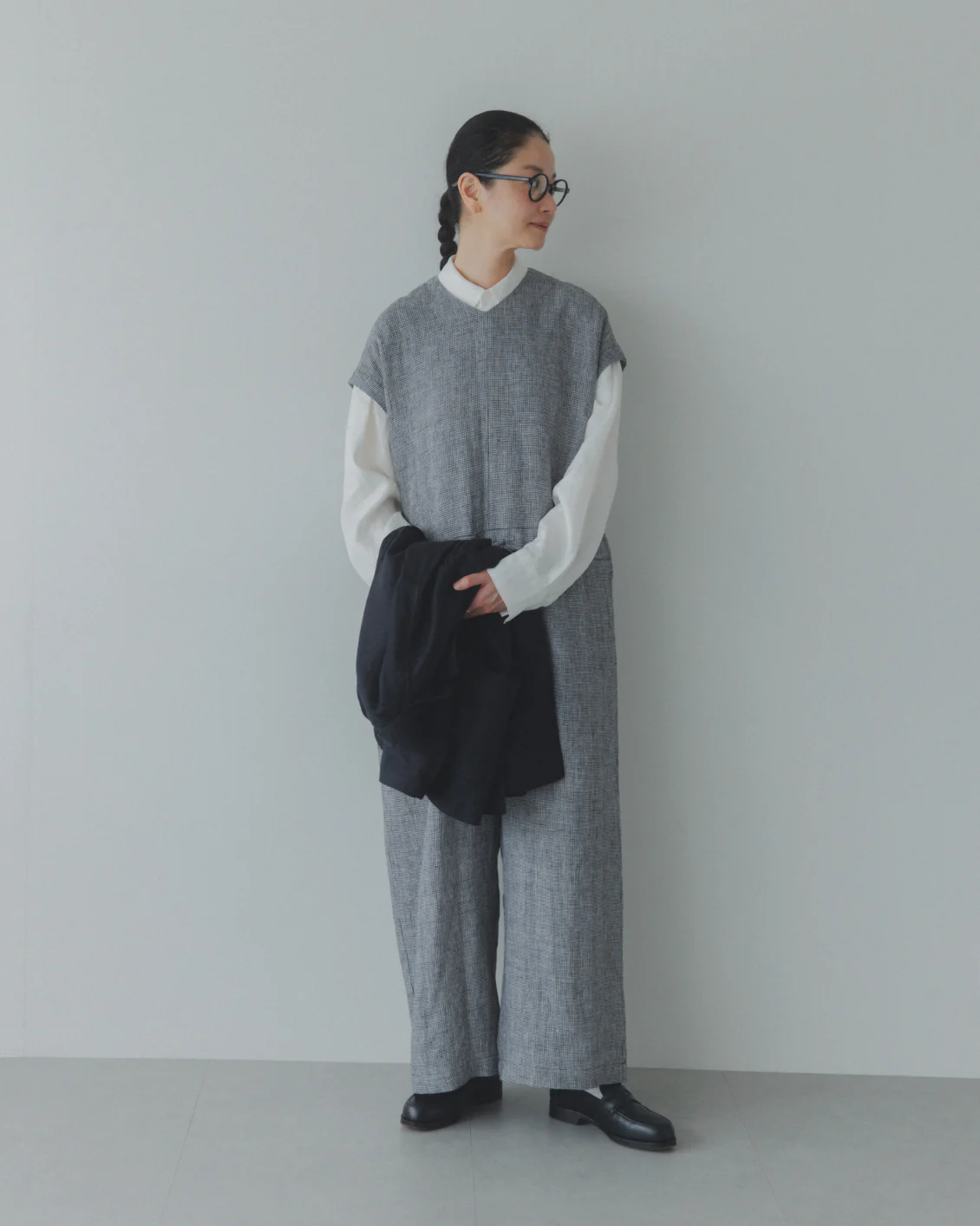 リネン100%のほどよい厚みの生地で、透け感も気にならず、さらにニュアンスのある千鳥柄なのでシワも気になりにくいのがいいなと思います」▲足元は黒のローファーと、白靴下で。モノトーンのコーディネートも楽しめるオールインワンです