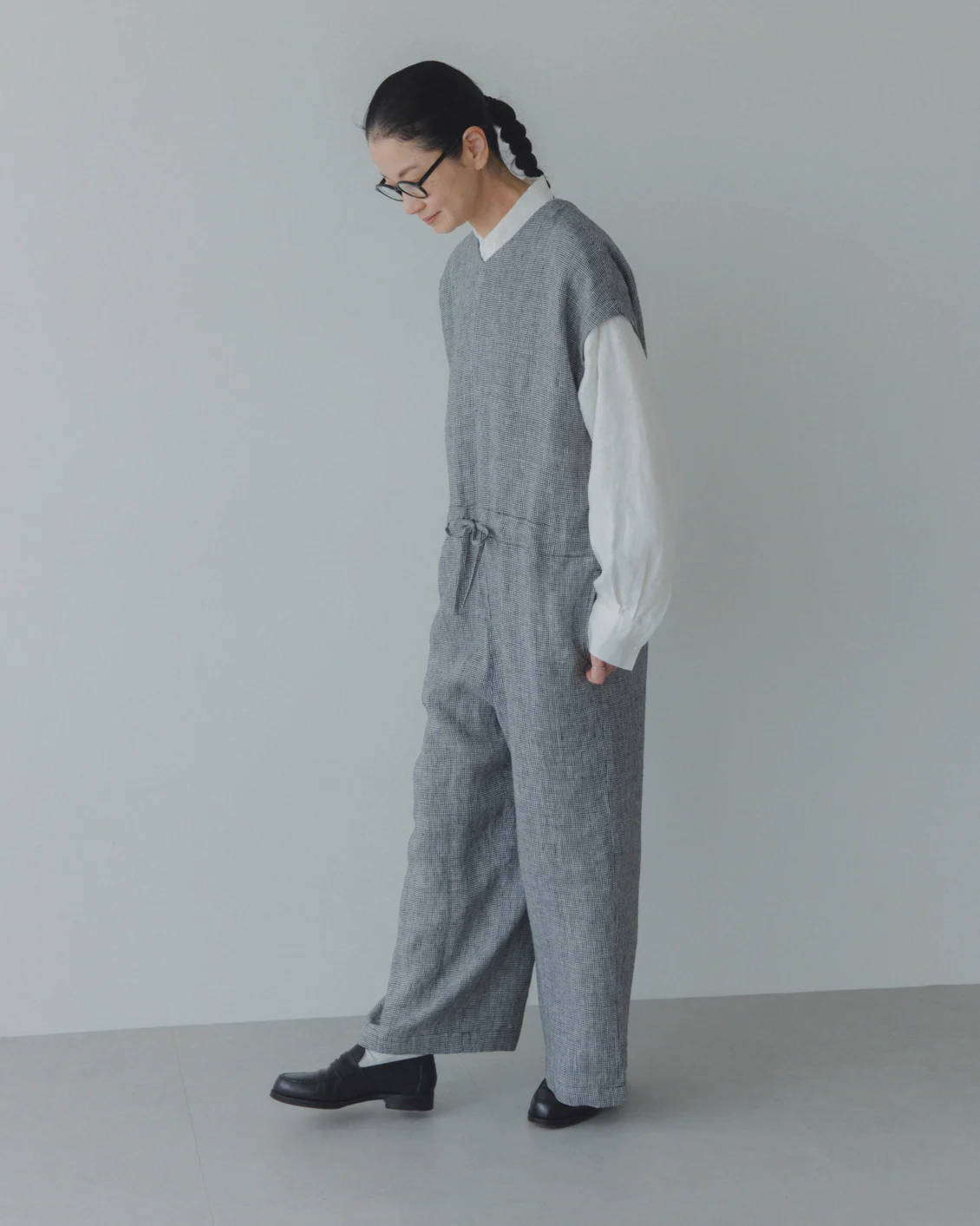 そこで、そのオールインワンをヒントに、当店らしいディティールを加えた生まれたのが、今回の第二弾コラボアイテム・千鳥柄のリネンオールインワンです」