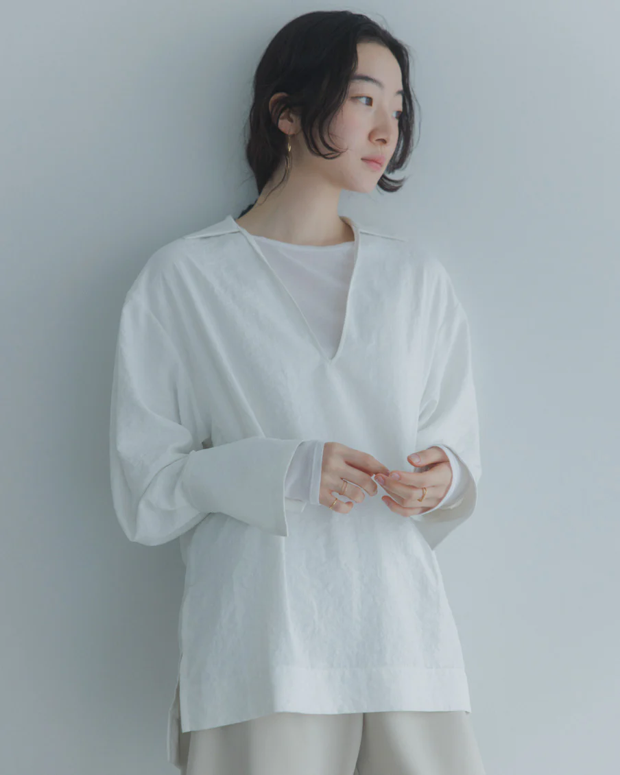 袖口には伸縮性のあるループをあしらい、さっと腕まくりをしたときにも自然なニュアンスが生まれます。