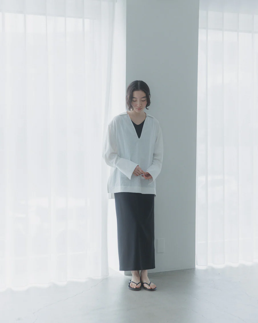一枚さっと着るだけで整うように、やわらかく体から離れつつも、どこかすっきりと見える形を目指しました。