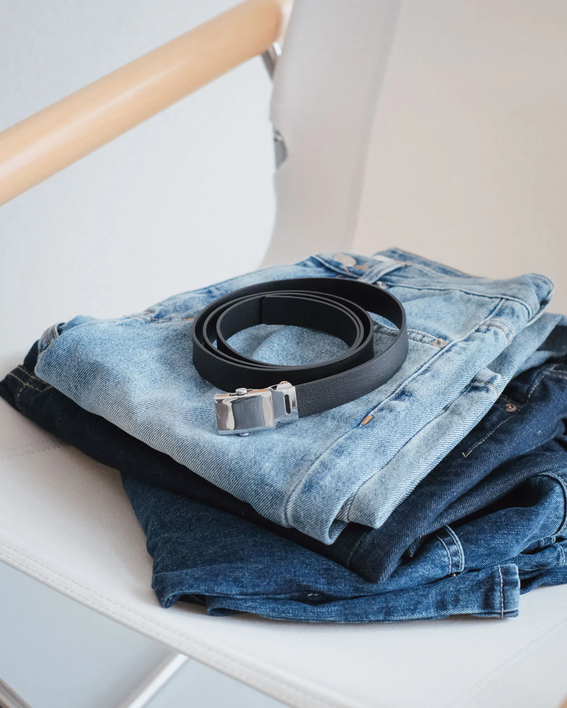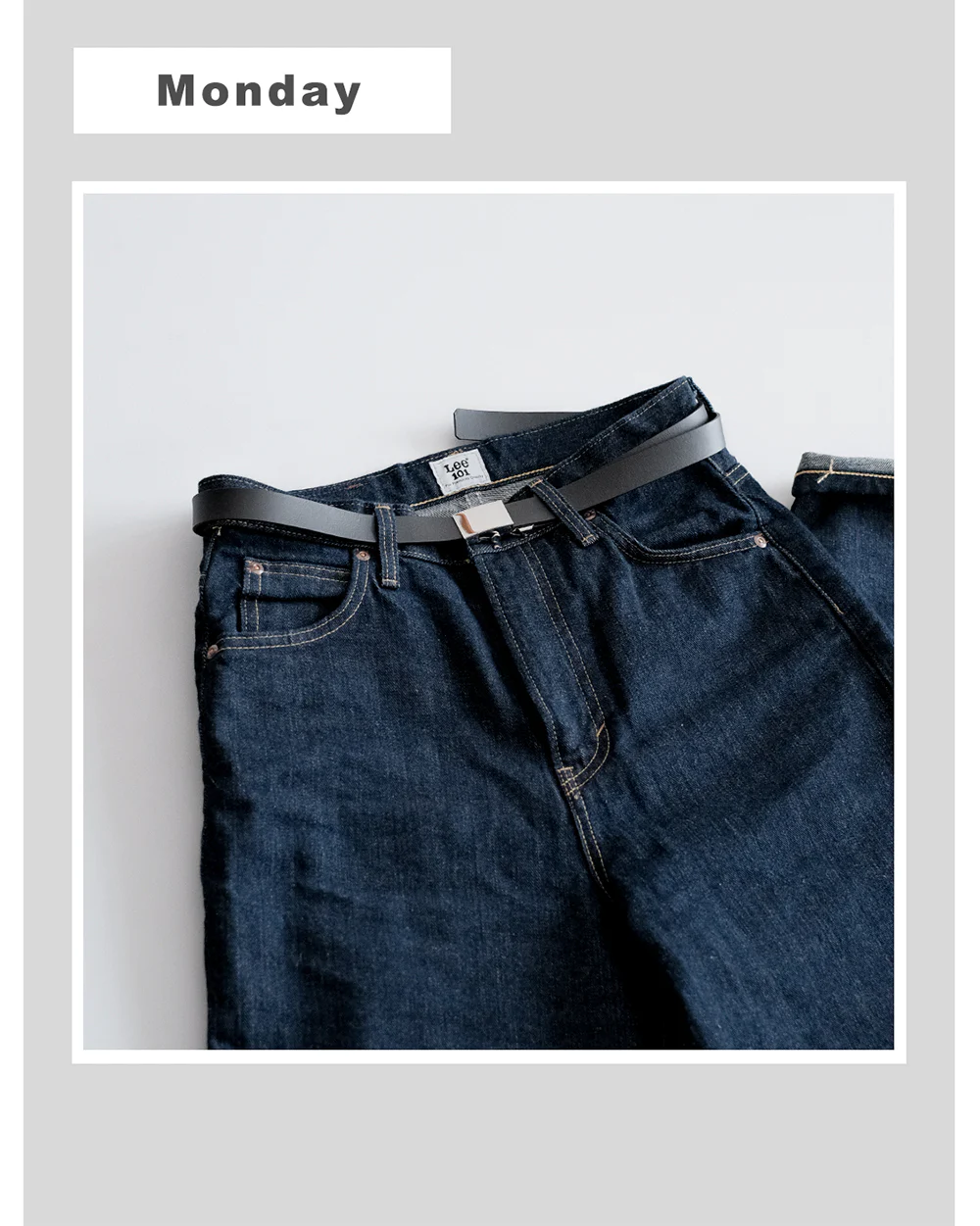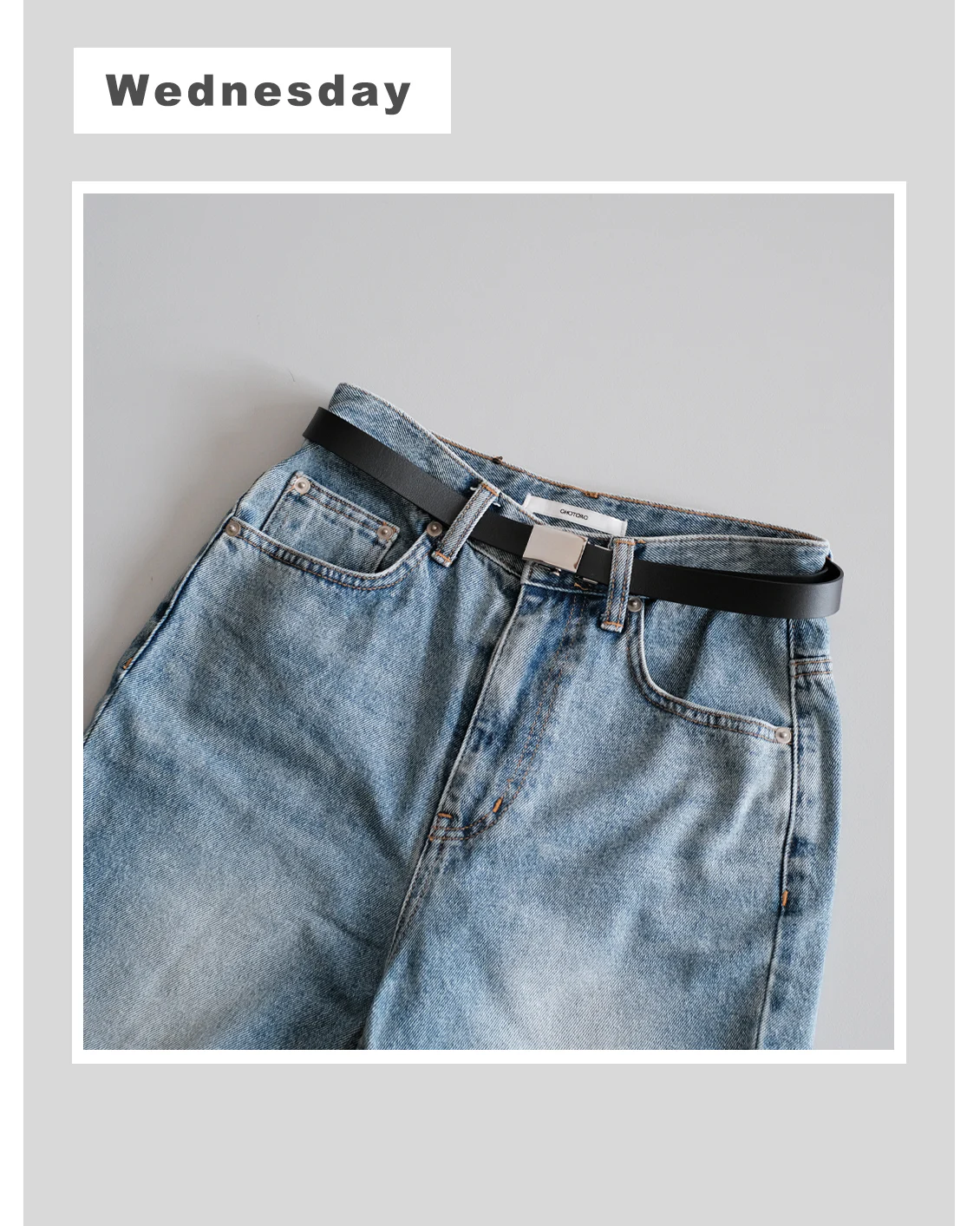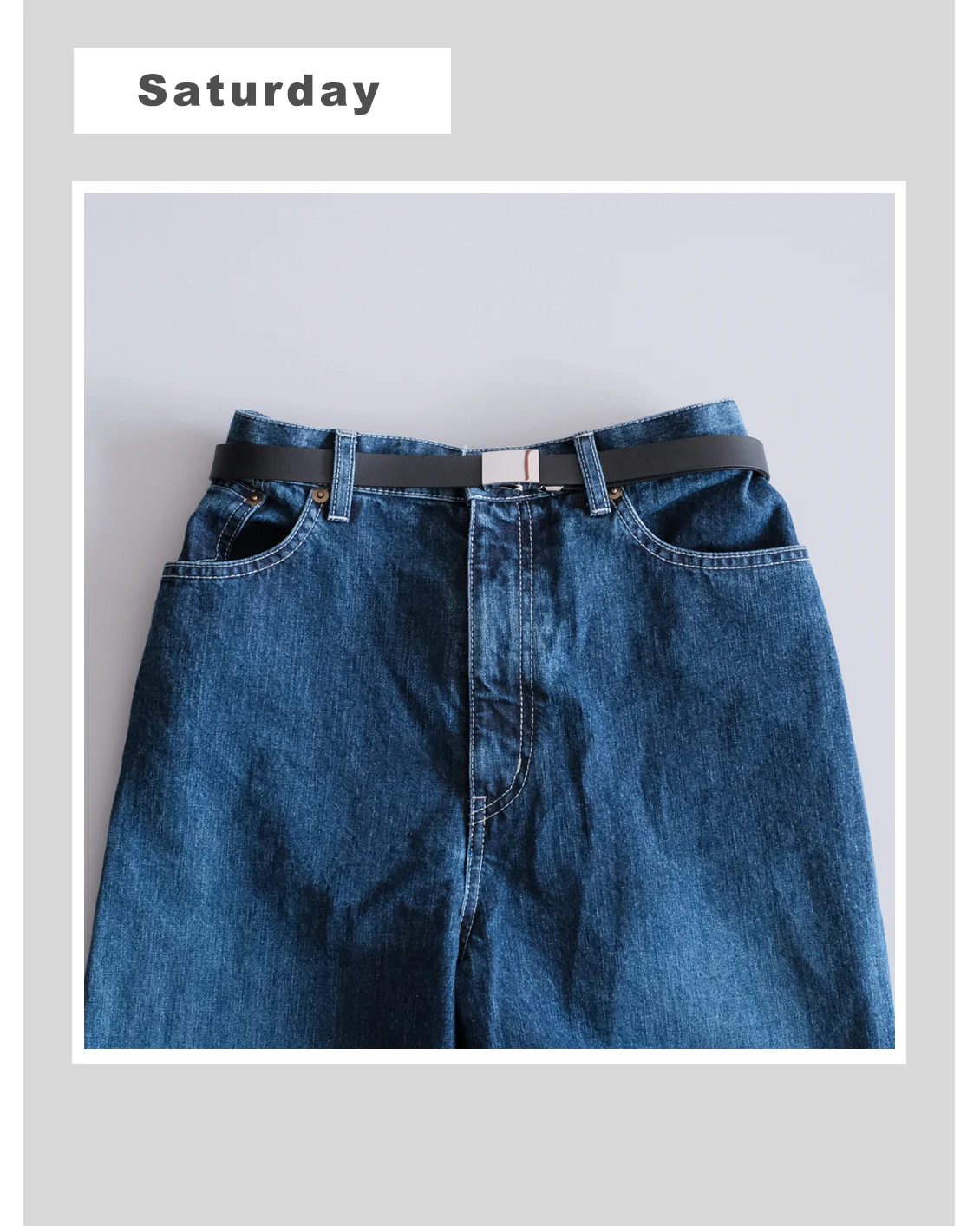 ベルトと淡色のデニムとの合わせは、一つ前のコーデとはうって変わってベルトがよく見えて、はっきりとメリハリを作ってくれます。