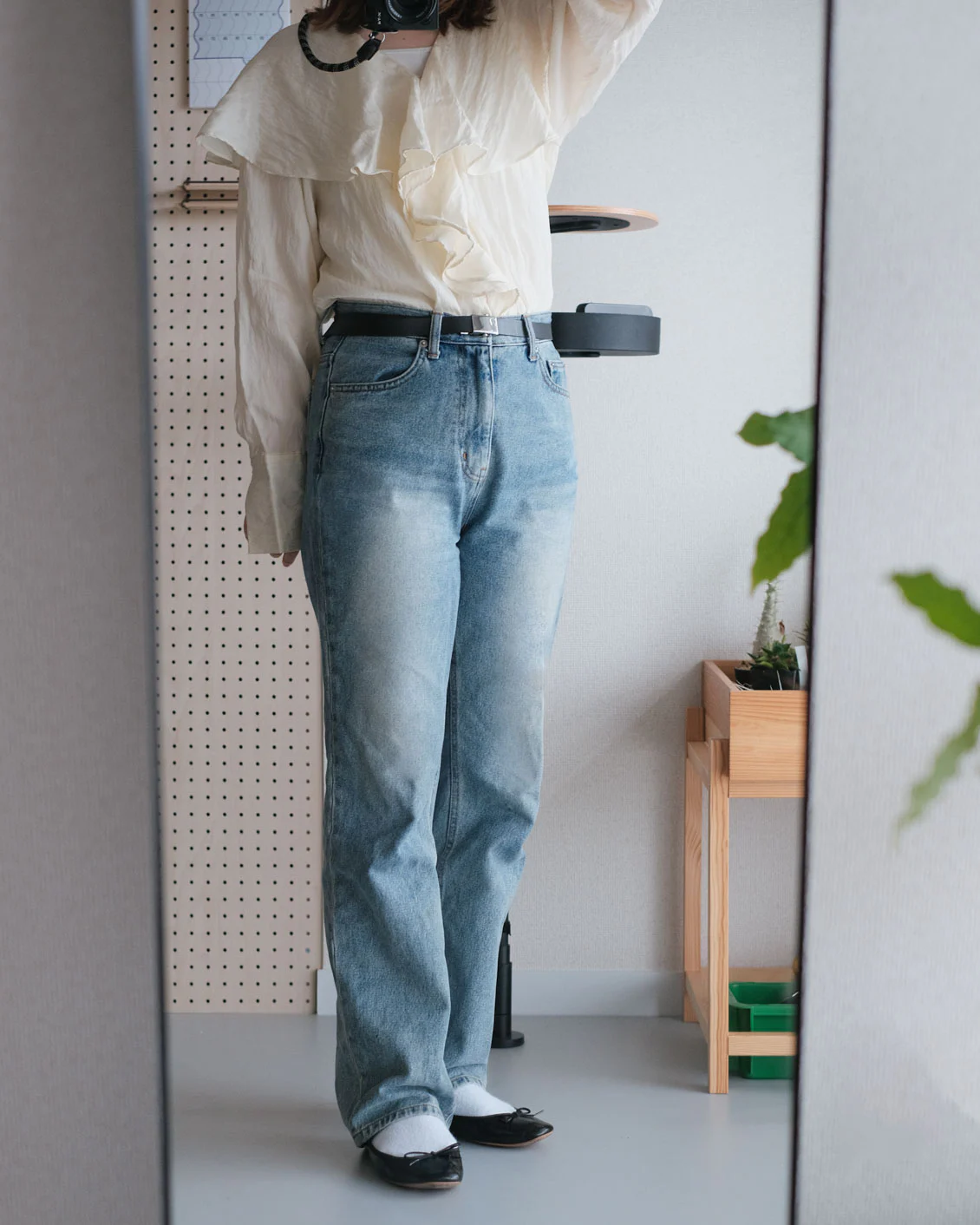 この日はフリルのブラウスやバレエシューズと合わせて、甘辛コーデにしてみました。