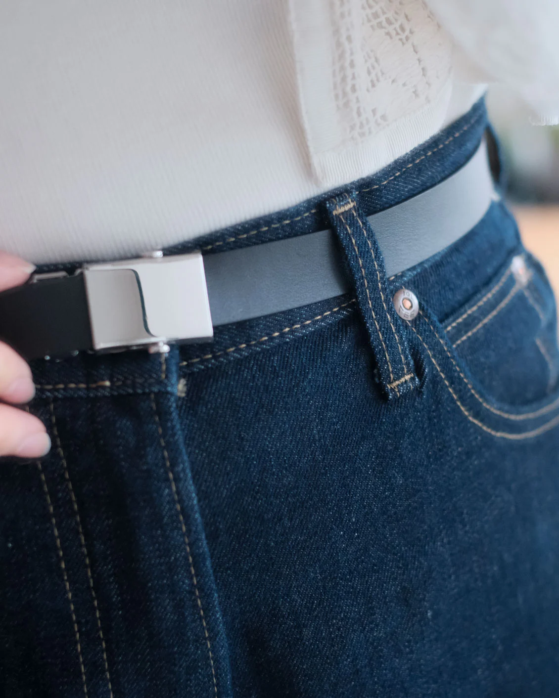太すぎず、細すぎずのベルト幅の抜け感が、ストイックになりやすい細身のデニムに、ちょっぴりフェミニンなニュアンスを足してくれる感じがしてこの組み合わせもお気に入りです。