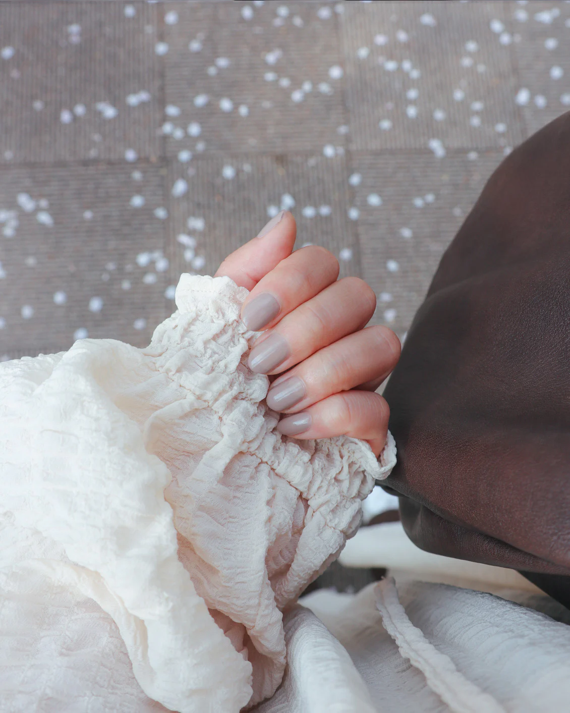 つけてみると、結構グレーがかったベージュに見えます。個人的にですが、ちょっぴり紫みも感じて、この絶妙な色味がたまらないんです。